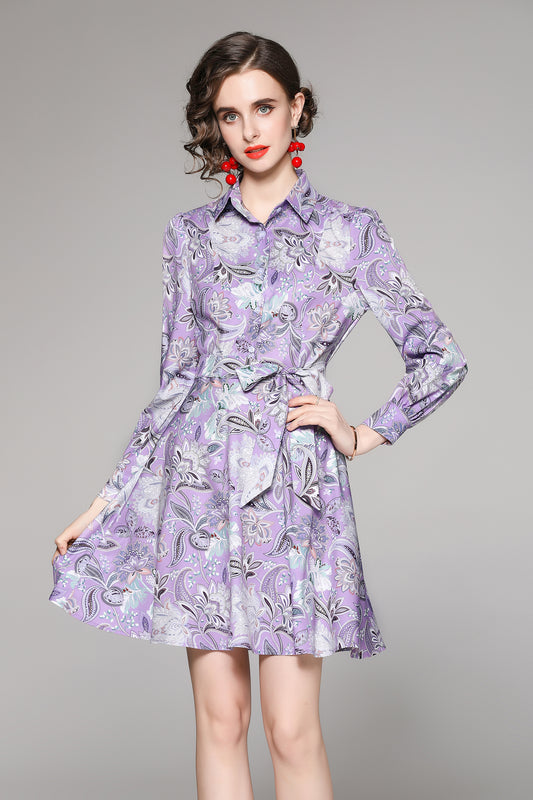 SSY-Women's Long Sleeve Lapel Collar Floral Mini Dress