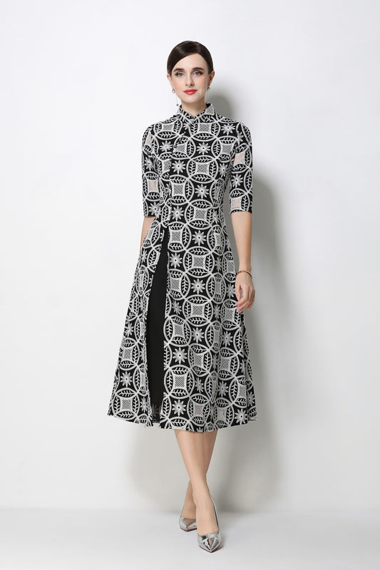 Elegant Embroidered Midi Dress with Mandarin Collar – Modern Qipao Style