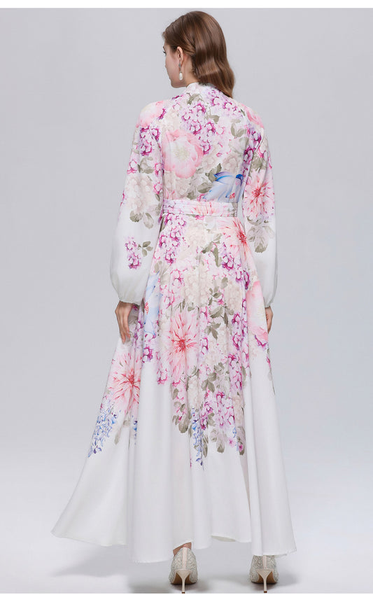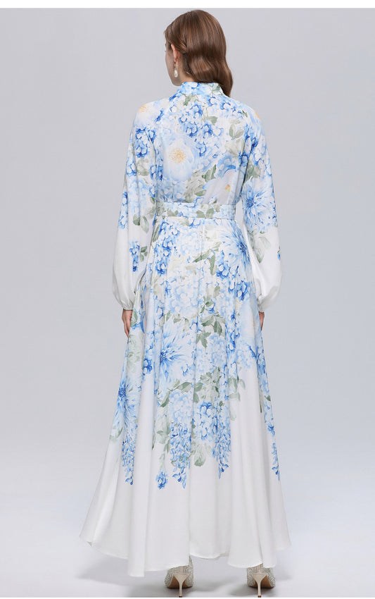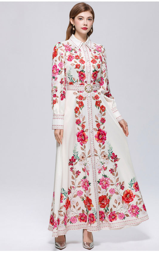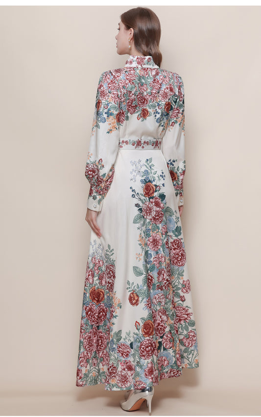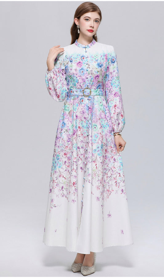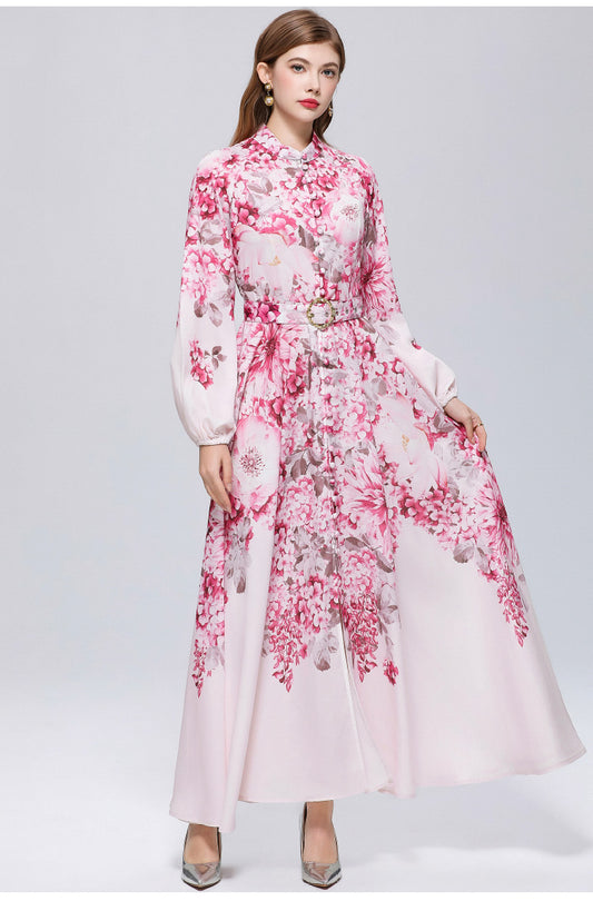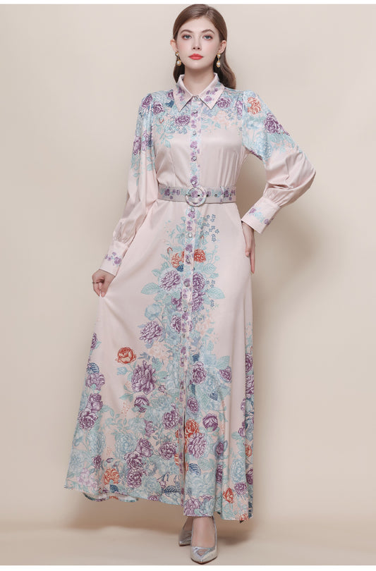 Women's Lantern Sleeve Floral Print Button Maxi Dress With Belts