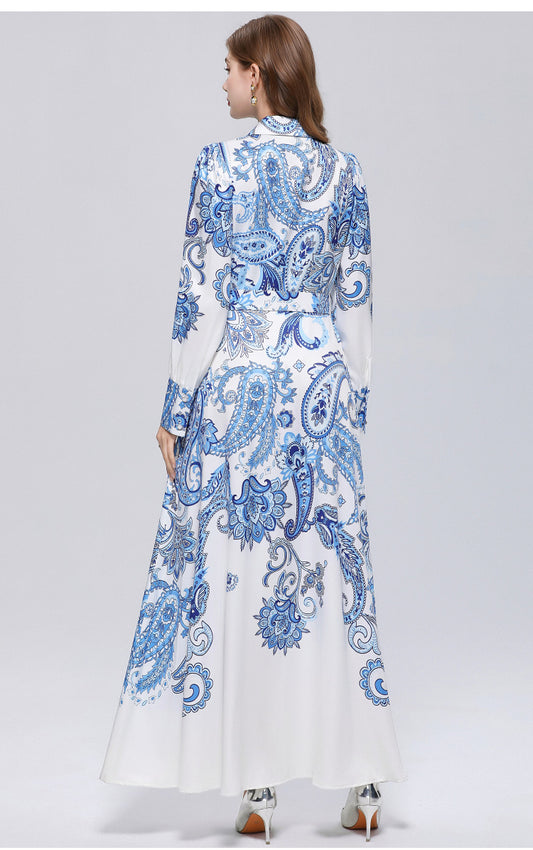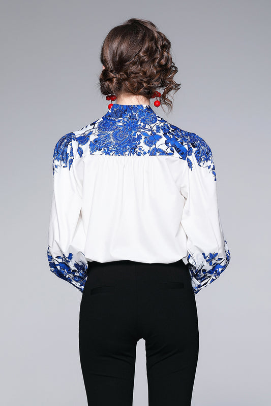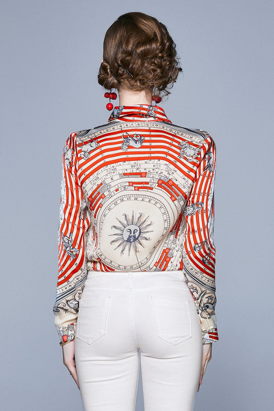 ESY-Women's Long Sleeve Lapel Collar Print Button Blouse