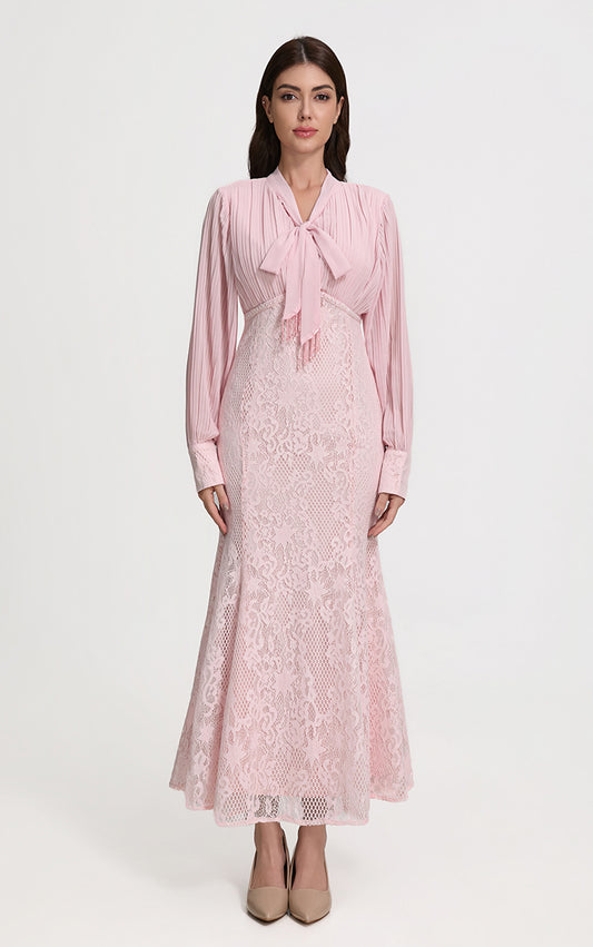 Elegant Pleated & Lace Midi Dress with Tie Neck, Beaded Details & Flounce Hem