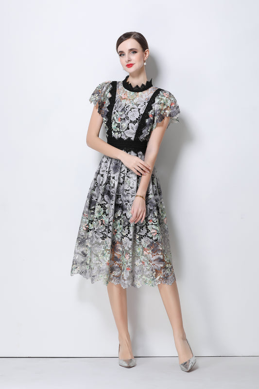 Lace-Embroidered Crochet Midi Dress