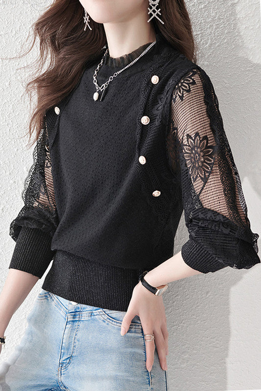 Women's Sweater Puff Sleeve Patchwork Lace Tops