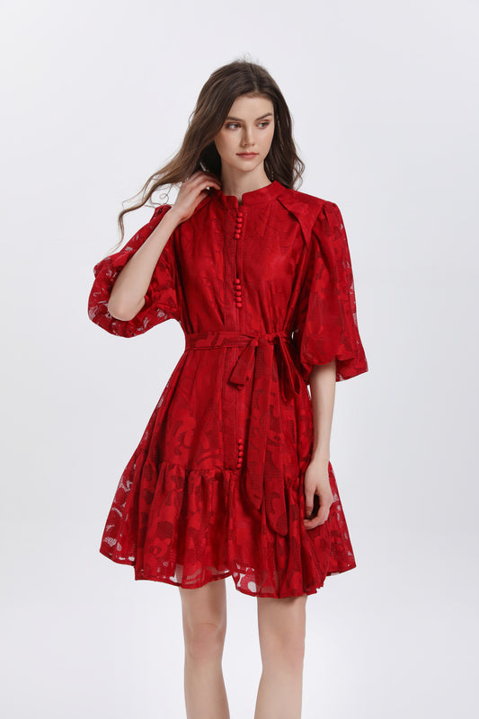 Elegant Loose Lace Mini Dress with Front Button Closure & Ruffle Hem