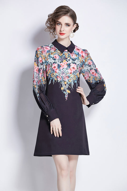 SSY-Women's Long Sleeve Lapel Collar Floral Mini Dress