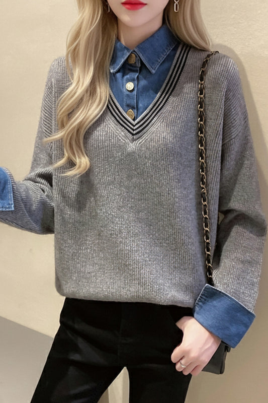 Women's Long Sleeve Sweater Denim Patchwork Outfits