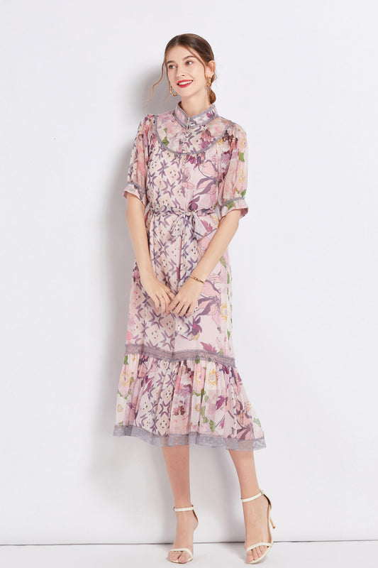 FSY-Women's Chiffon Short Sleeve Floral Ruffle Loose Midi Dress
