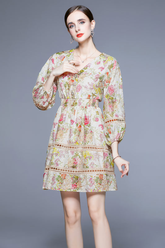 SSY-Women's V-Neck Floral Elastic Waist Button Mini Dress