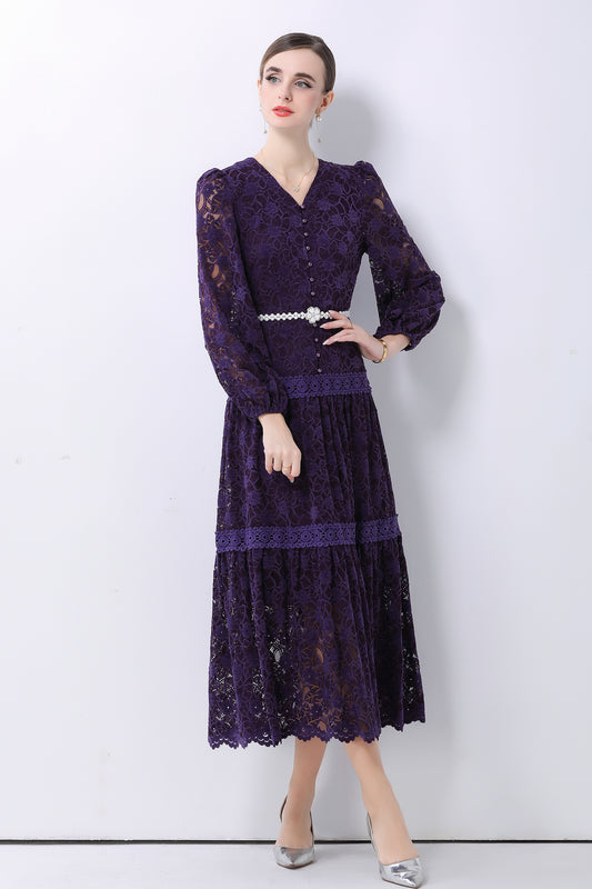 Women's V-Neck Puff Sleeves Button Lace Midi Dress