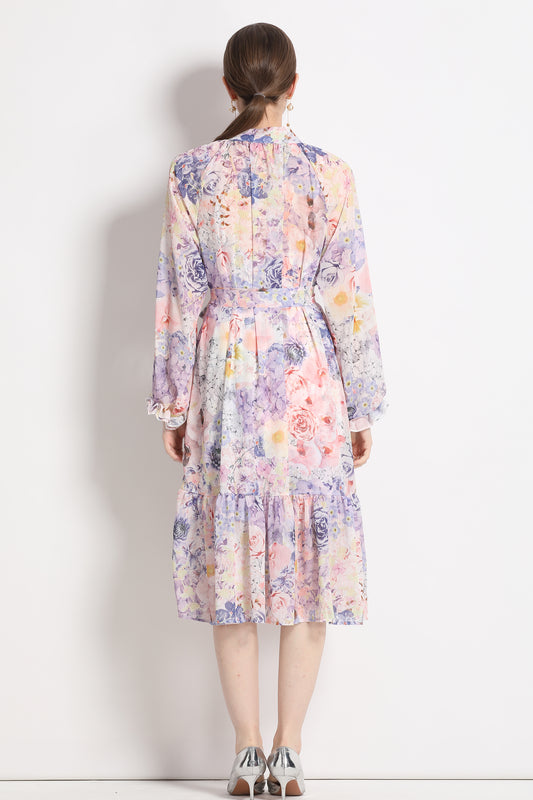 FSY-Women's Floral Puff Sleeve Button Loose Ruffle Midi Dress