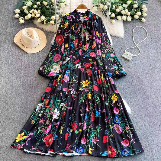 Tie Neck Floral Print Lantern Sleeves Button Loose Dress