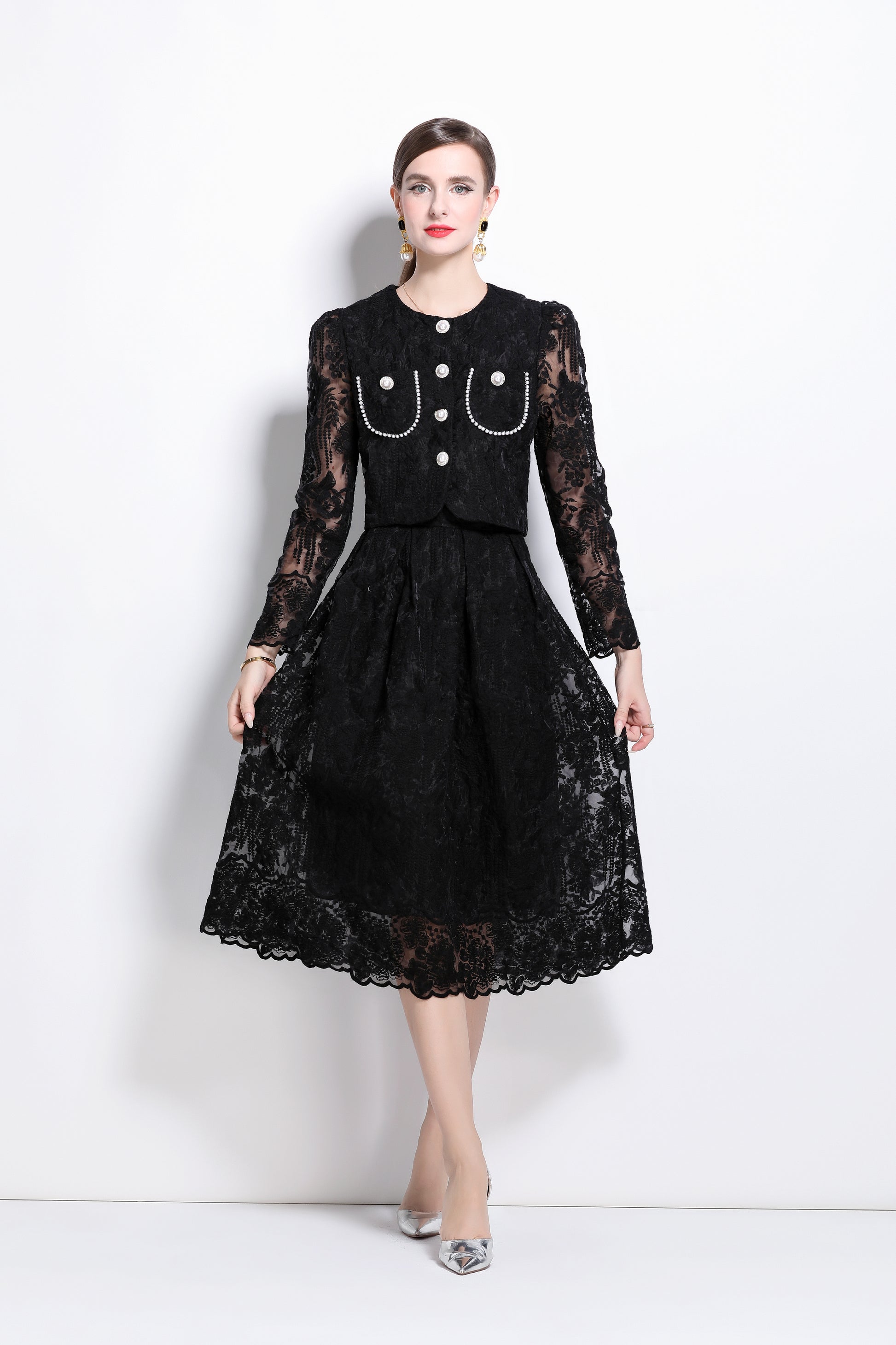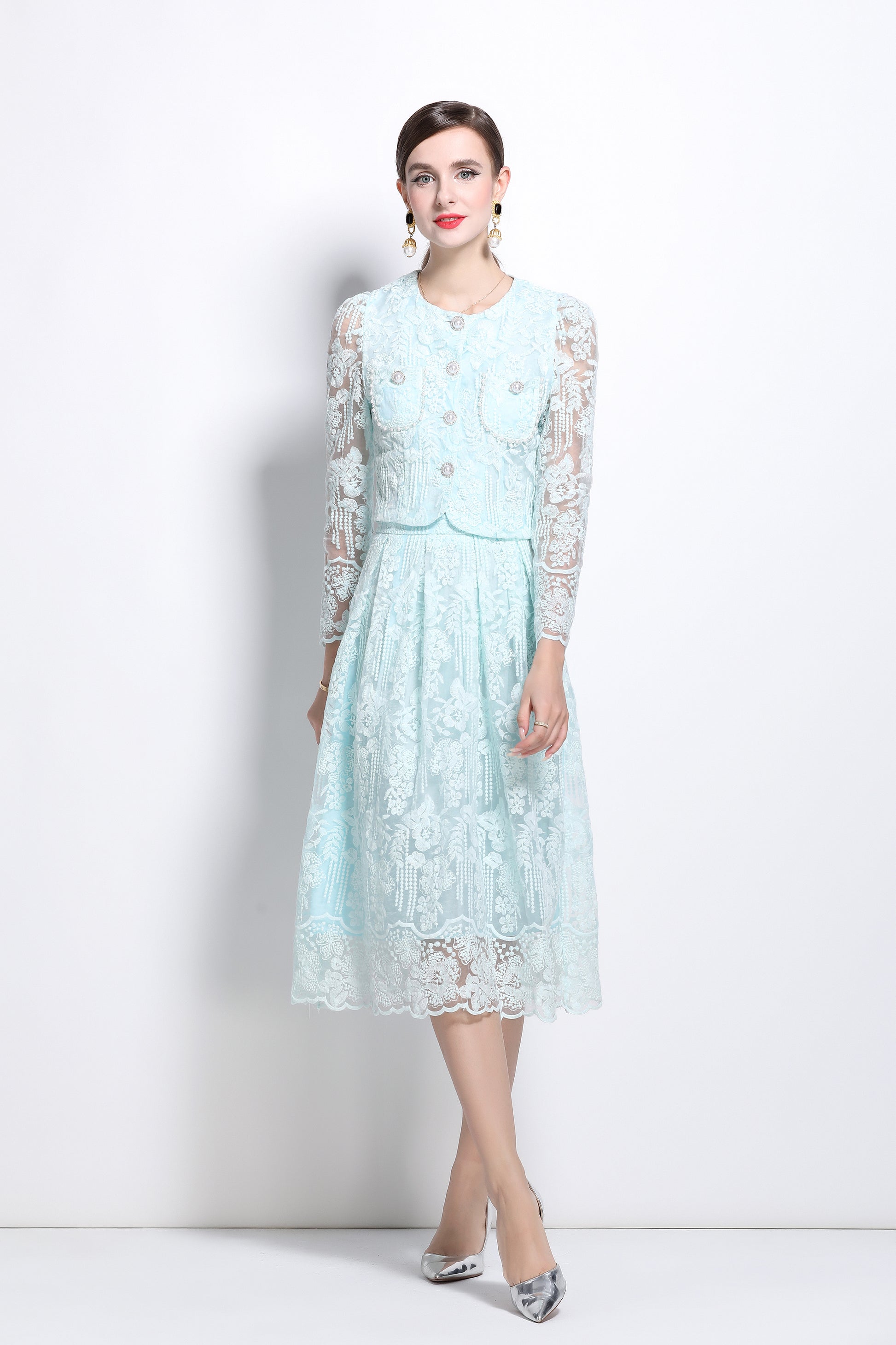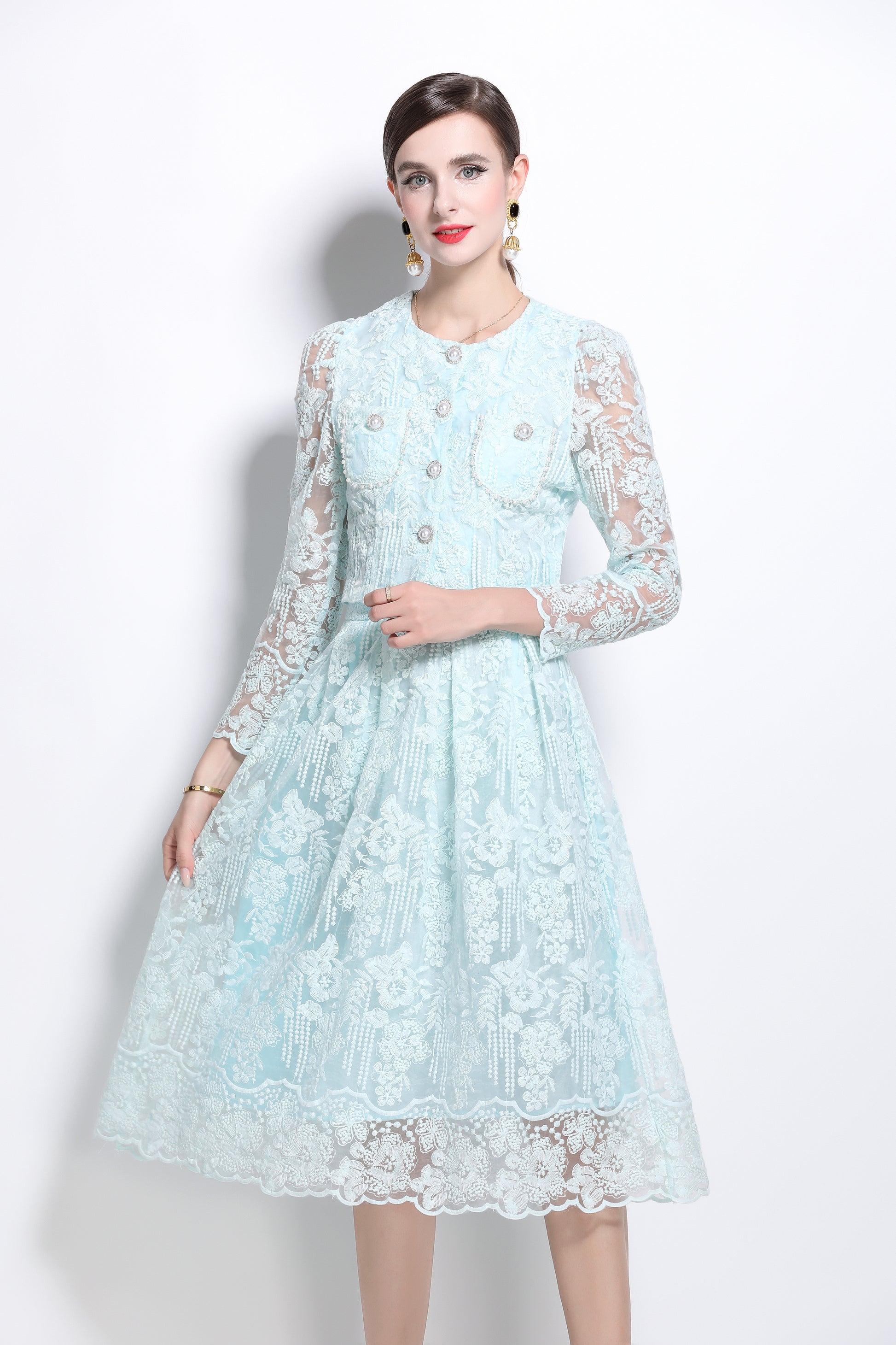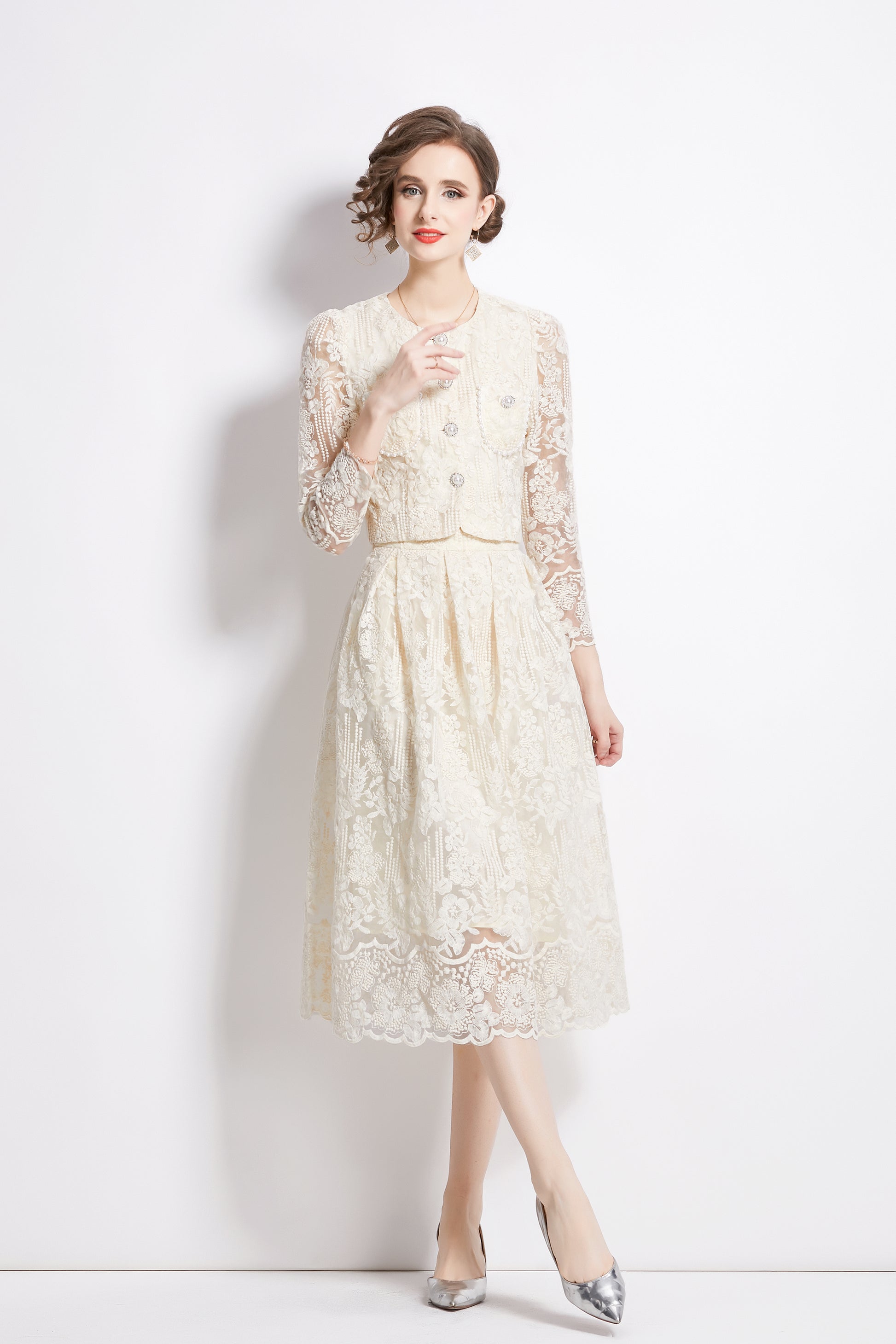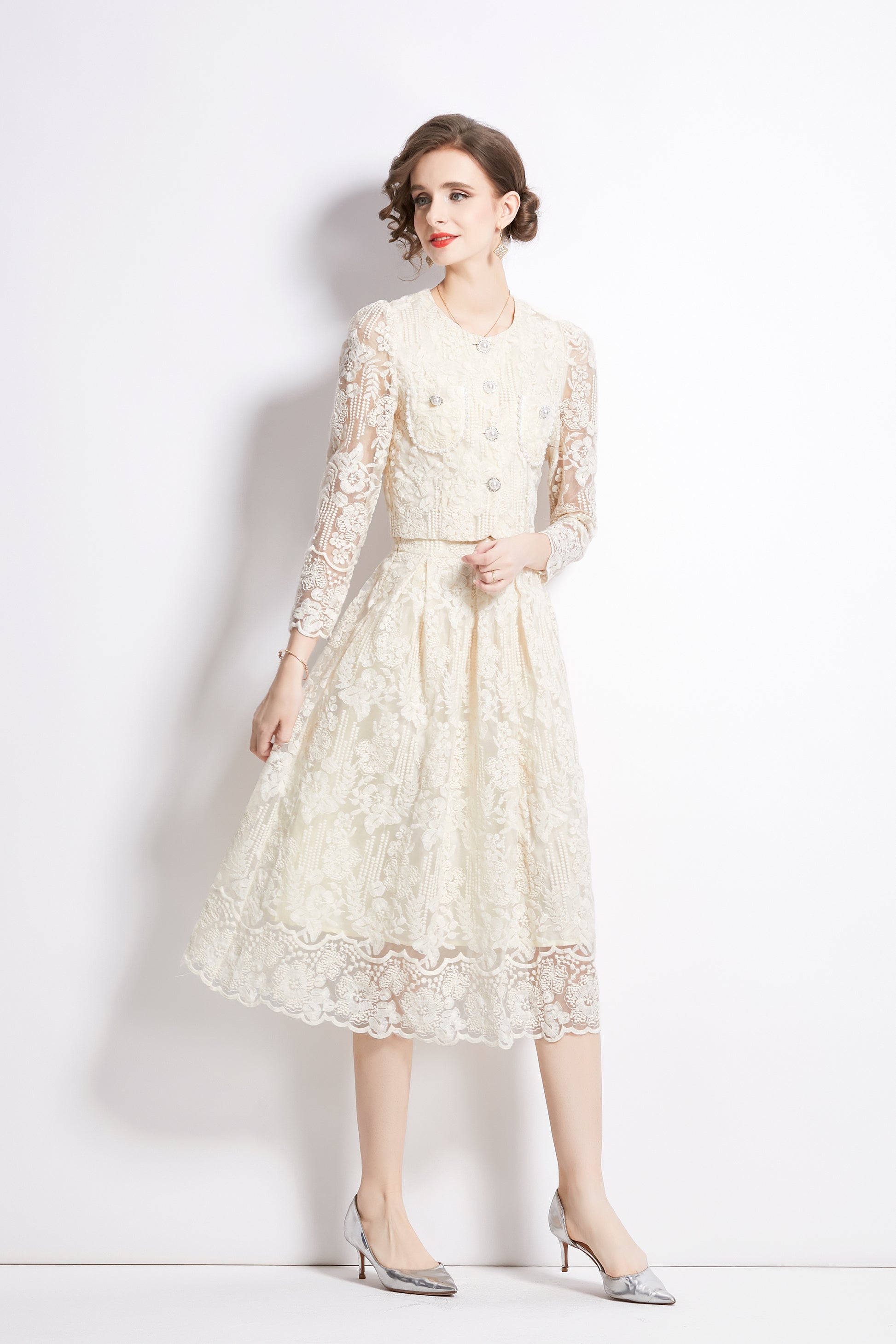 Feature:Two-piece set with lining. Top sleeves in tulle with floral print,two decorative pockets, shiny buttons, and a flowing skirt that goes just past the knee.