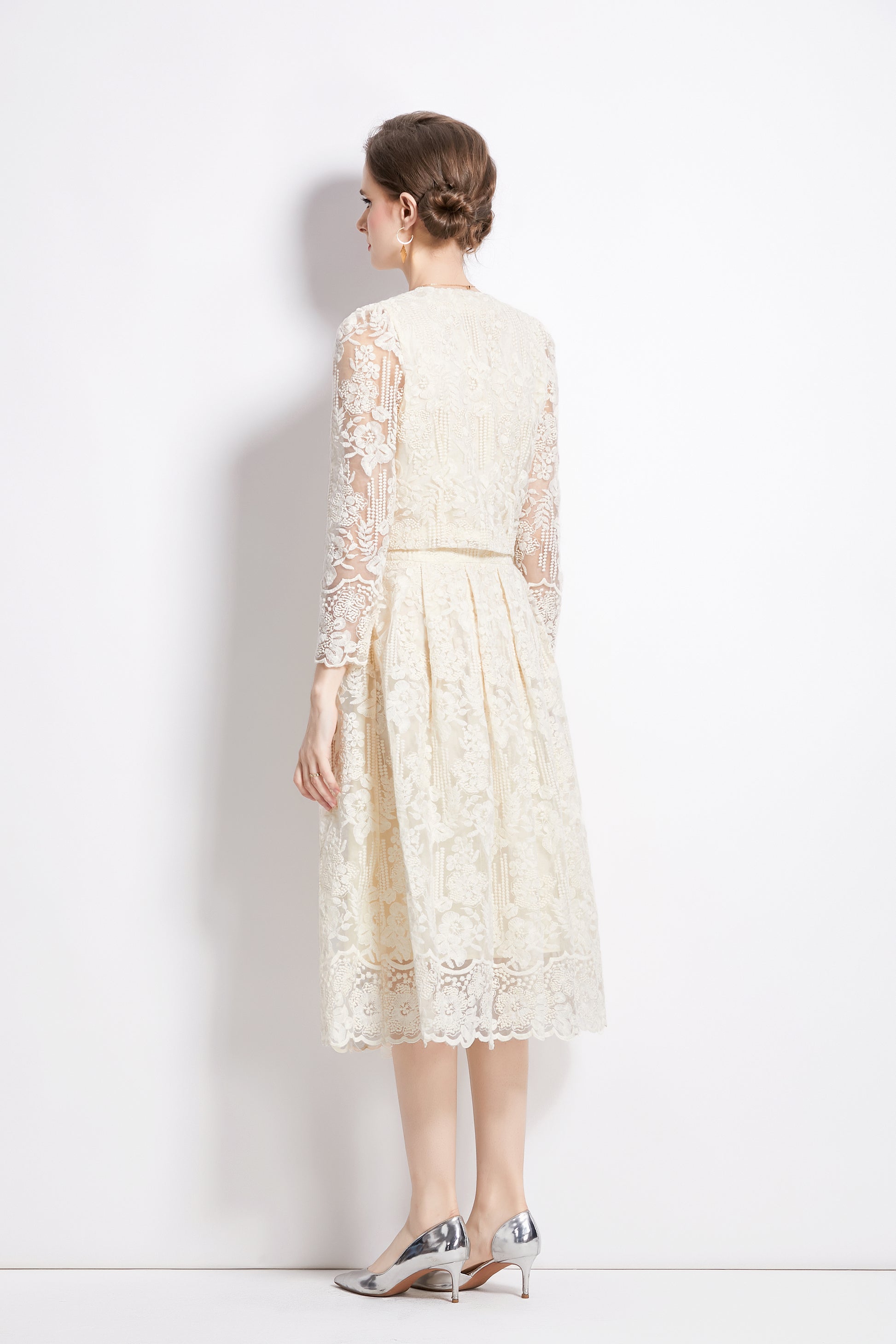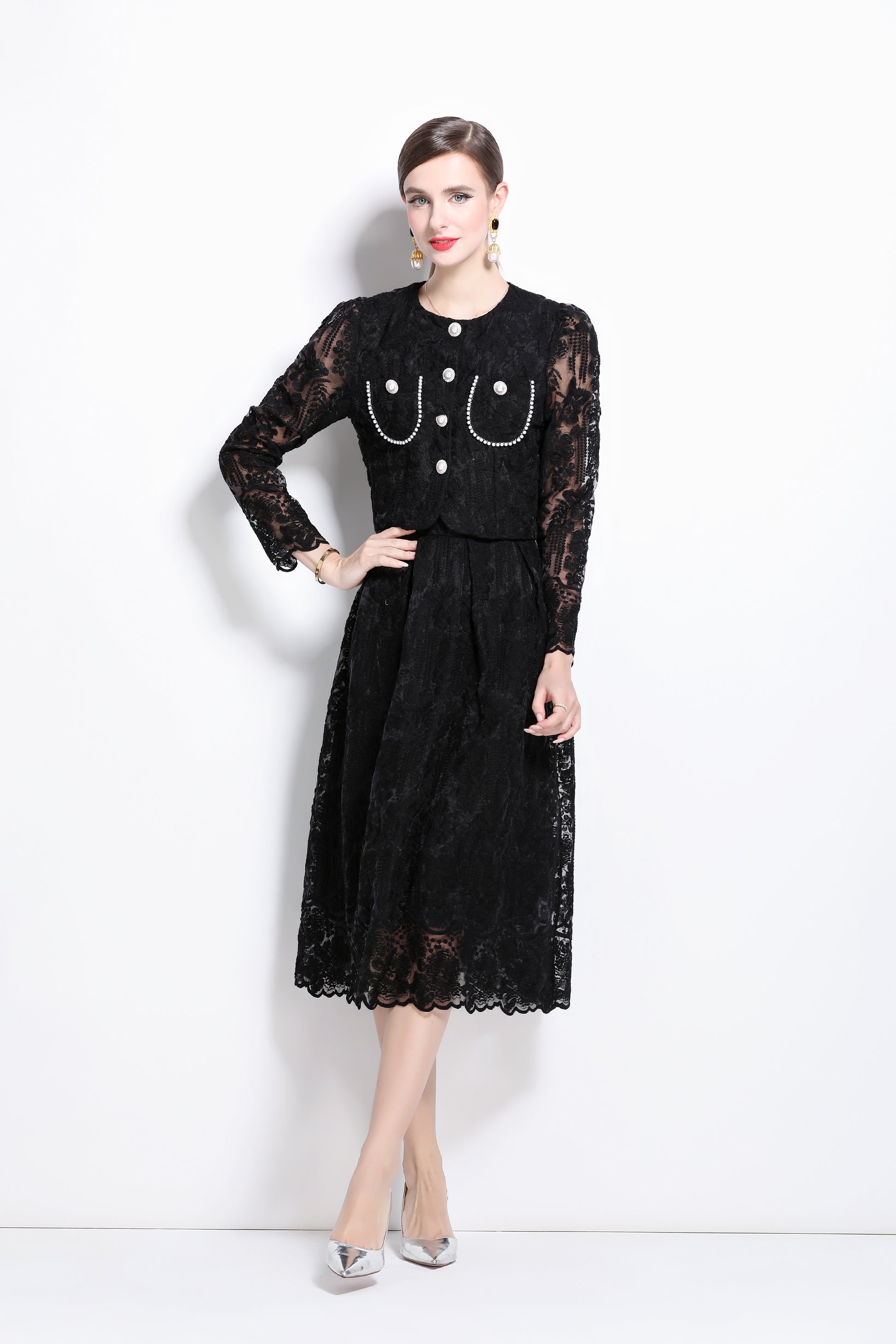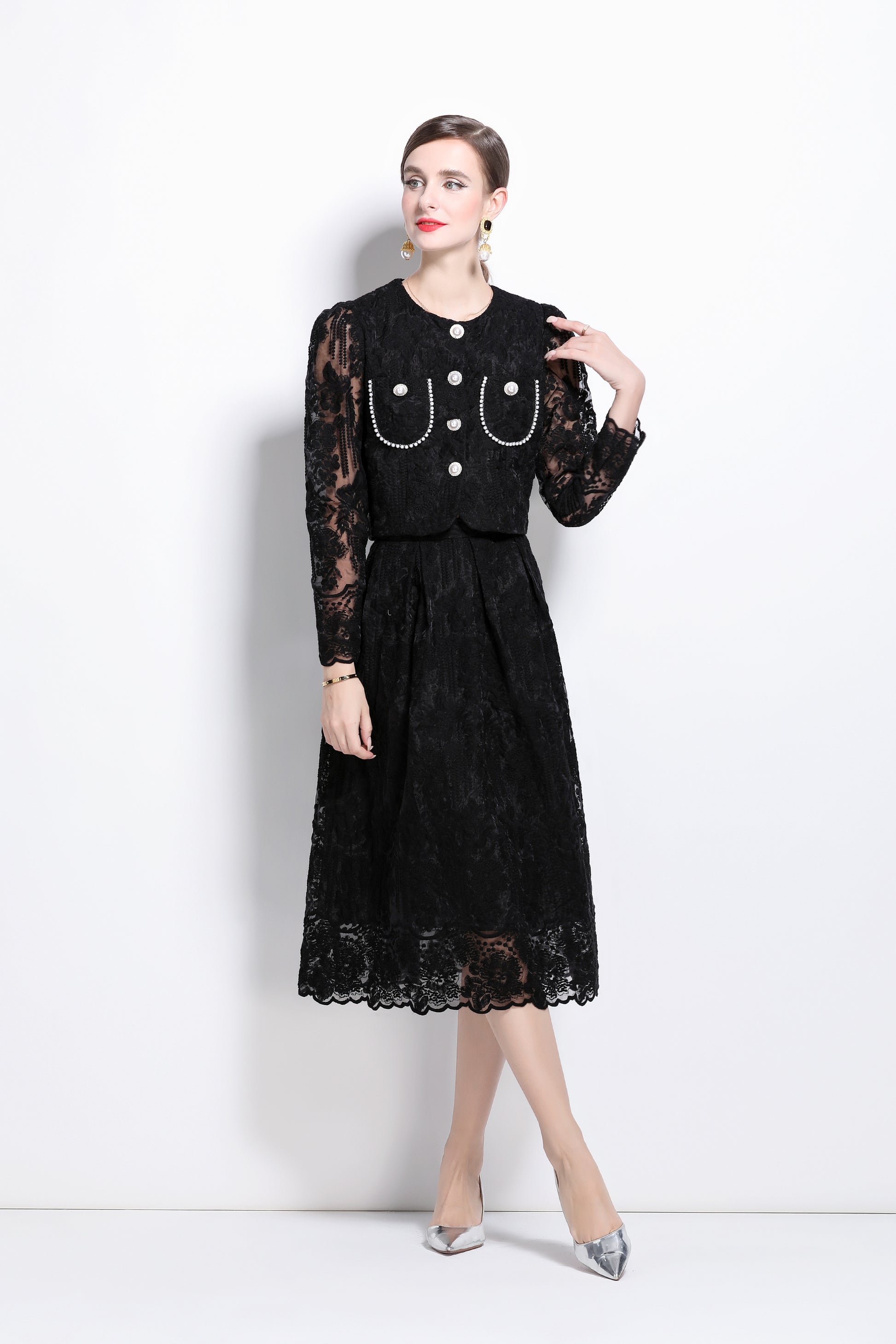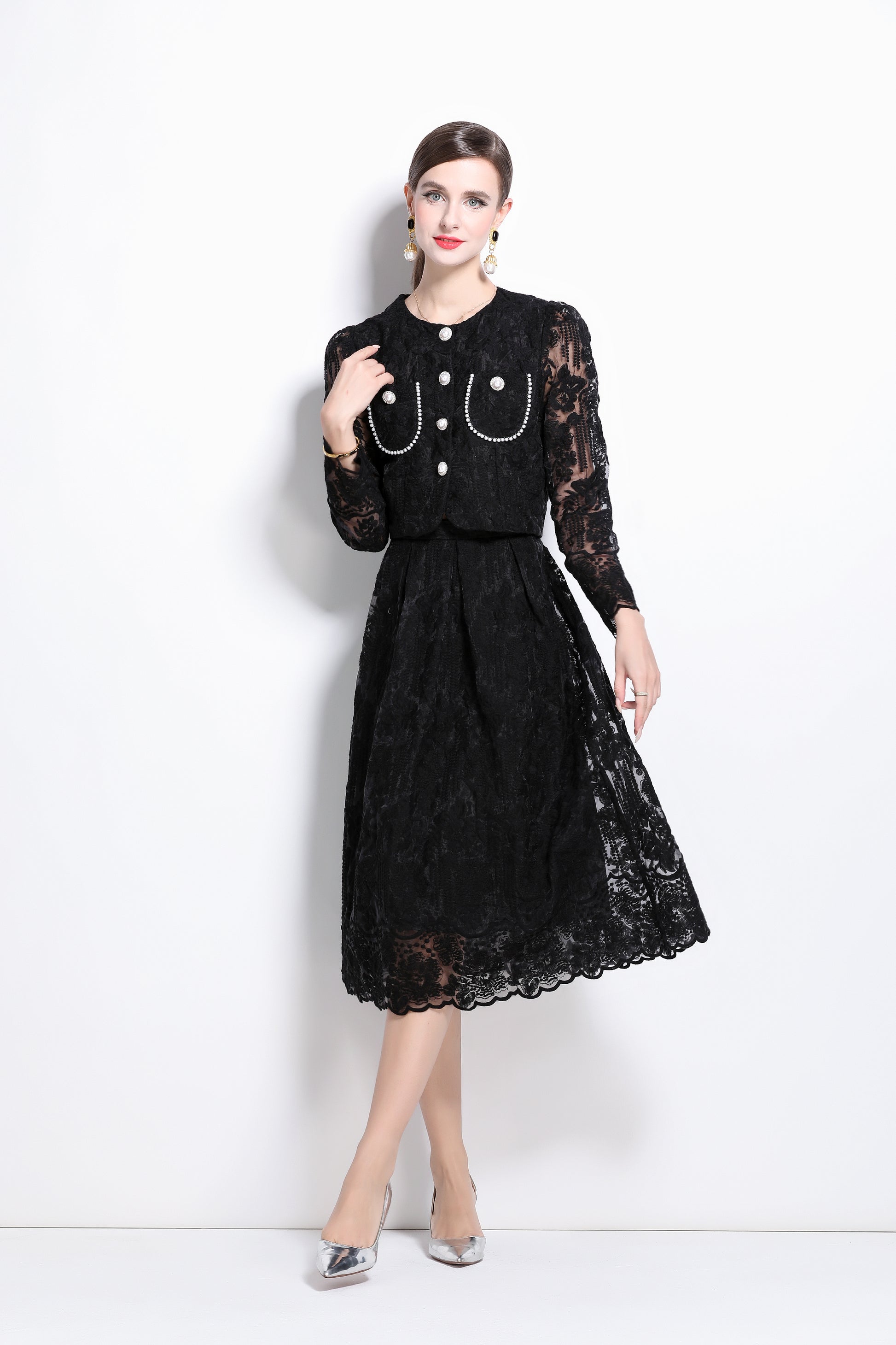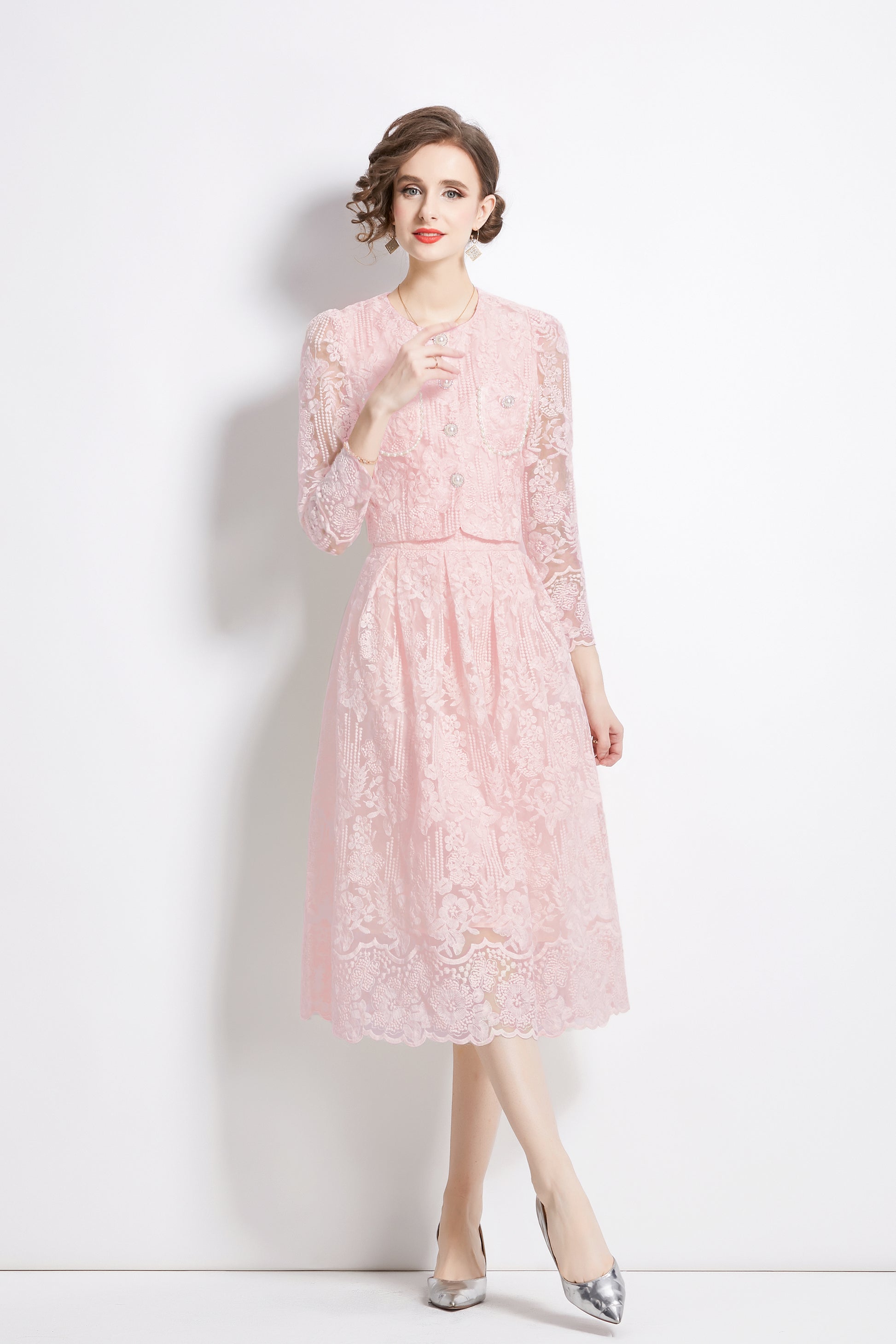 Feature:Two-piece set with lining. Top sleeves in tulle with floral print,two decorative pockets, shiny buttons, and a flowing skirt that goes just past the knee.