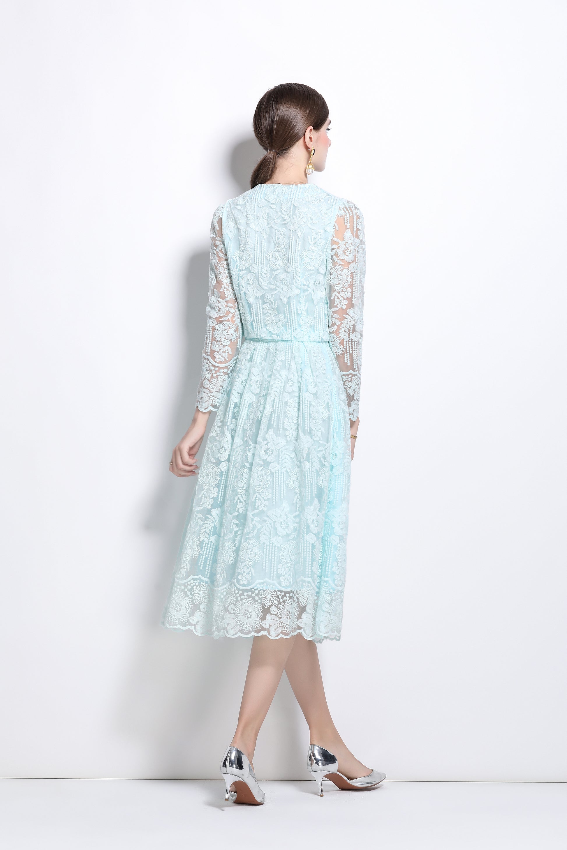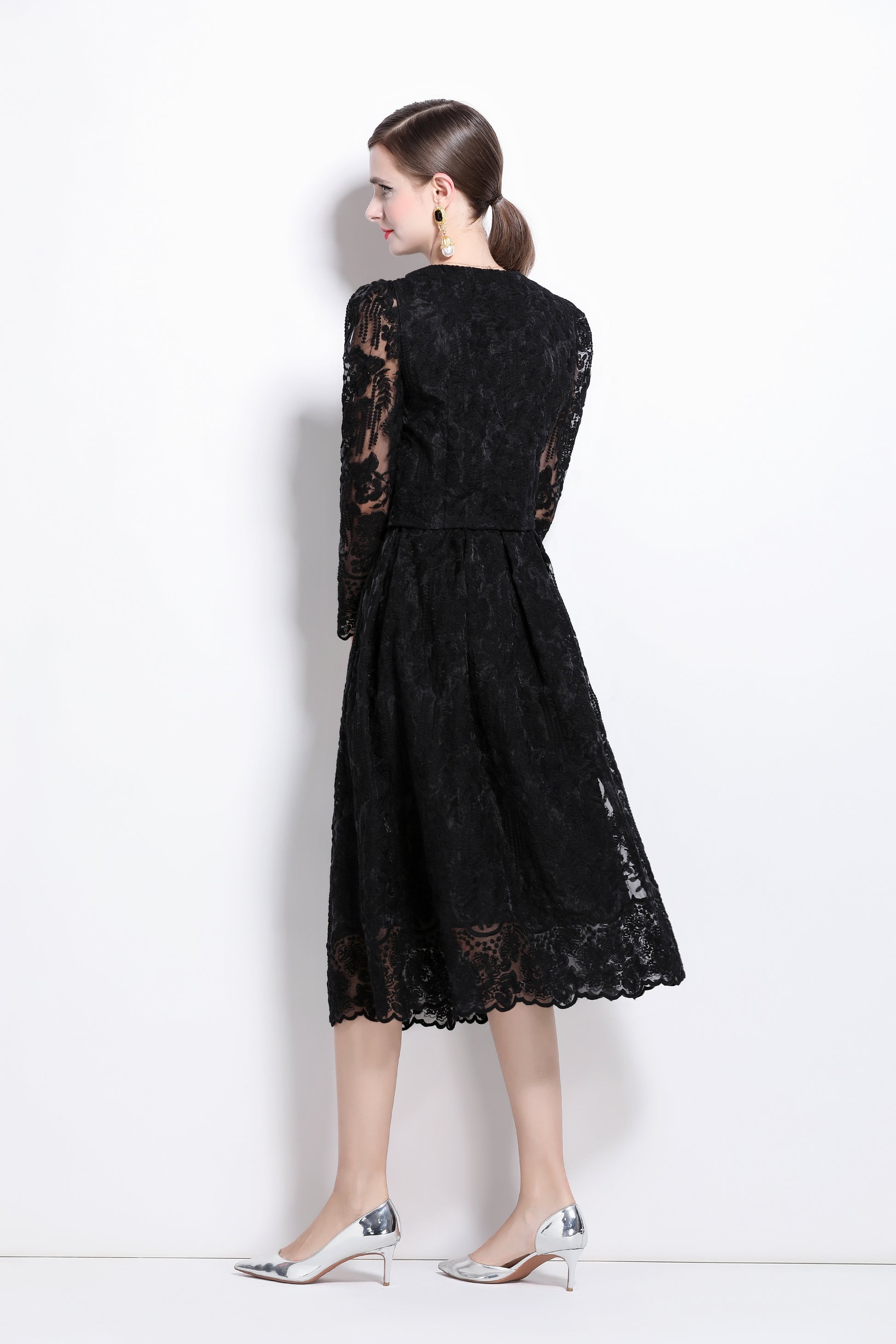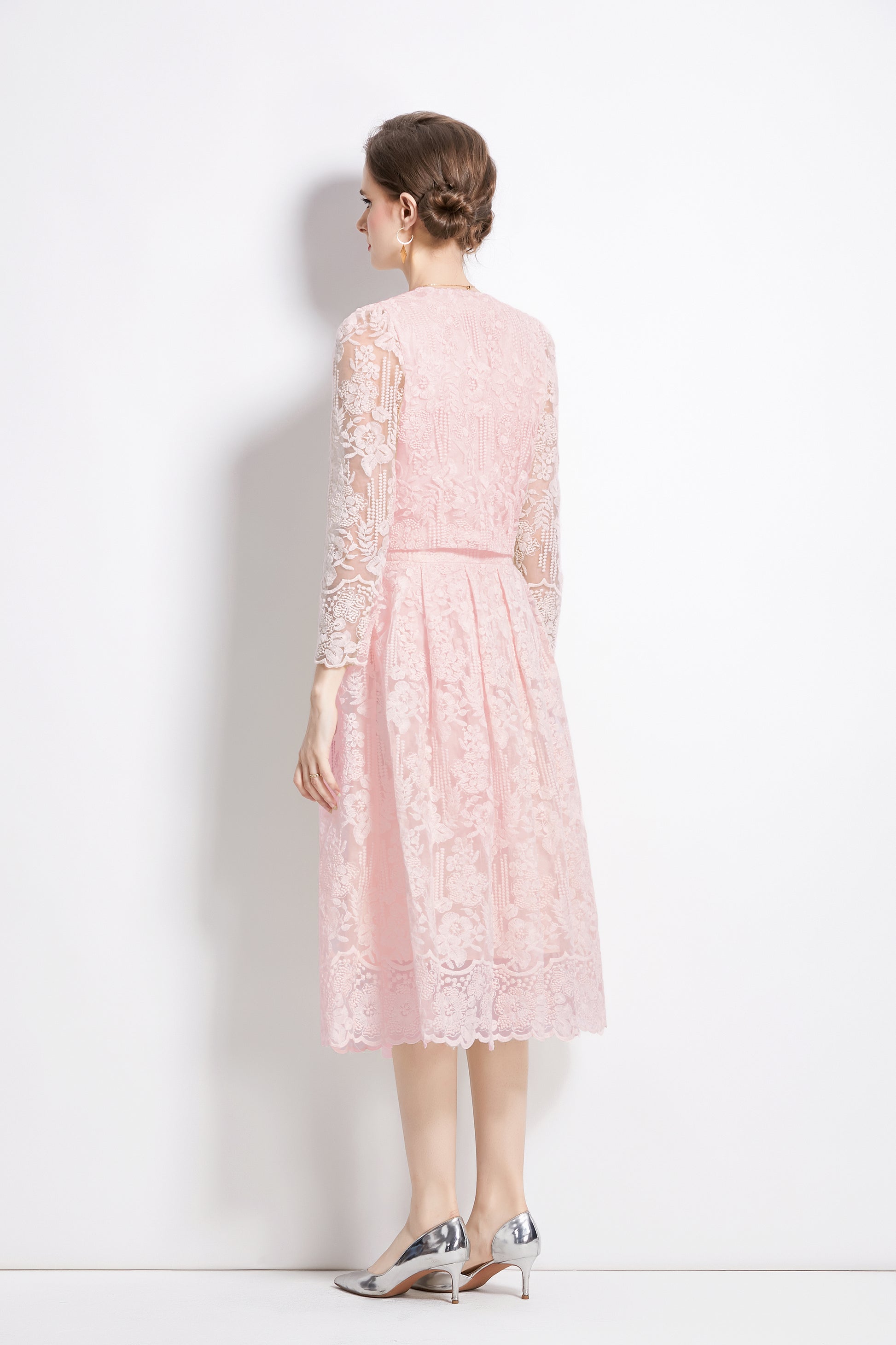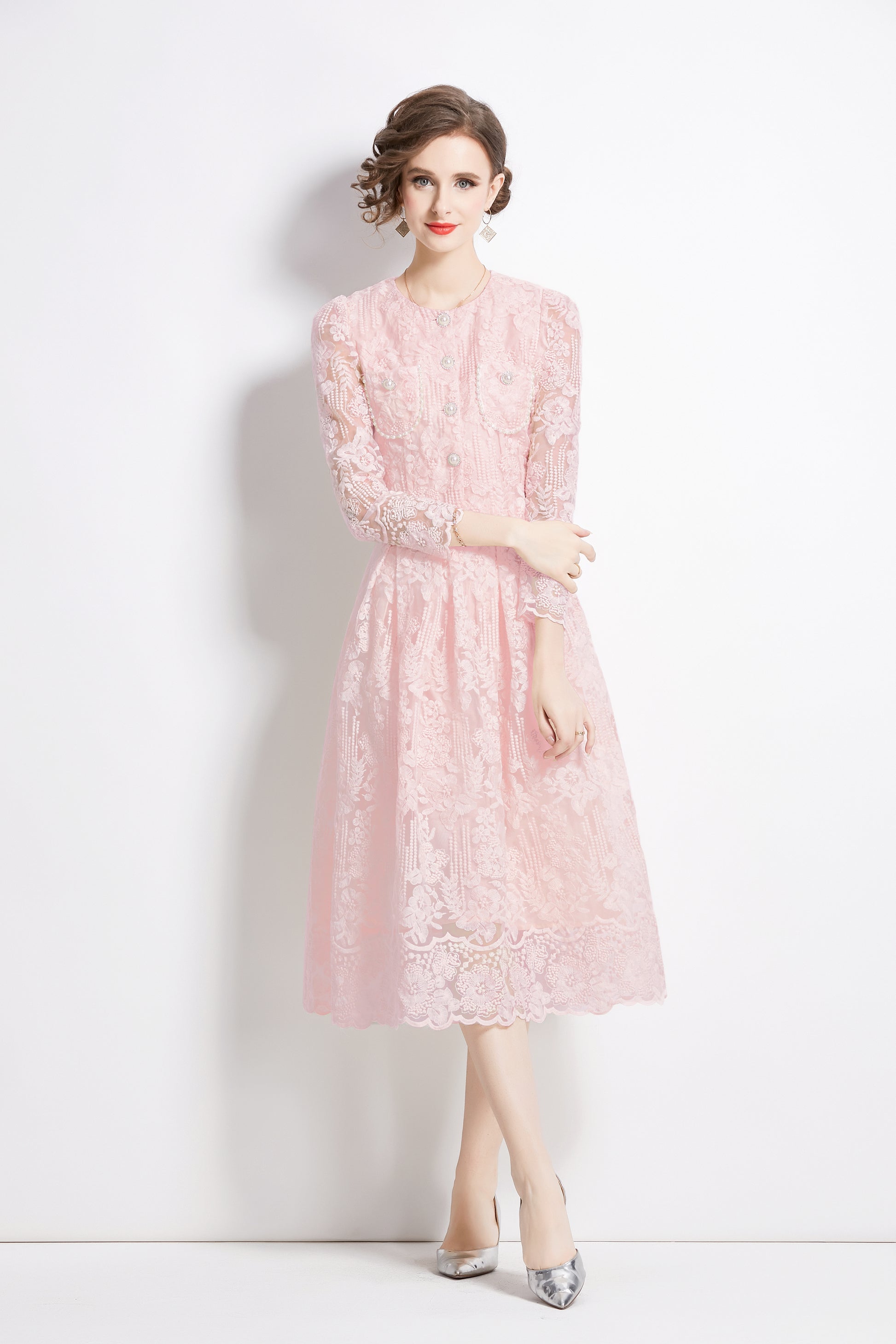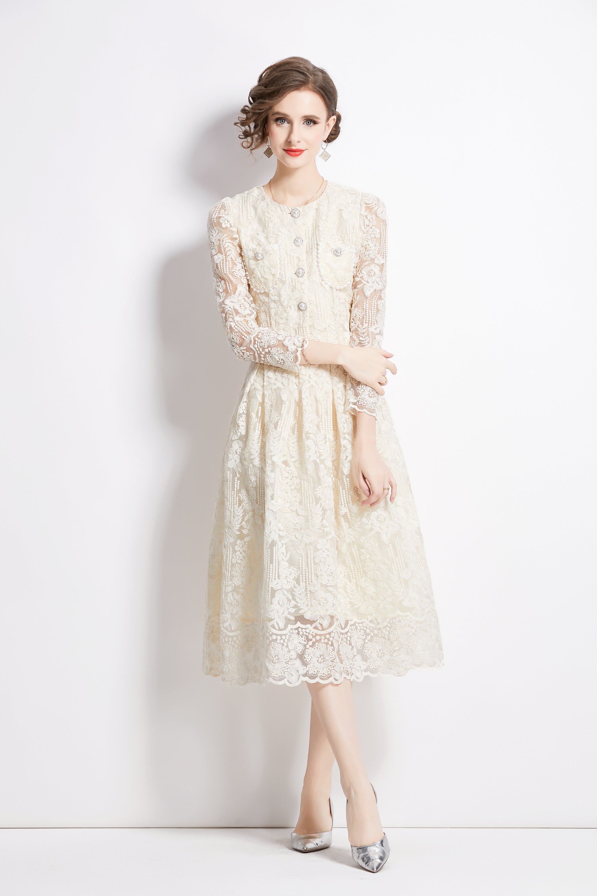 Feature:Two-piece set with lining. Top sleeves in tulle with floral print,two decorative pockets, shiny buttons, and a flowing skirt that goes just past the knee.