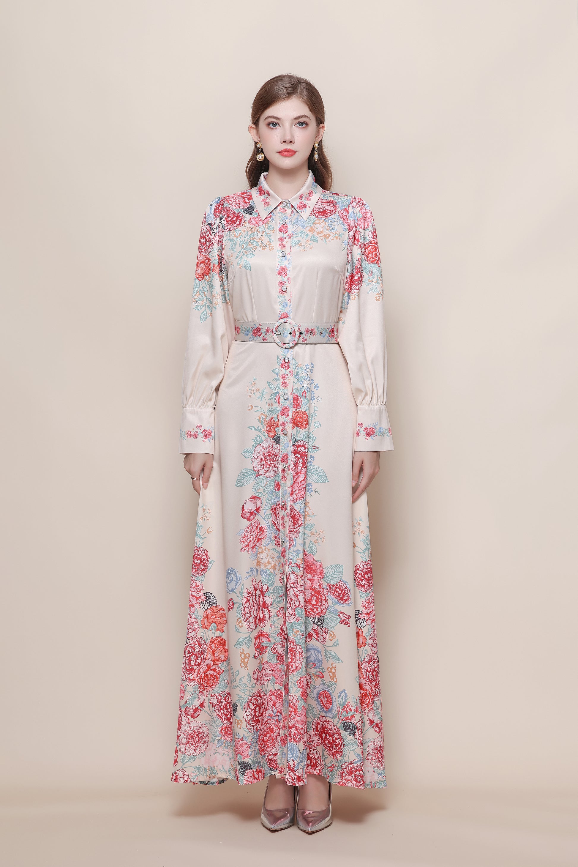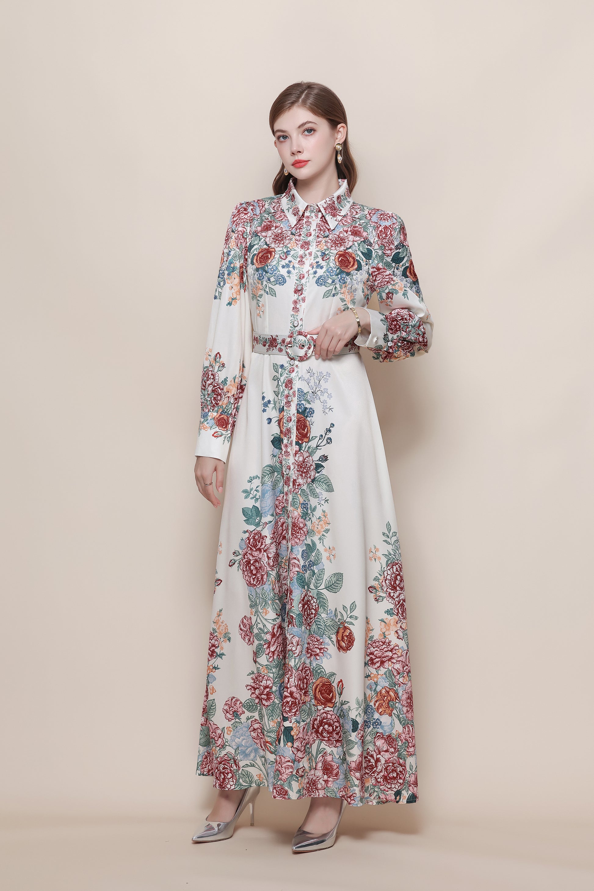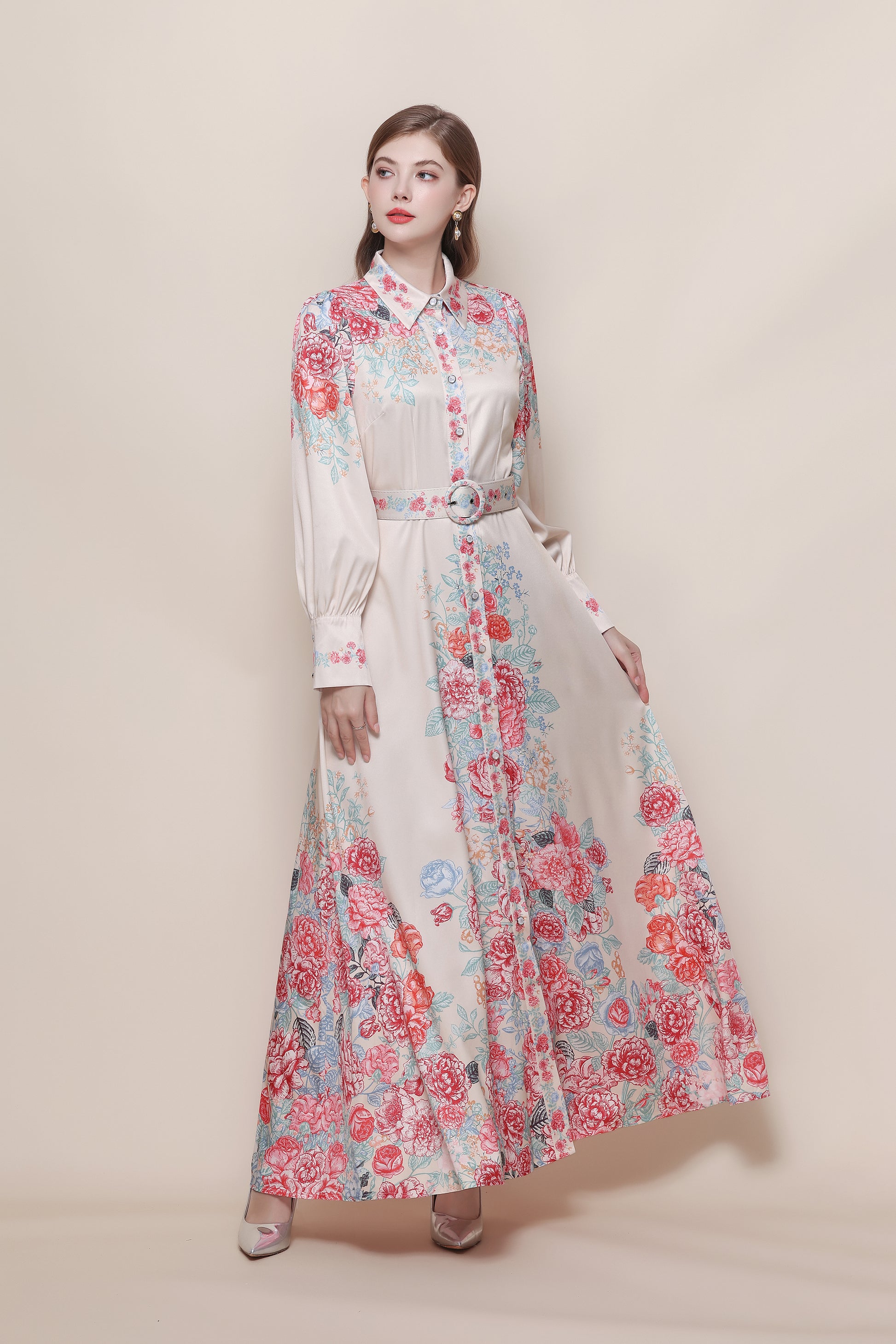 - Features:Collared neckline,With belt,Long Sleeve,Maxi length,Floral print,A-line,Button front fastening. It's long and flowy,high leg slit to still feel breezy and sexy.