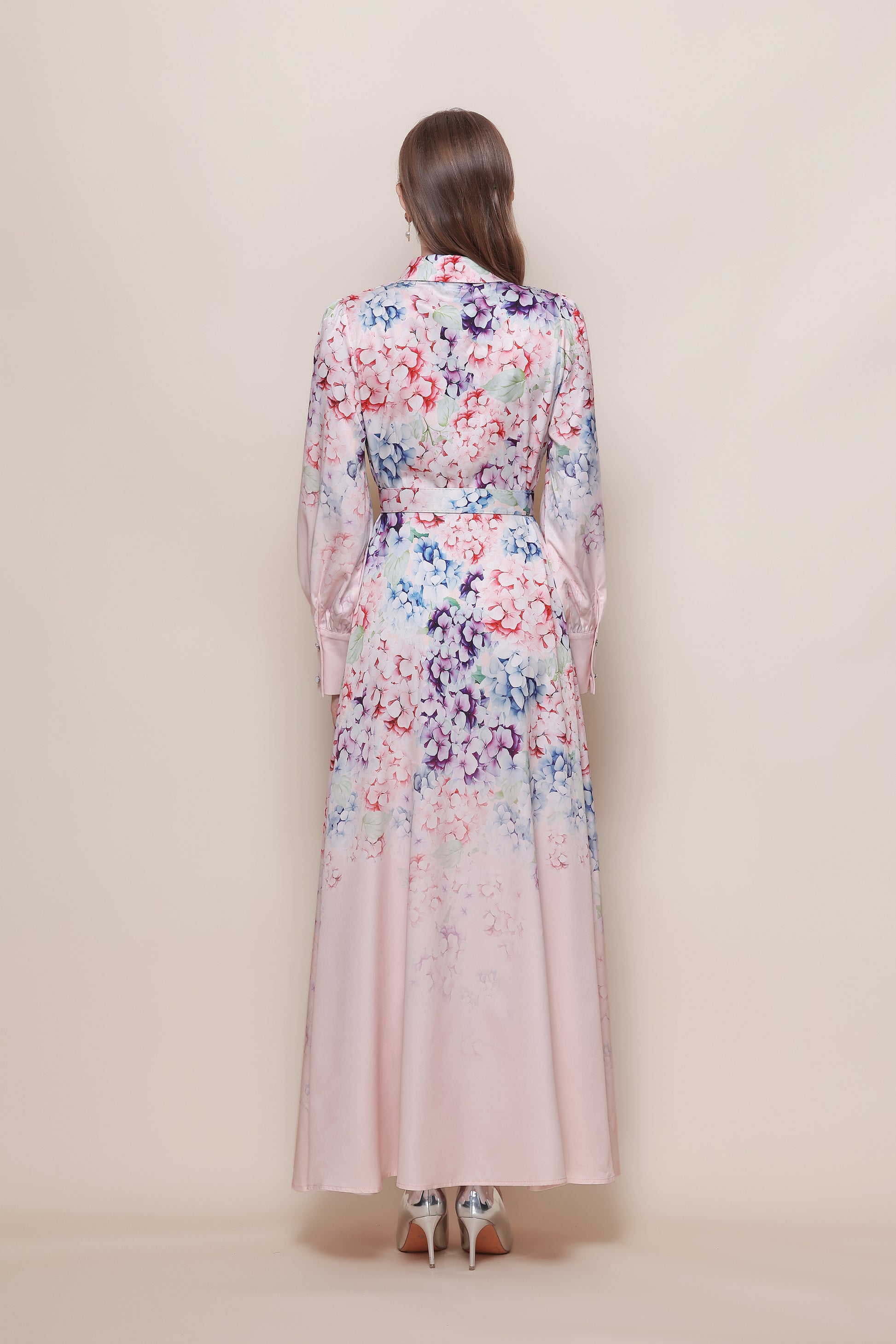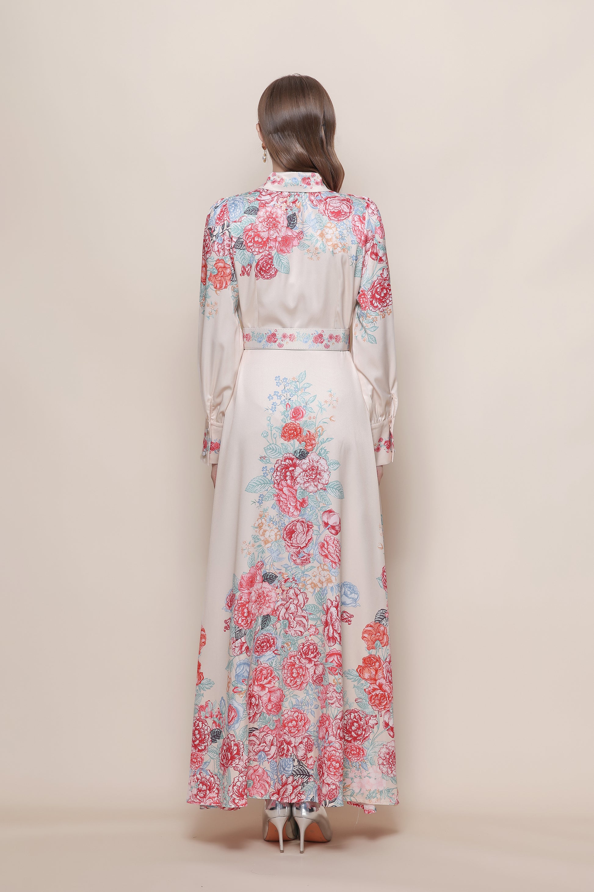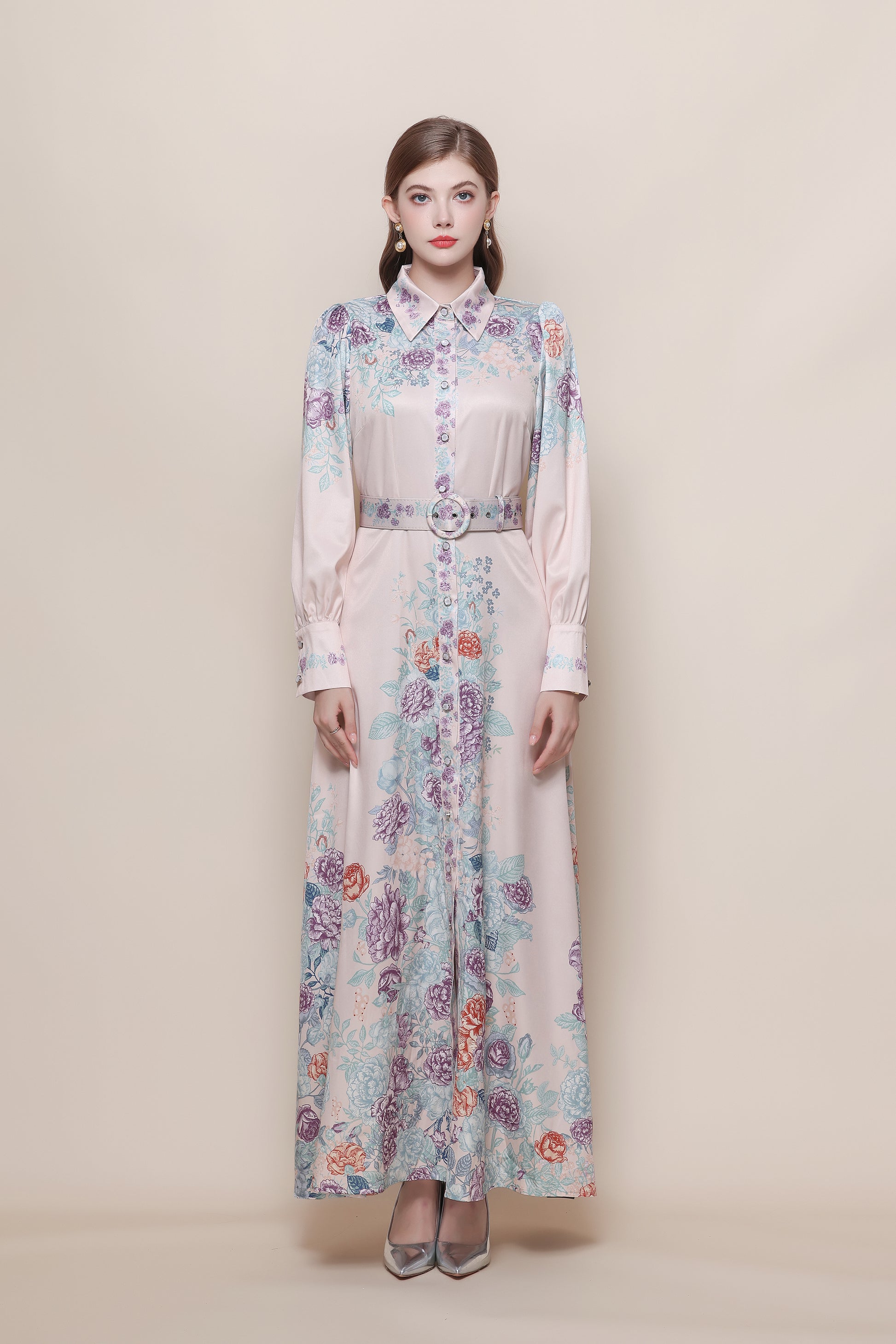 - Features:Collared neckline,With belt,Long Sleeve,Maxi length,Floral print,A-line,Button front fastening. It's long and flowy,high leg slit to still feel breezy and sexy.