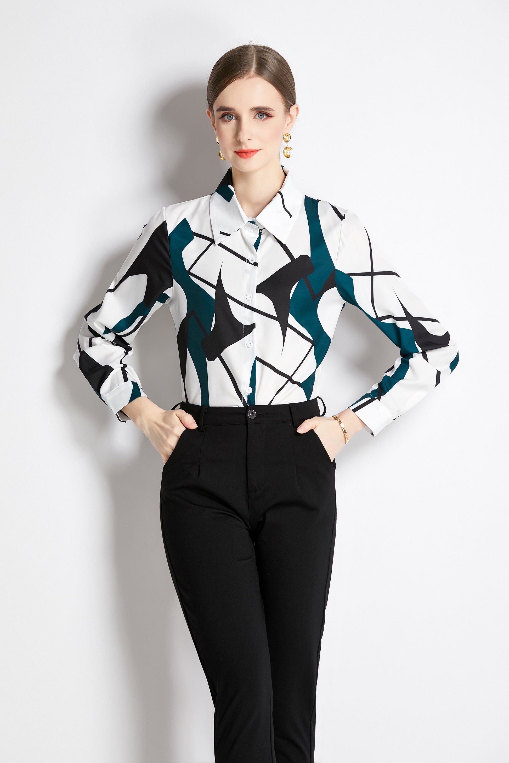 ESY-Women's Long Sleeve Lapel Collar Print Button Blouse