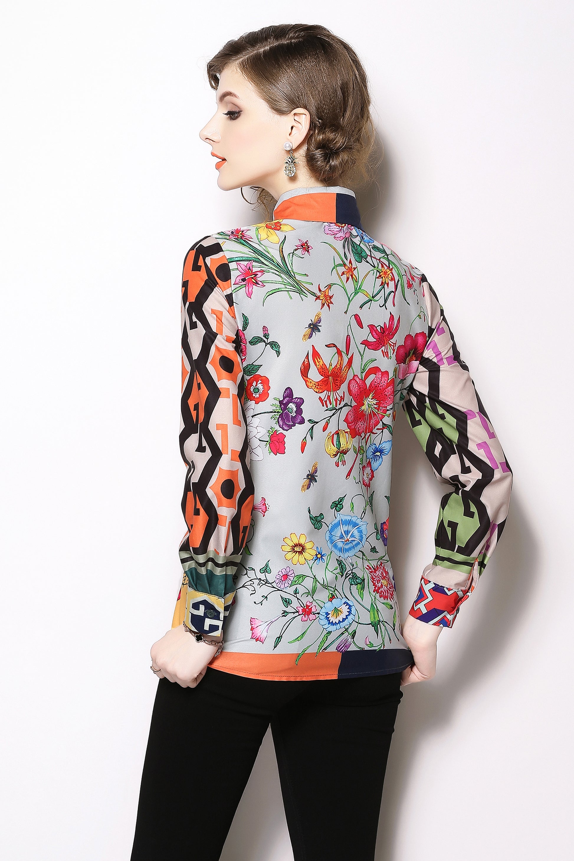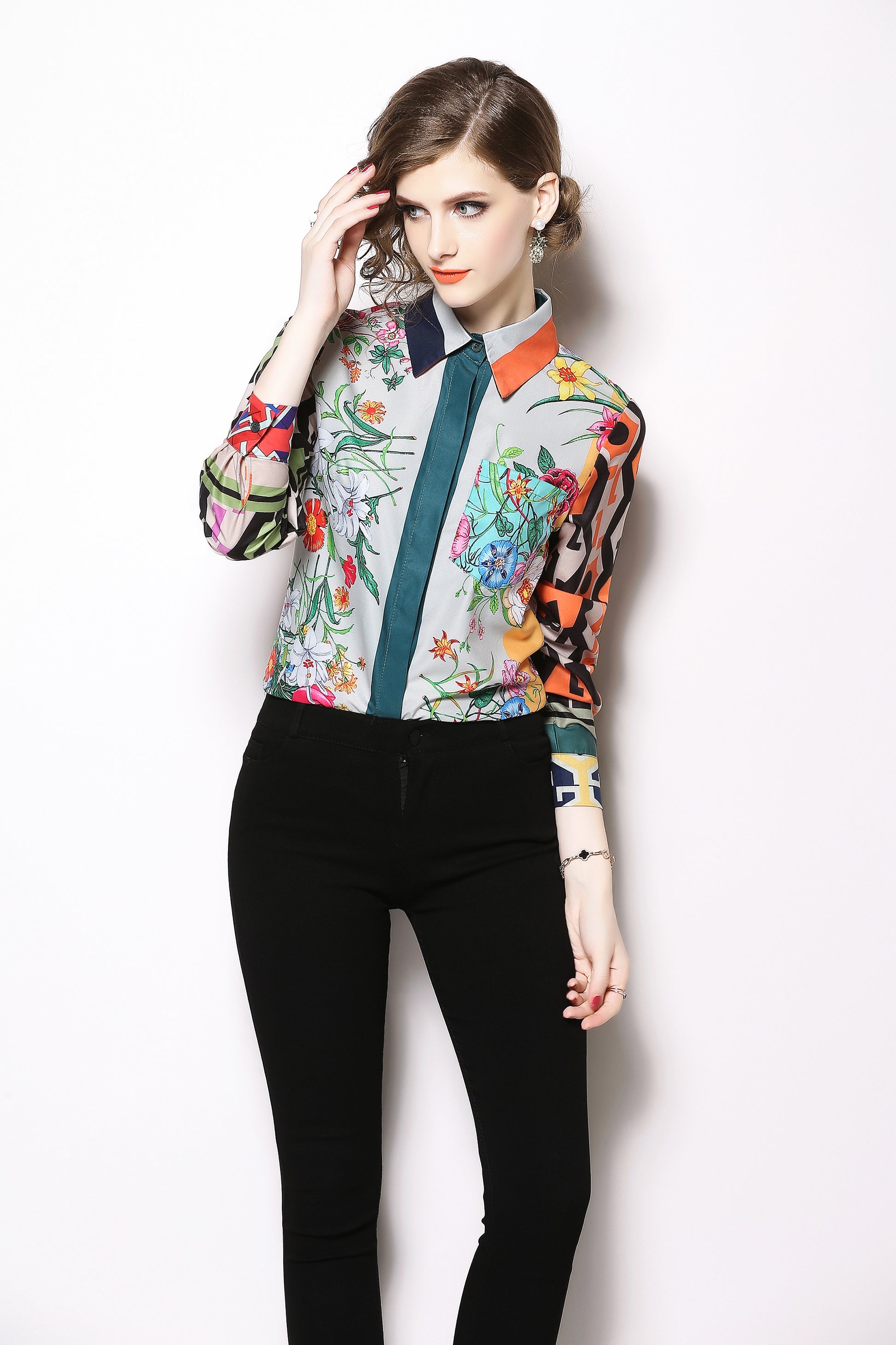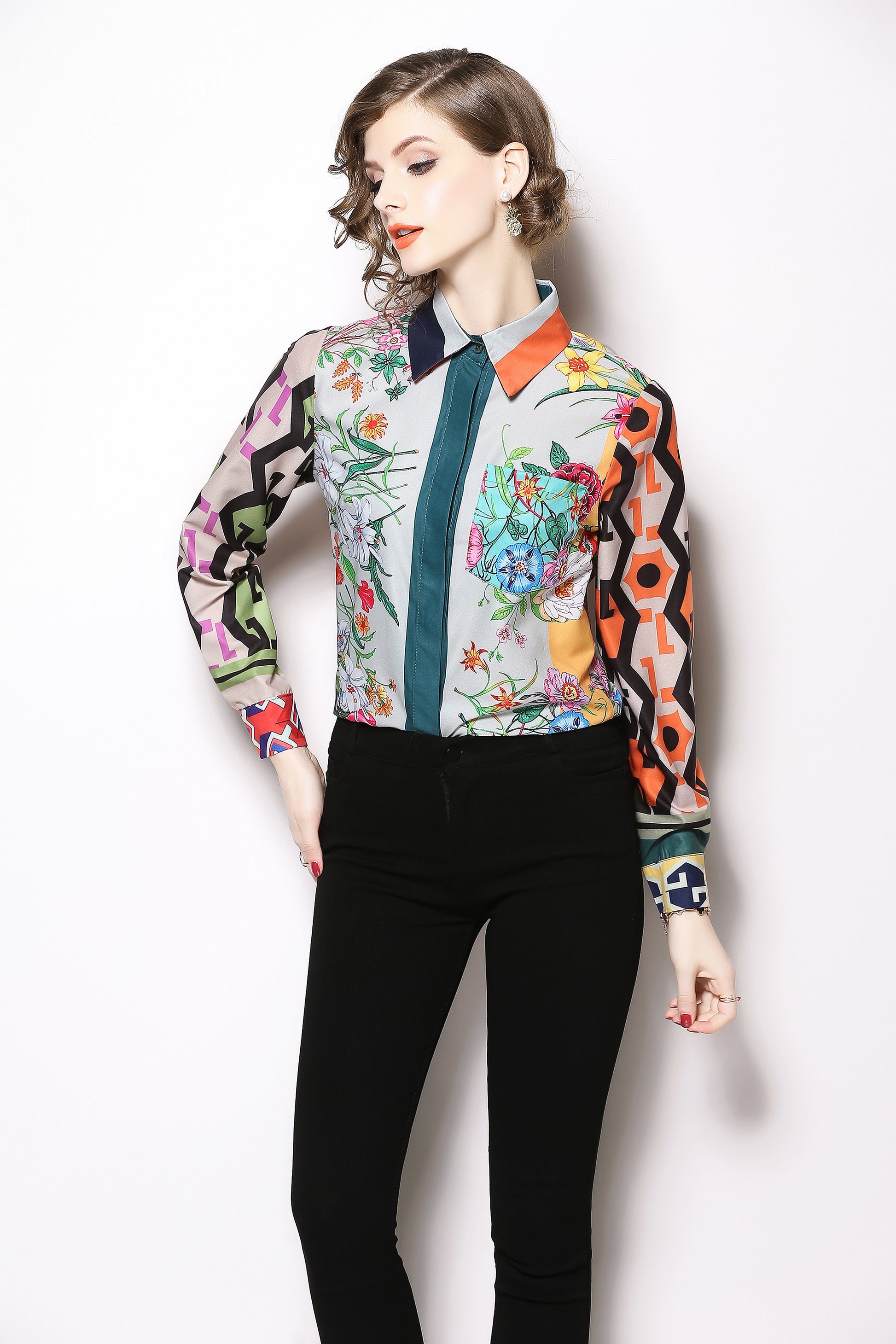 ESY-Women's Shirt Print Long Sleeve Button Blouse
