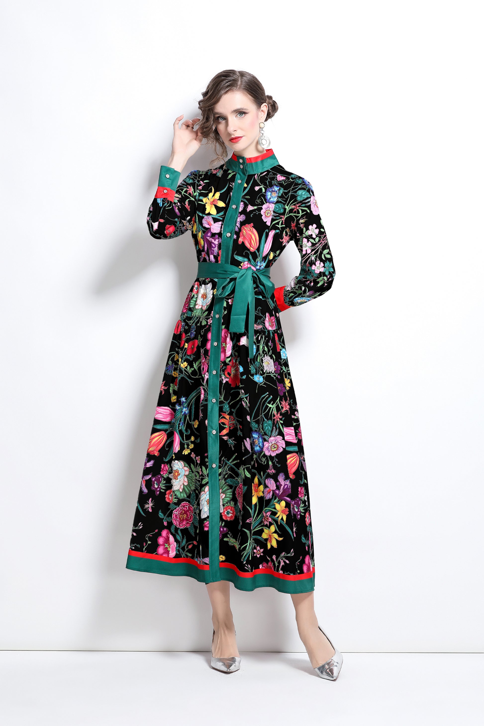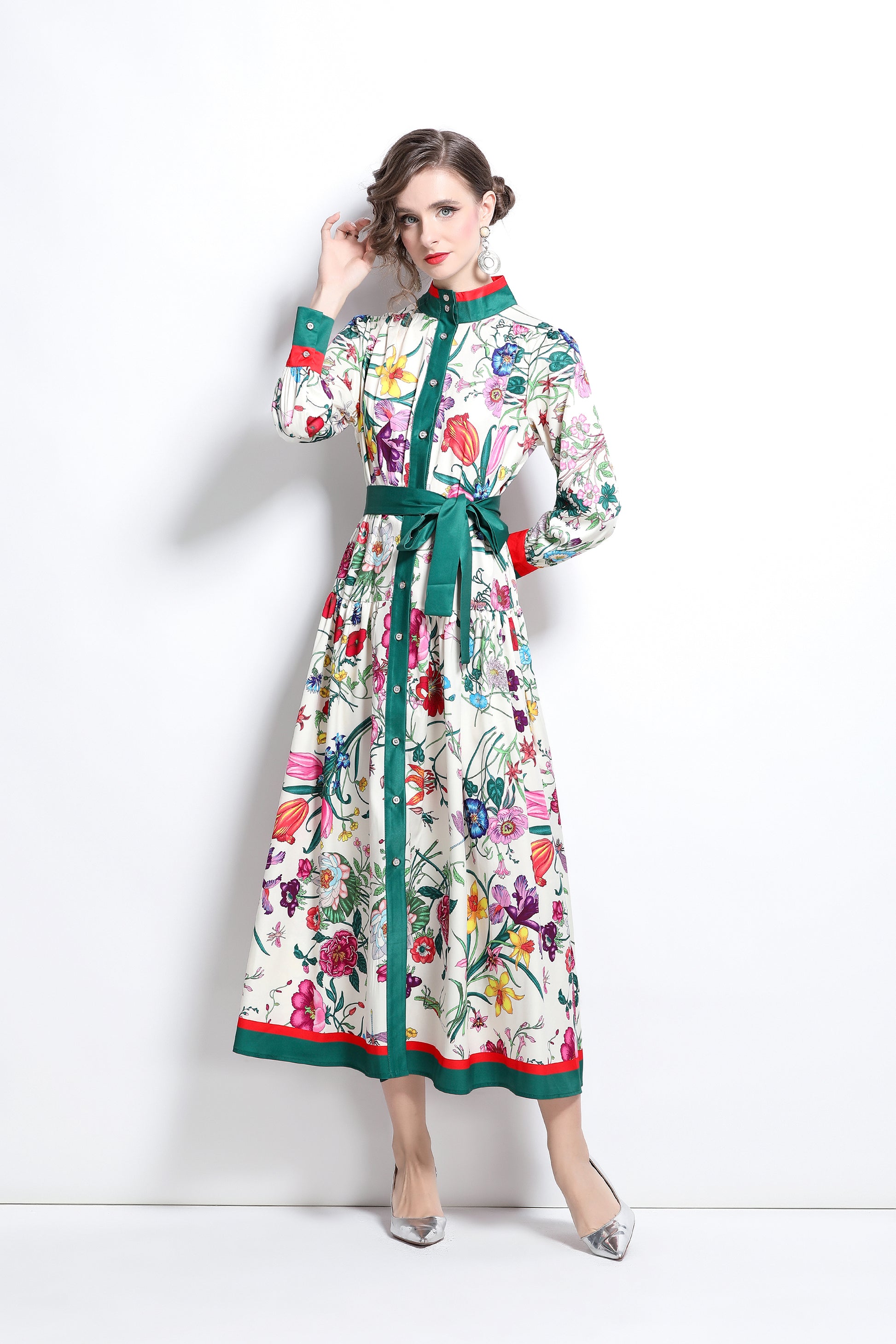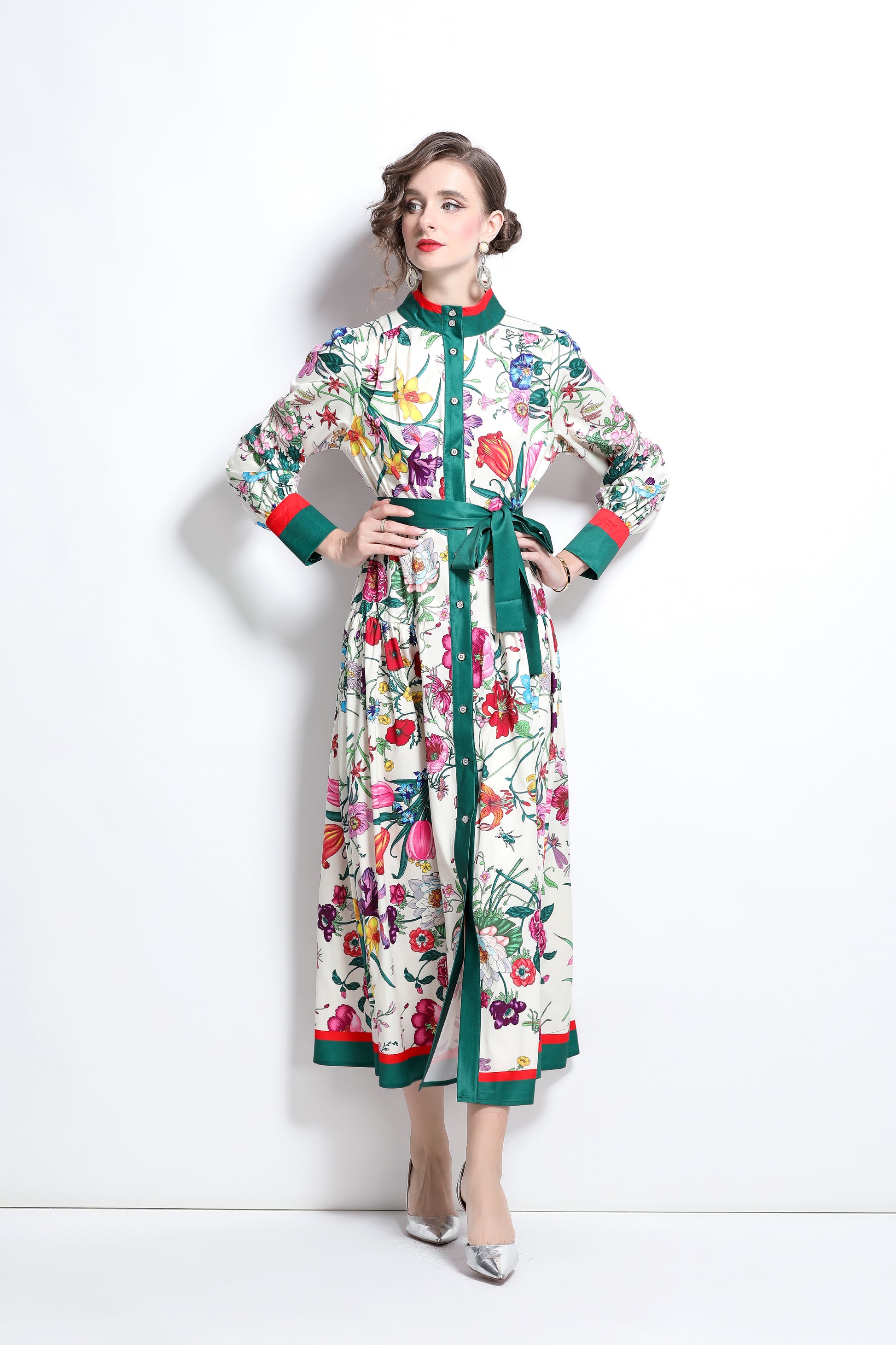 UNIQUE DESIGN:Long Lantern sleeve, Fashion printing design,button front, Round-neck, with a belt accessory,maxi length.