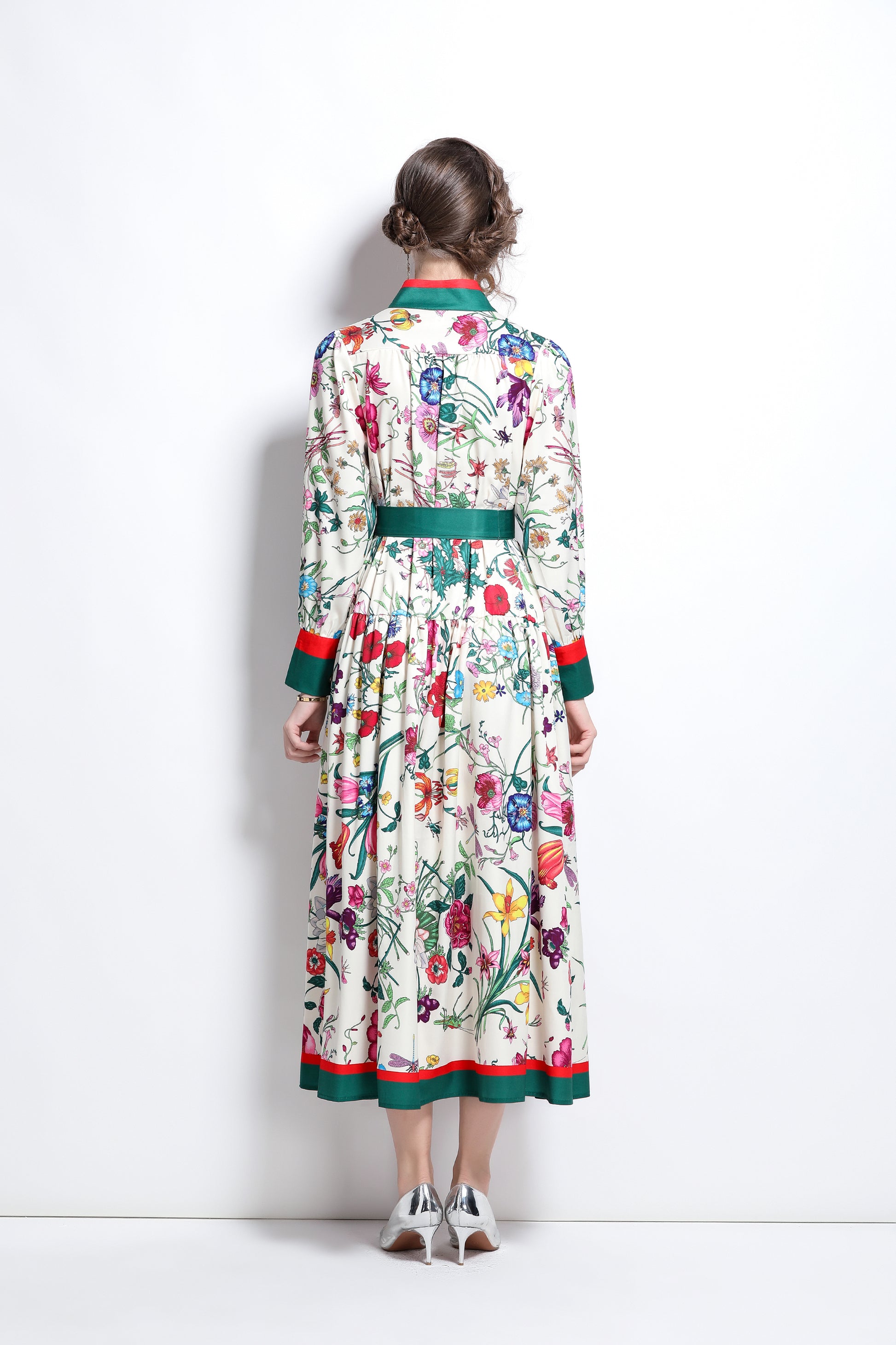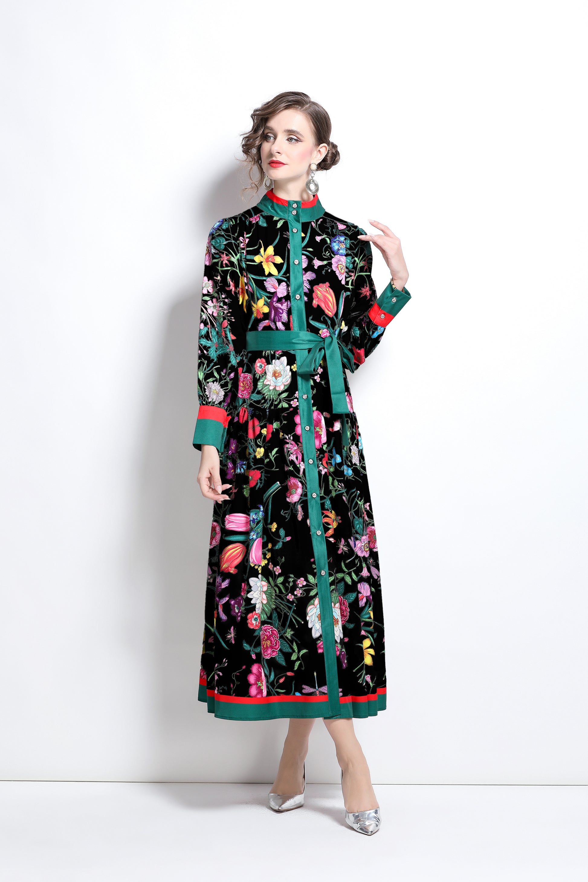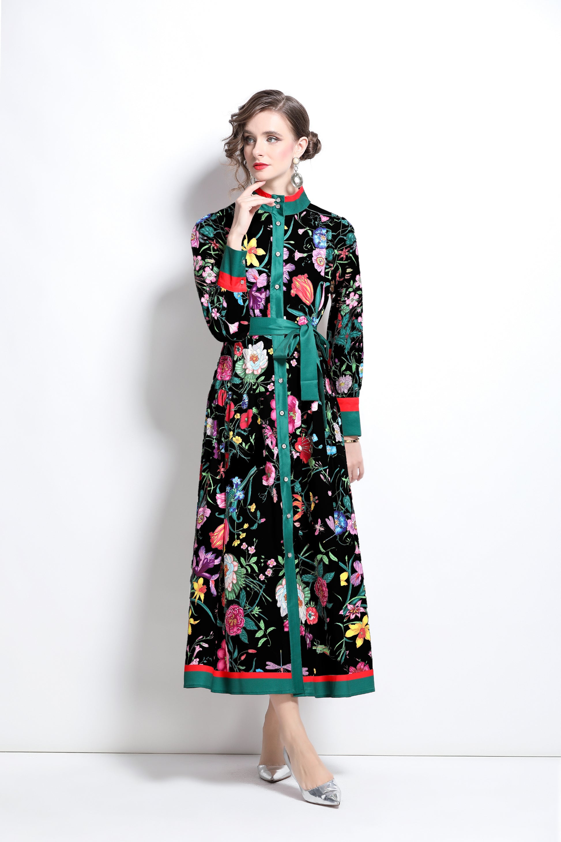 UNIQUE DESIGN:Long Lantern sleeve, Fashion printing design,button front, Round-neck, with a belt accessory,maxi length.