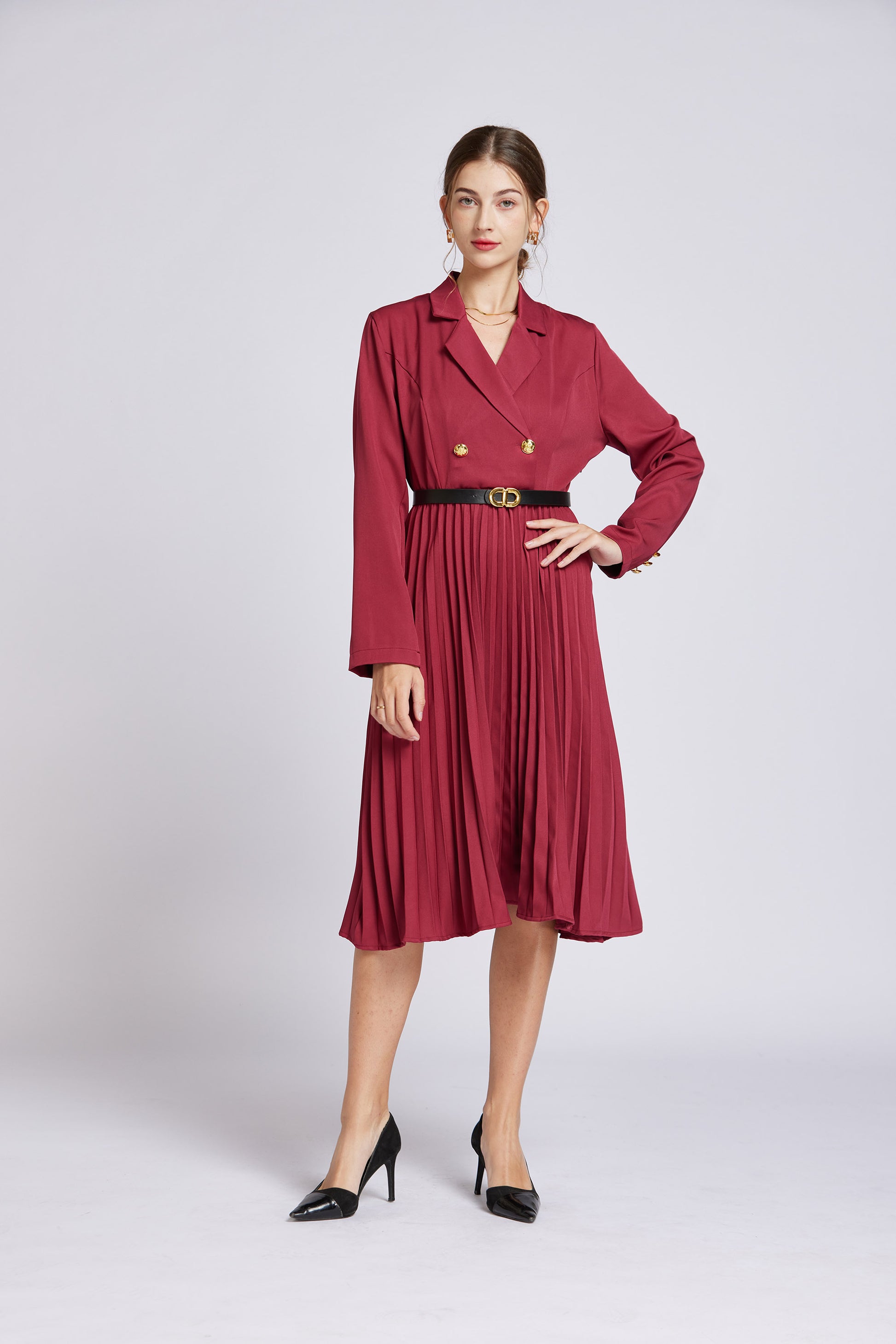 • Features:Double Breasted Blazer Dress, pleated dress, Classic lapel collar with V-neck combo for a sophisticated,belt,long sleeve,midi length,high waist,a-line,soild color.