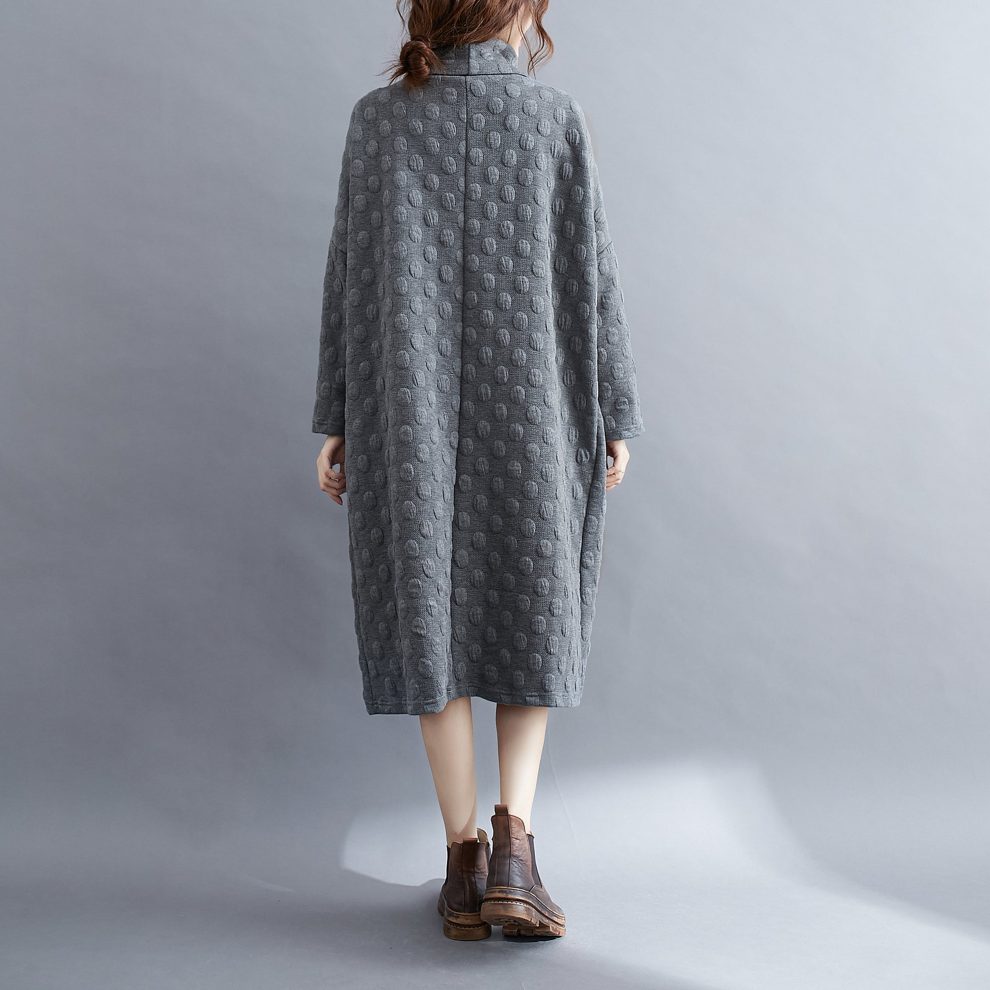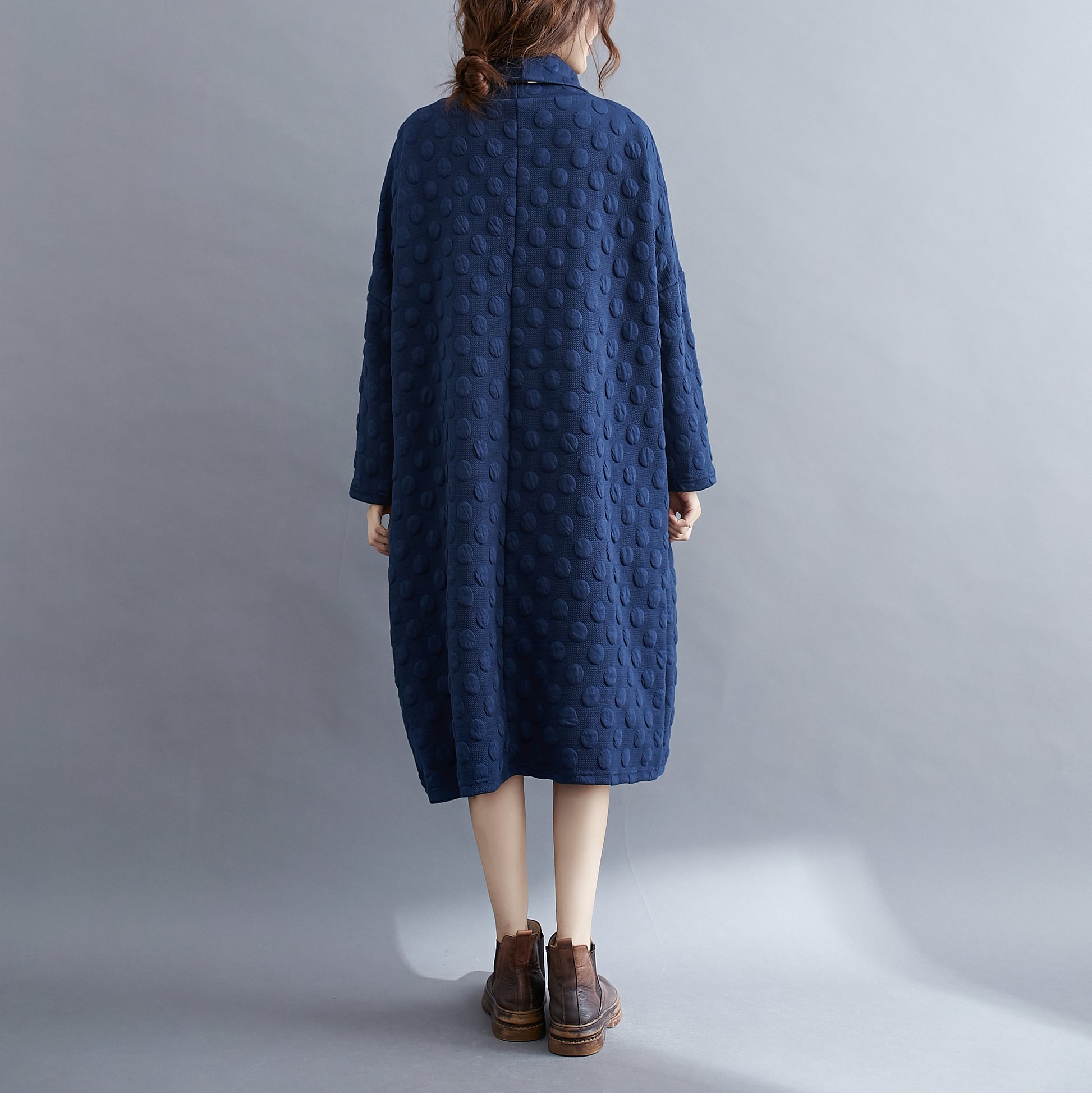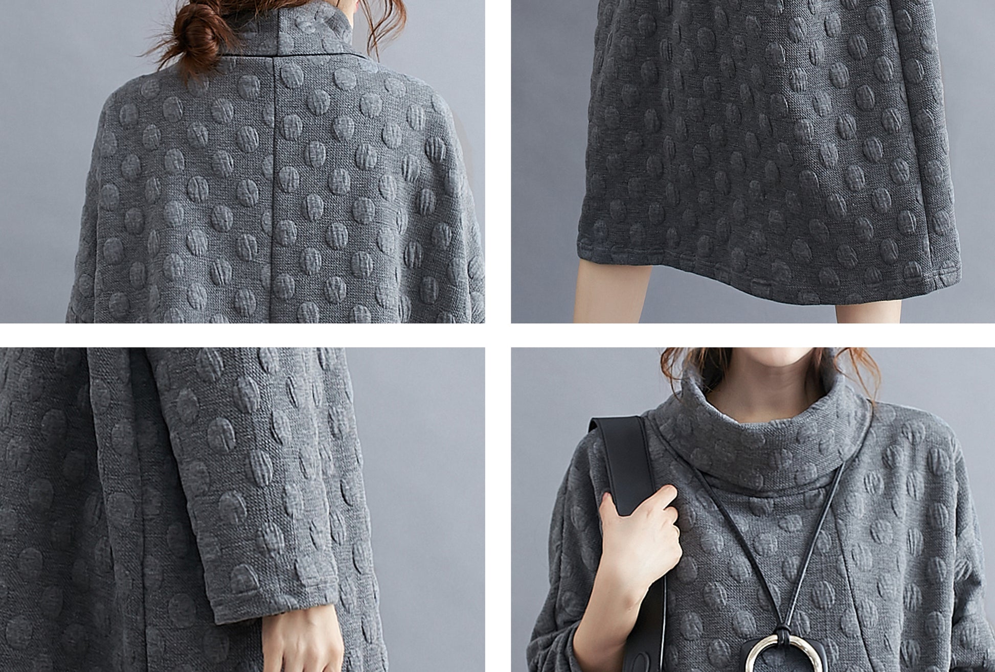 Features: High collar for wind protection, classic solid color, bat sleeves, above-knee length, side large pockets for ample storage.