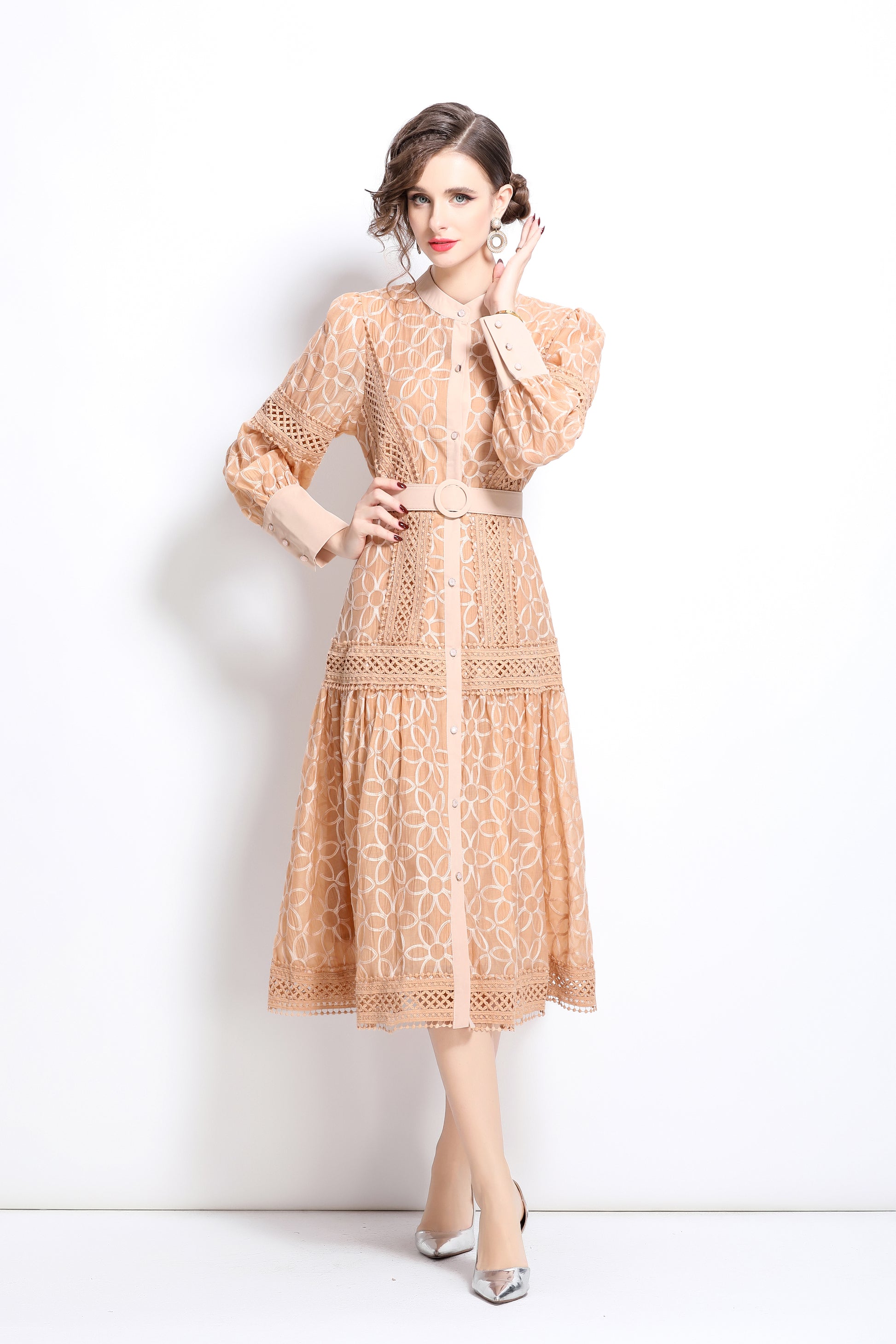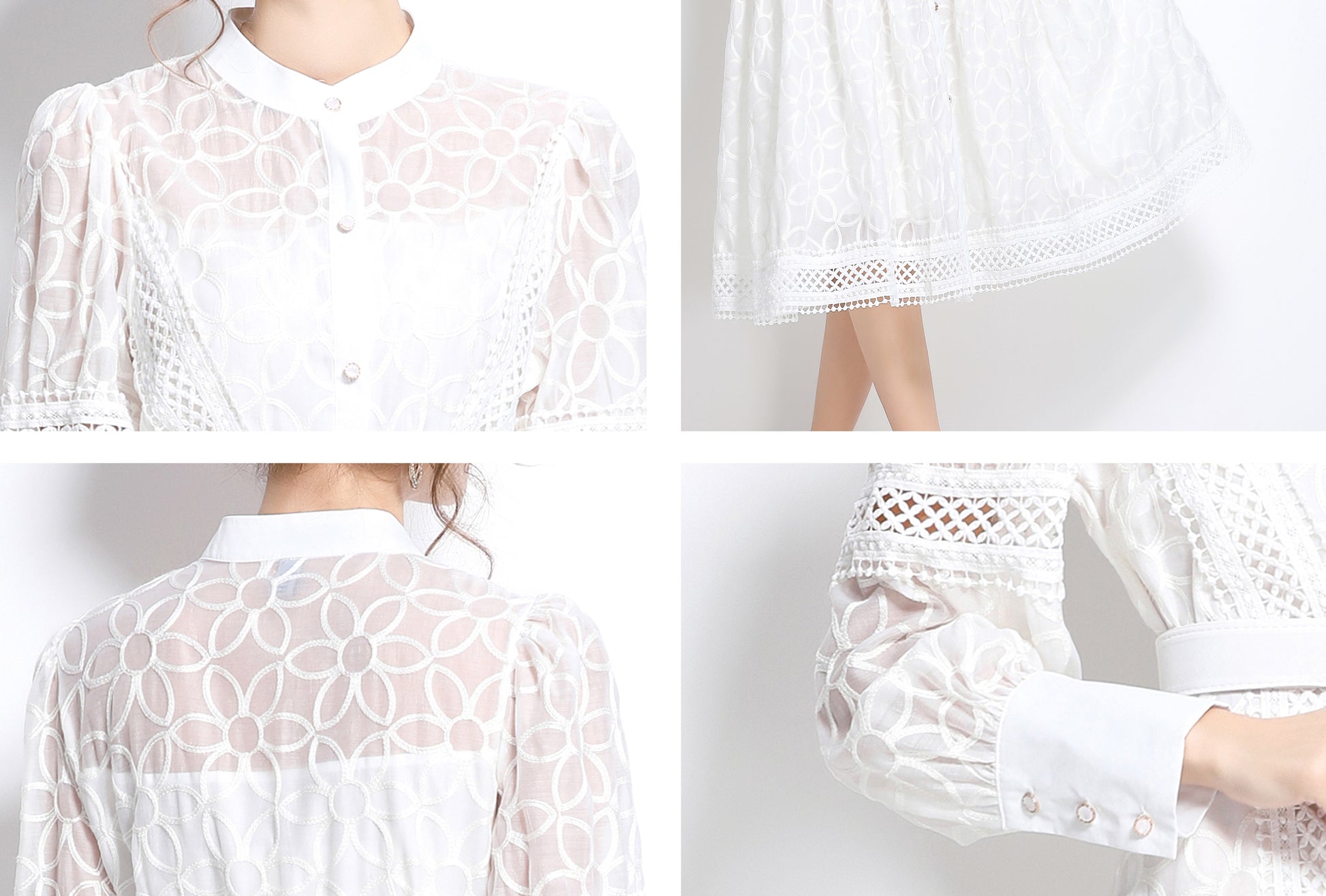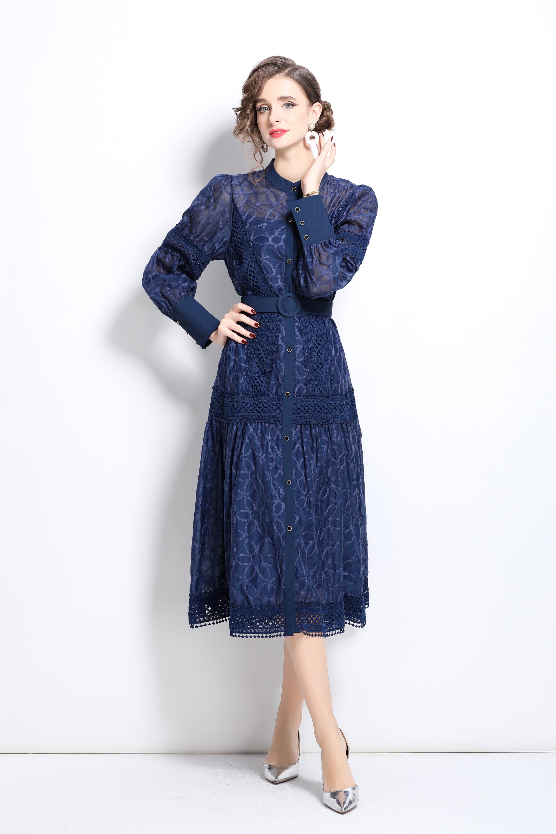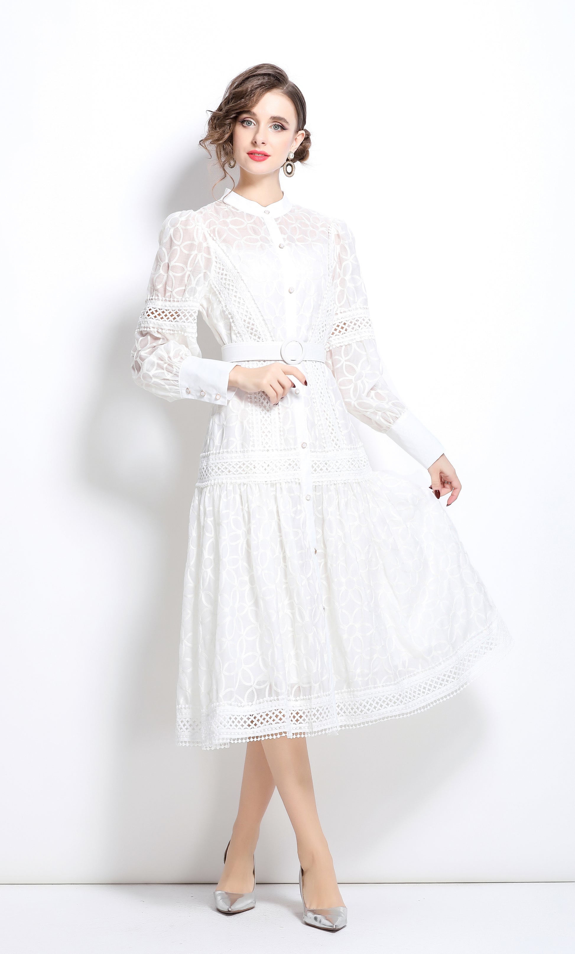 Features: Round neck, buttom front,lantern sleeves, elastic cuffs, high waist with belt, lace embroidery, solid color, lined, below the knee length.