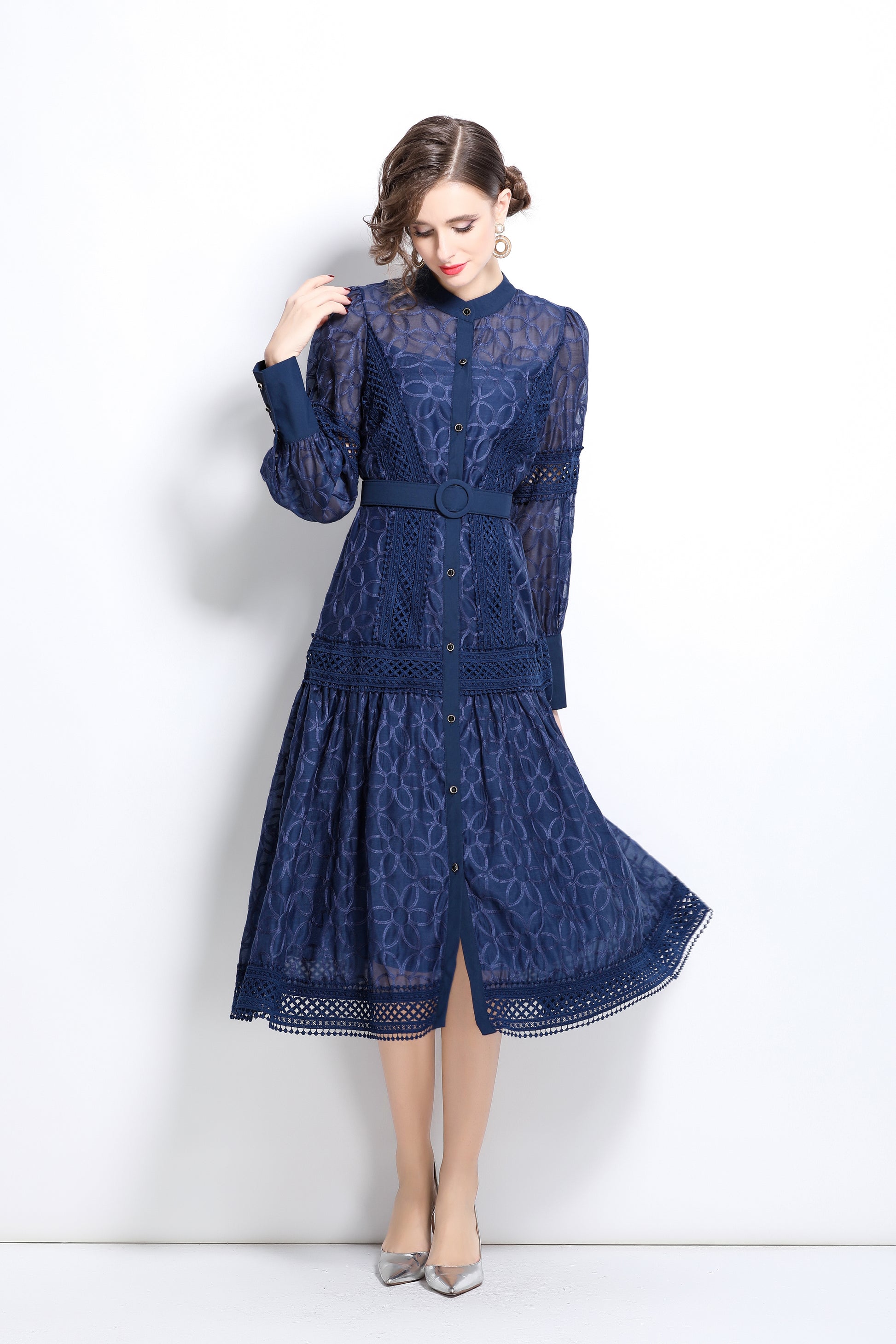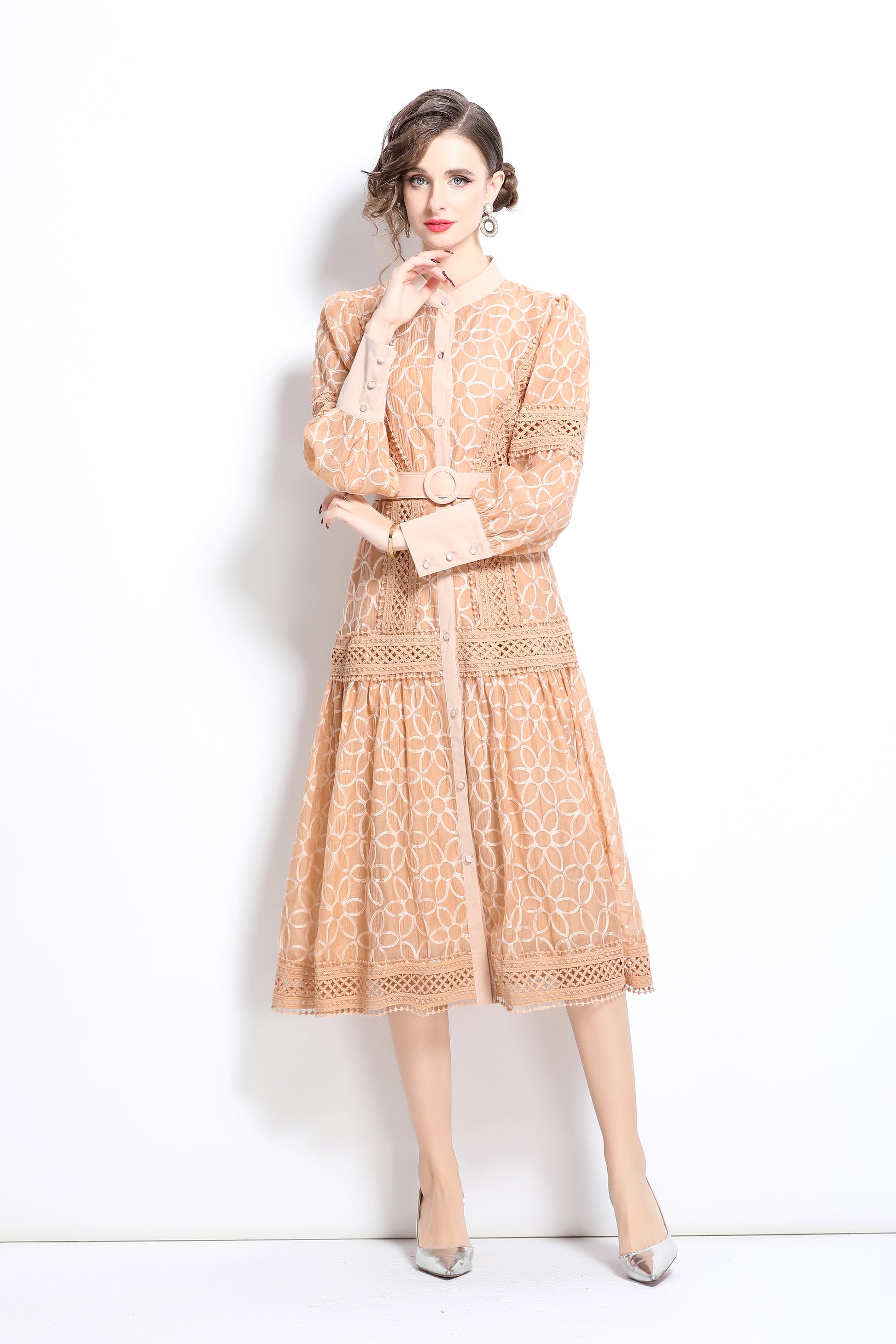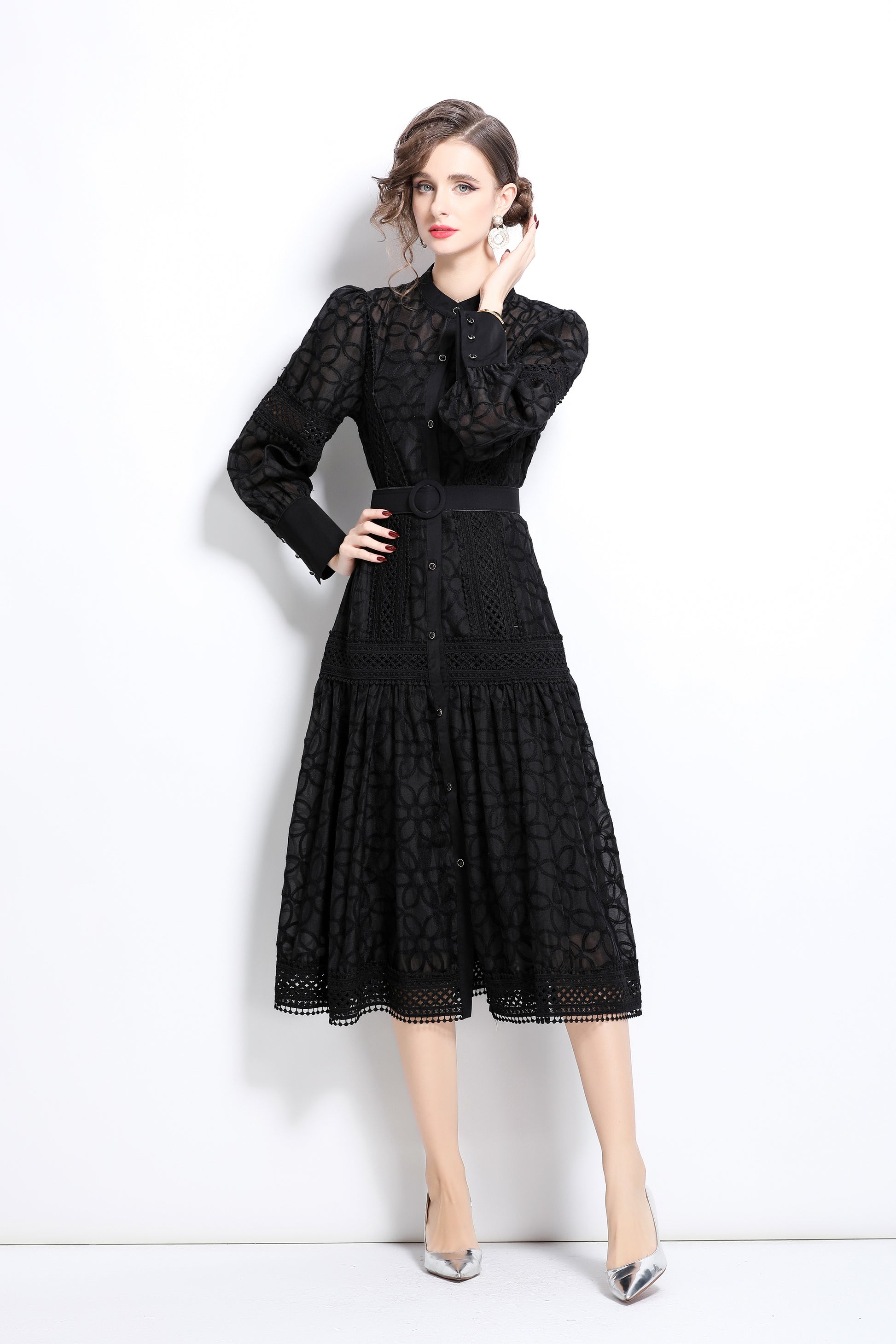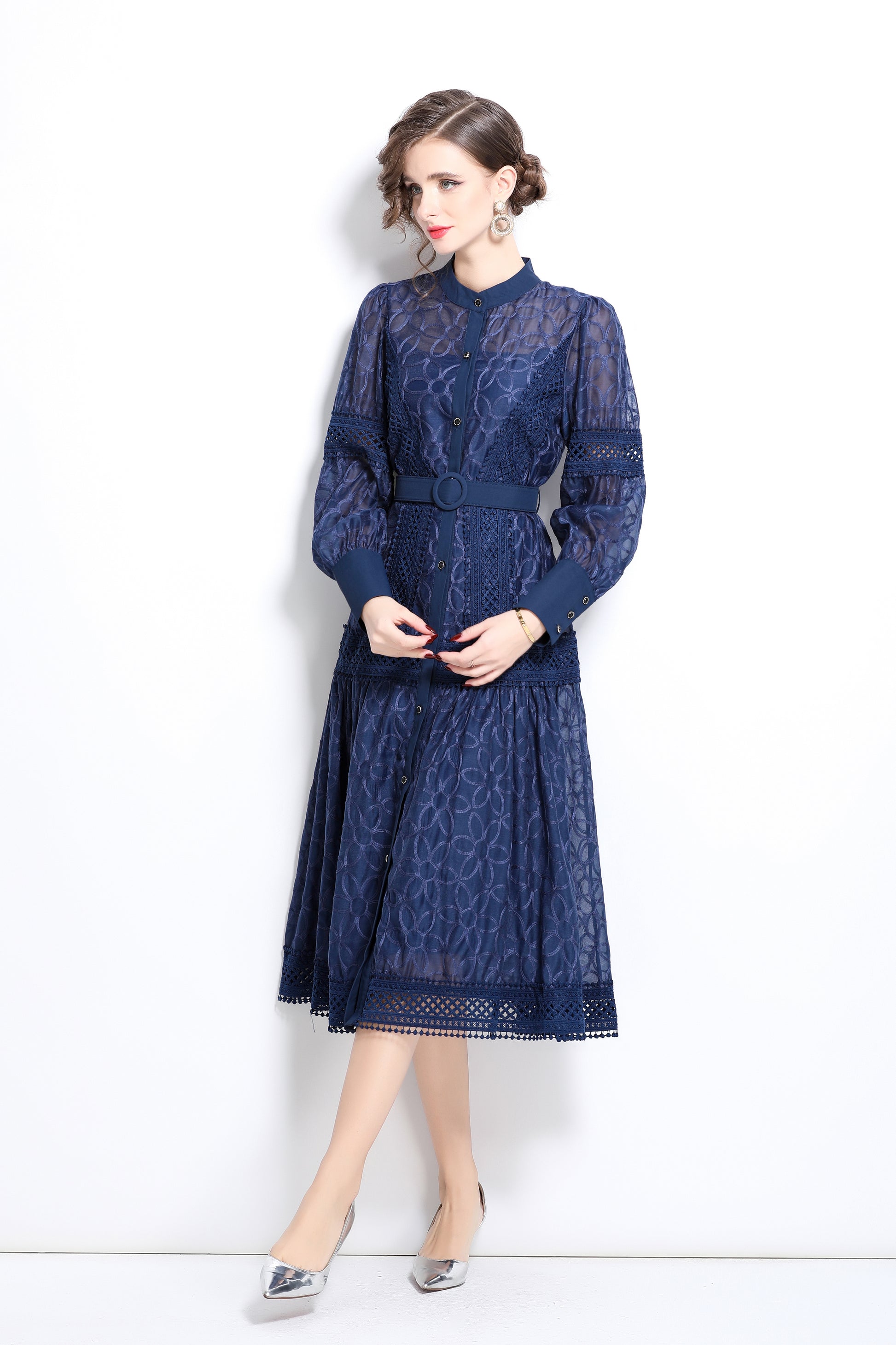 Features: Round neck, buttom front,lantern sleeves, elastic cuffs, high waist with belt, lace embroidery, solid color, lined, below the knee length.