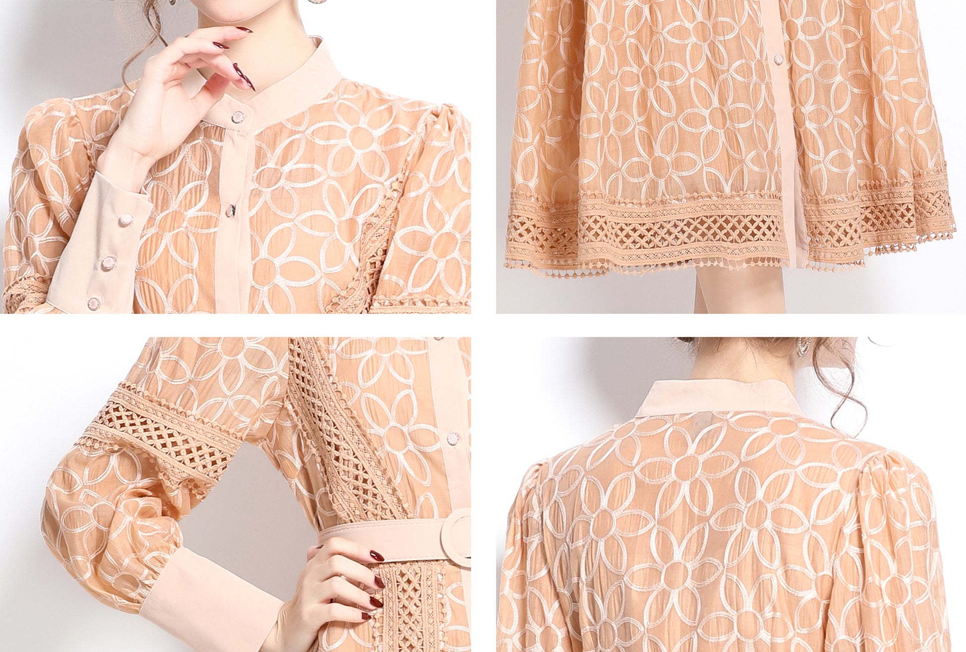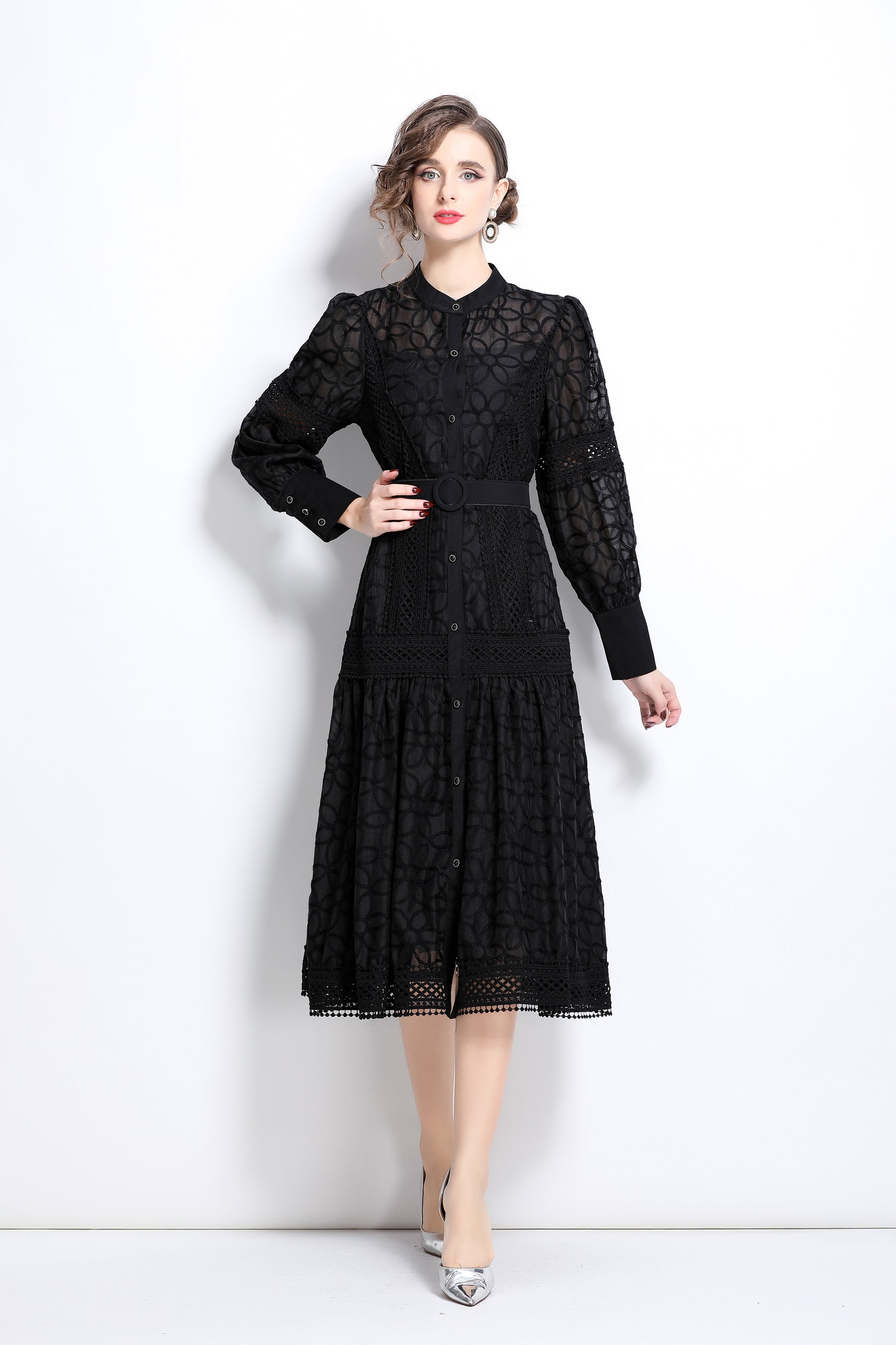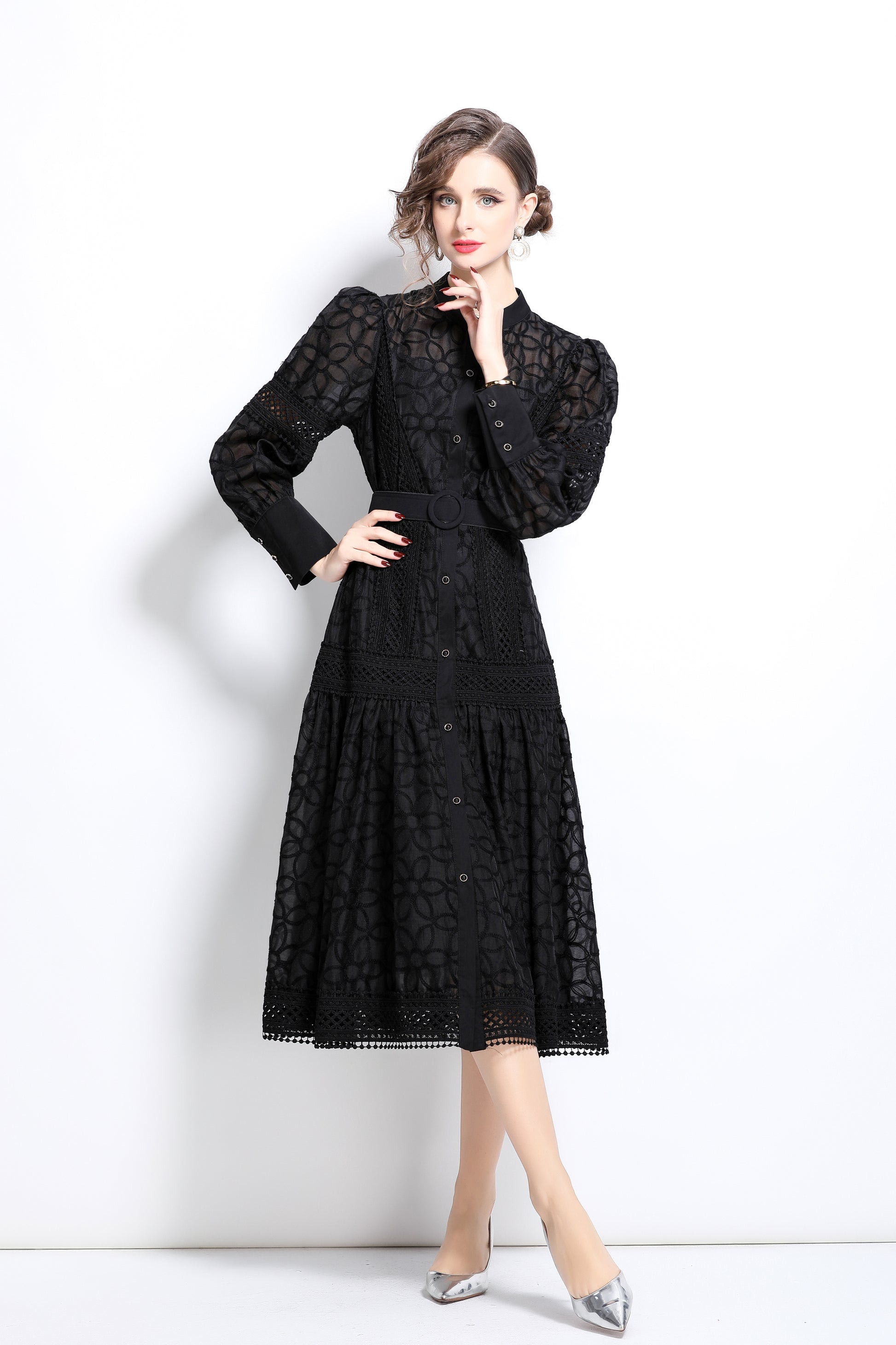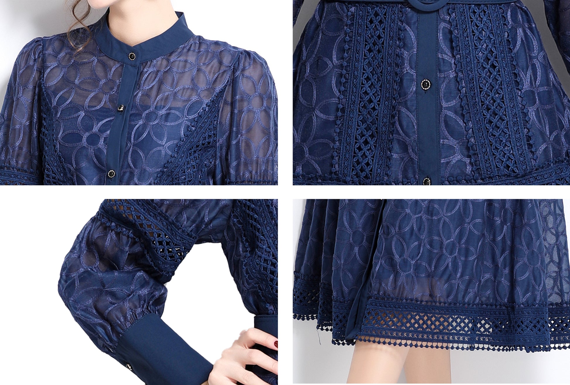 Features: Round neck, buttom front,lantern sleeves, elastic cuffs, high waist with belt, lace embroidery, solid color, lined, below the knee length.