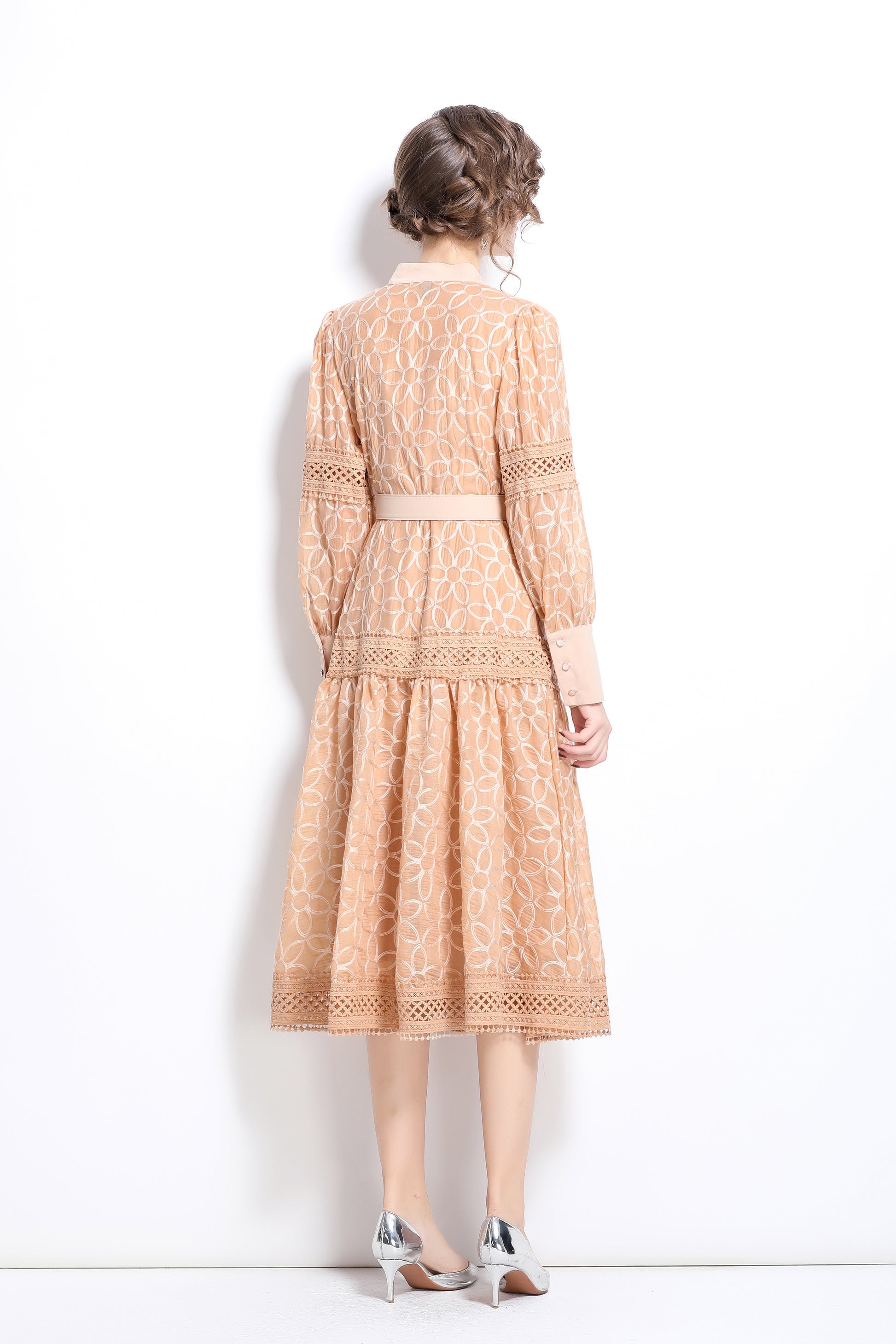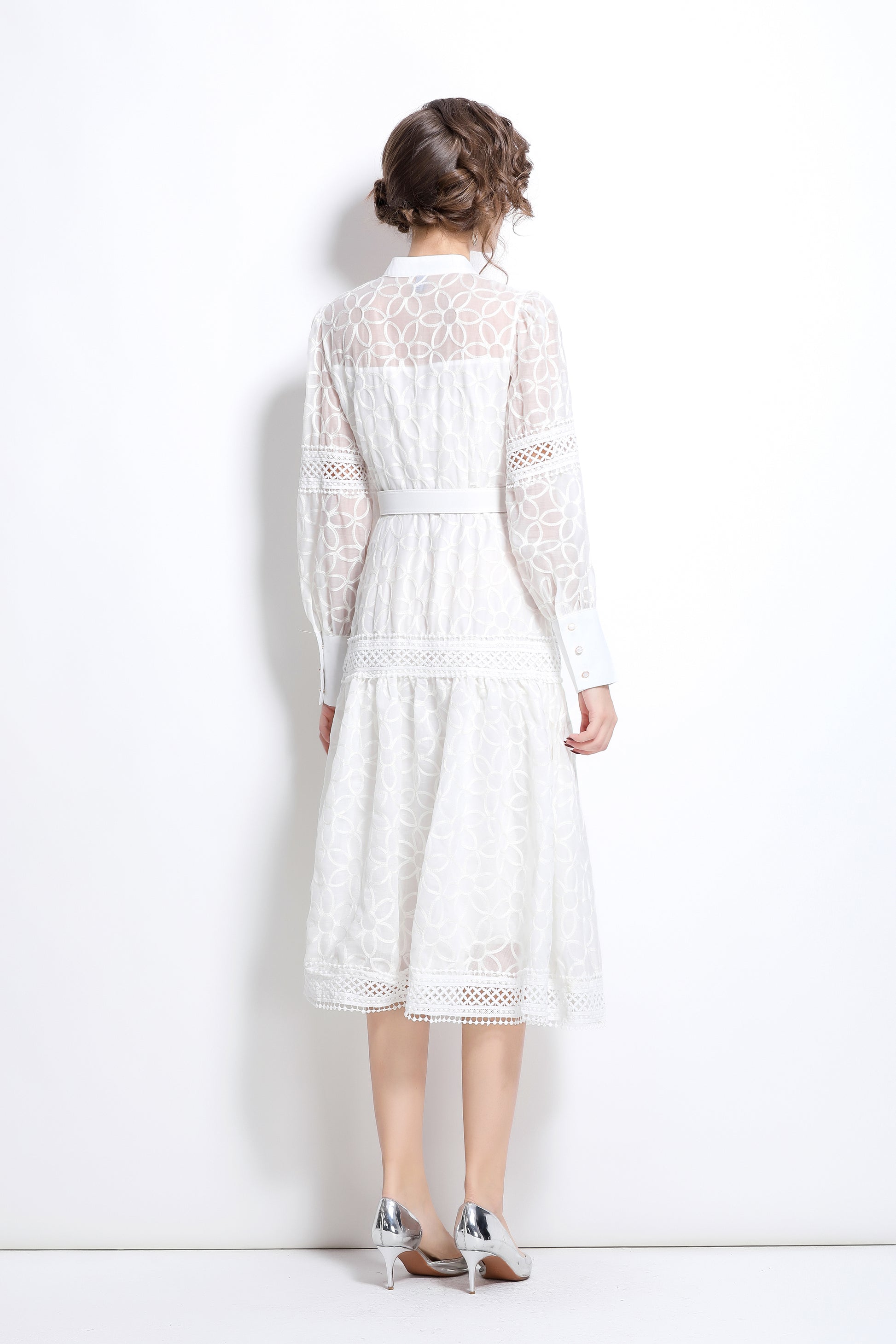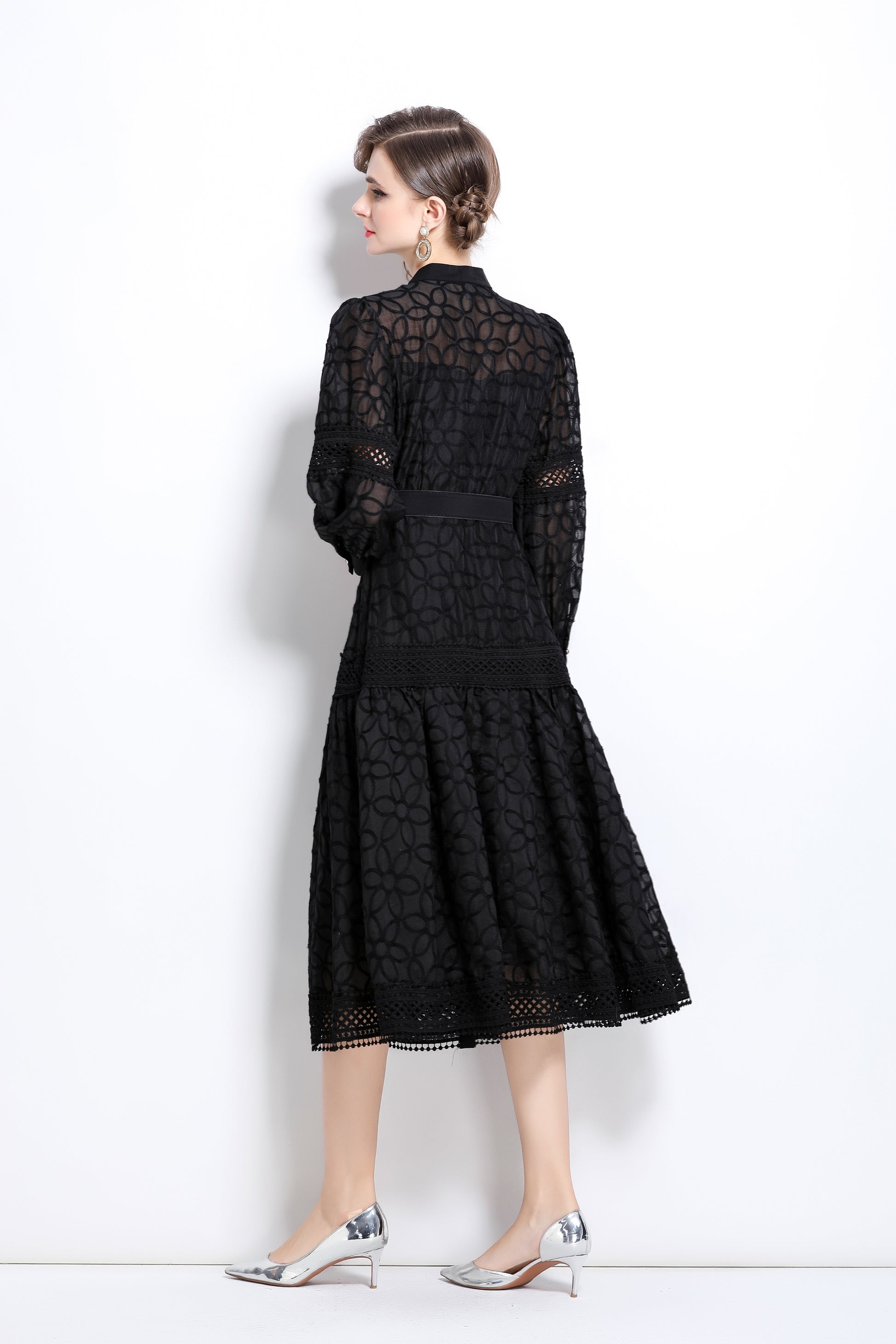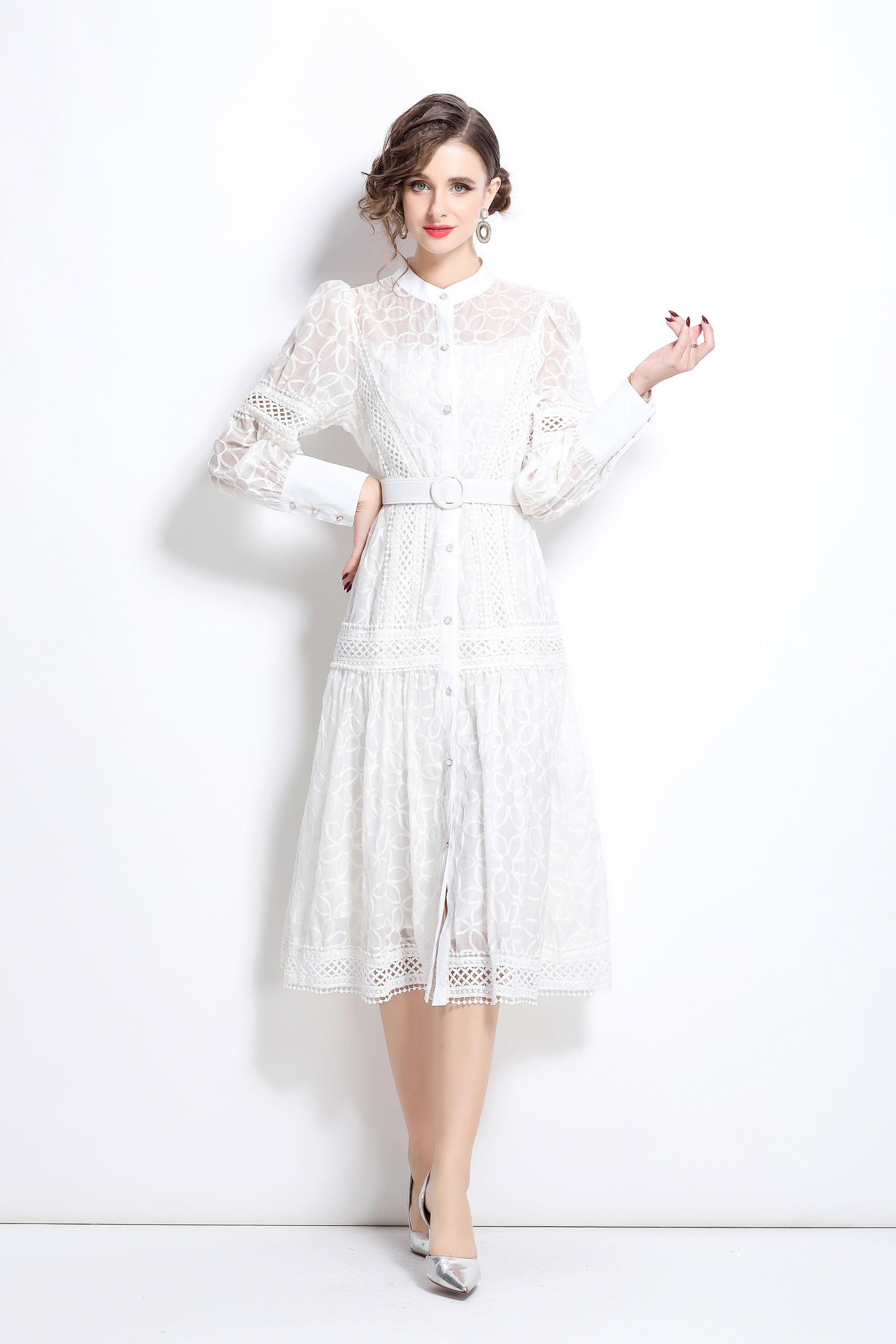 Features: Round neck, buttom front,lantern sleeves, elastic cuffs, high waist with belt, lace embroidery, solid color, lined, below the knee length.