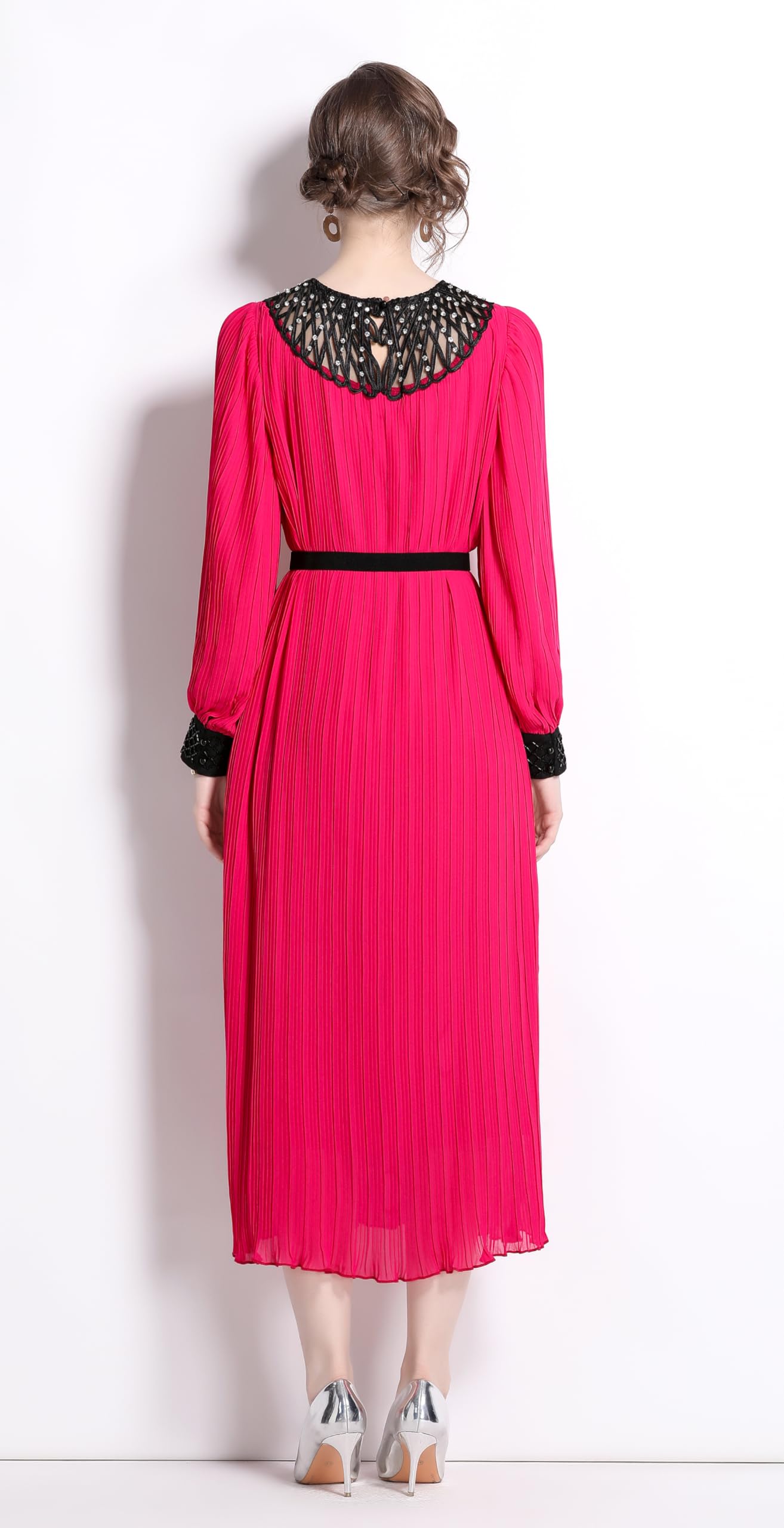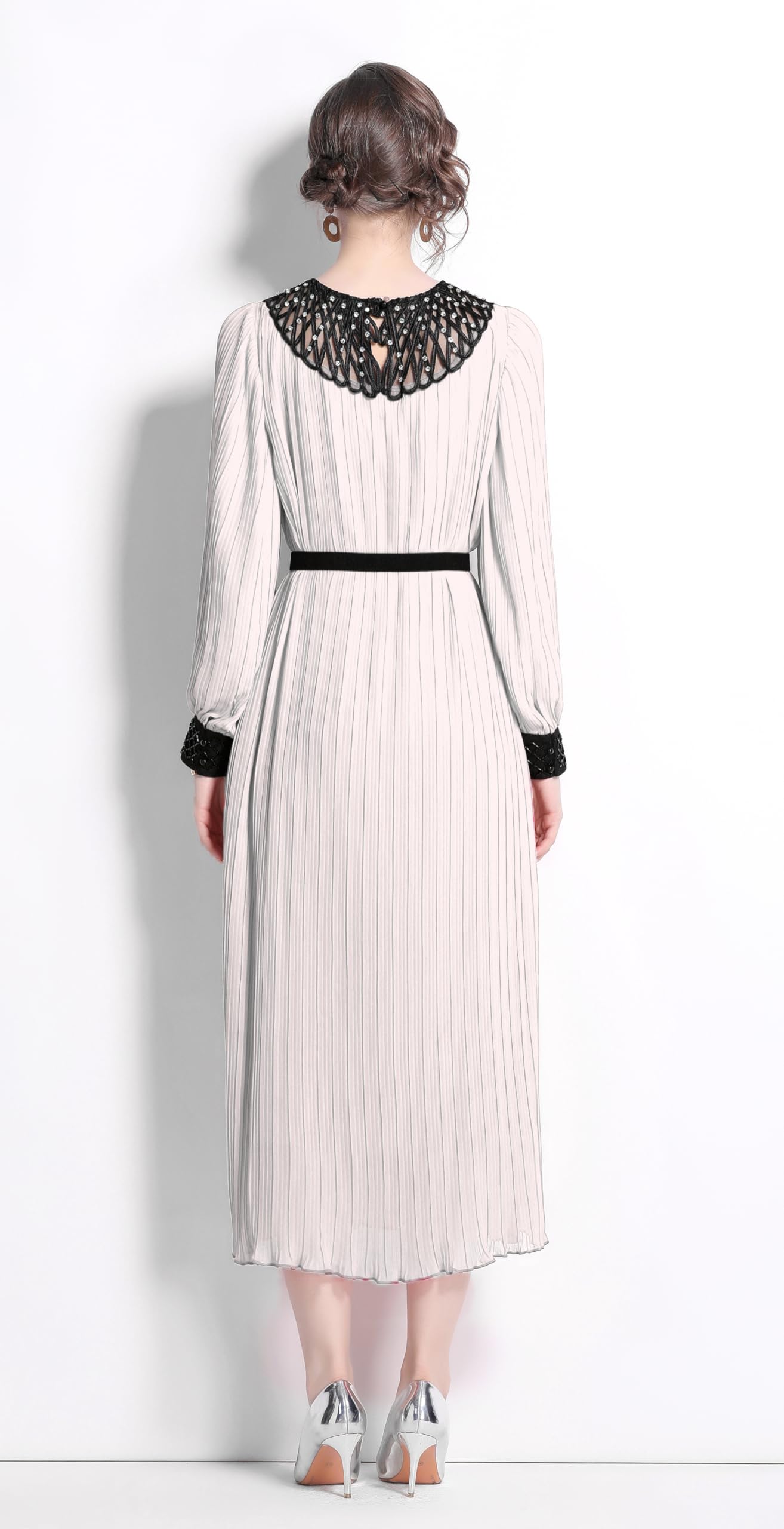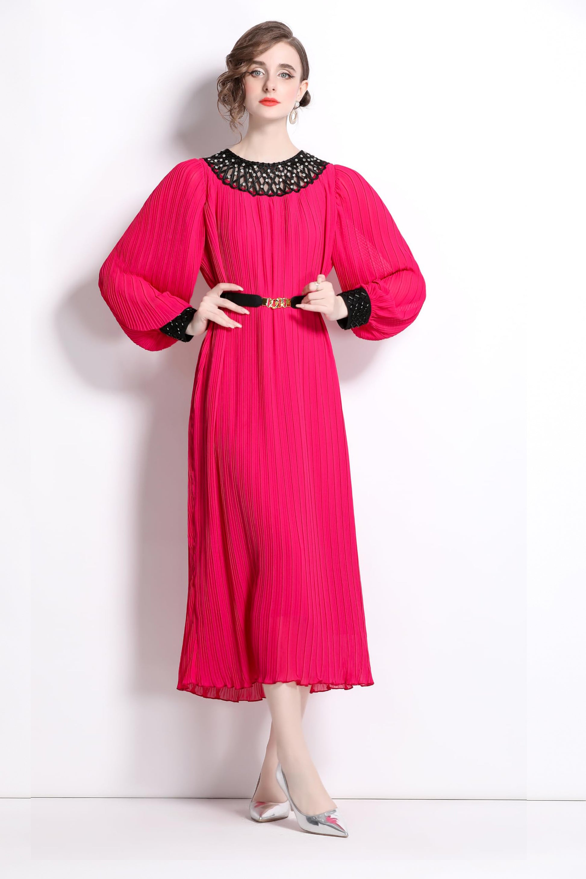 Features:Long puff sleeves,contrast color lace crew neck and cuffs, removable belt,chic pleated design adds elegance to this A line maxi dress.