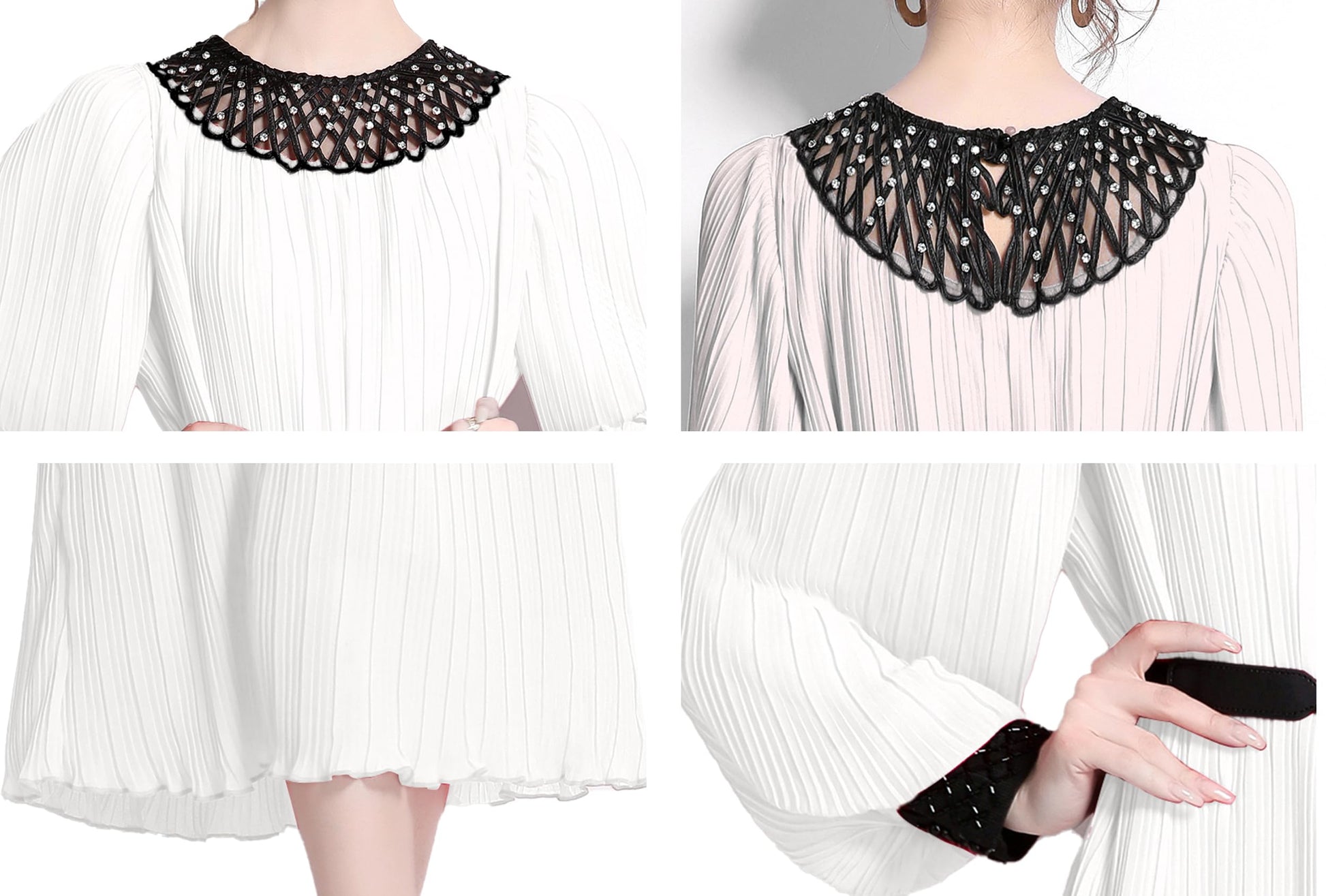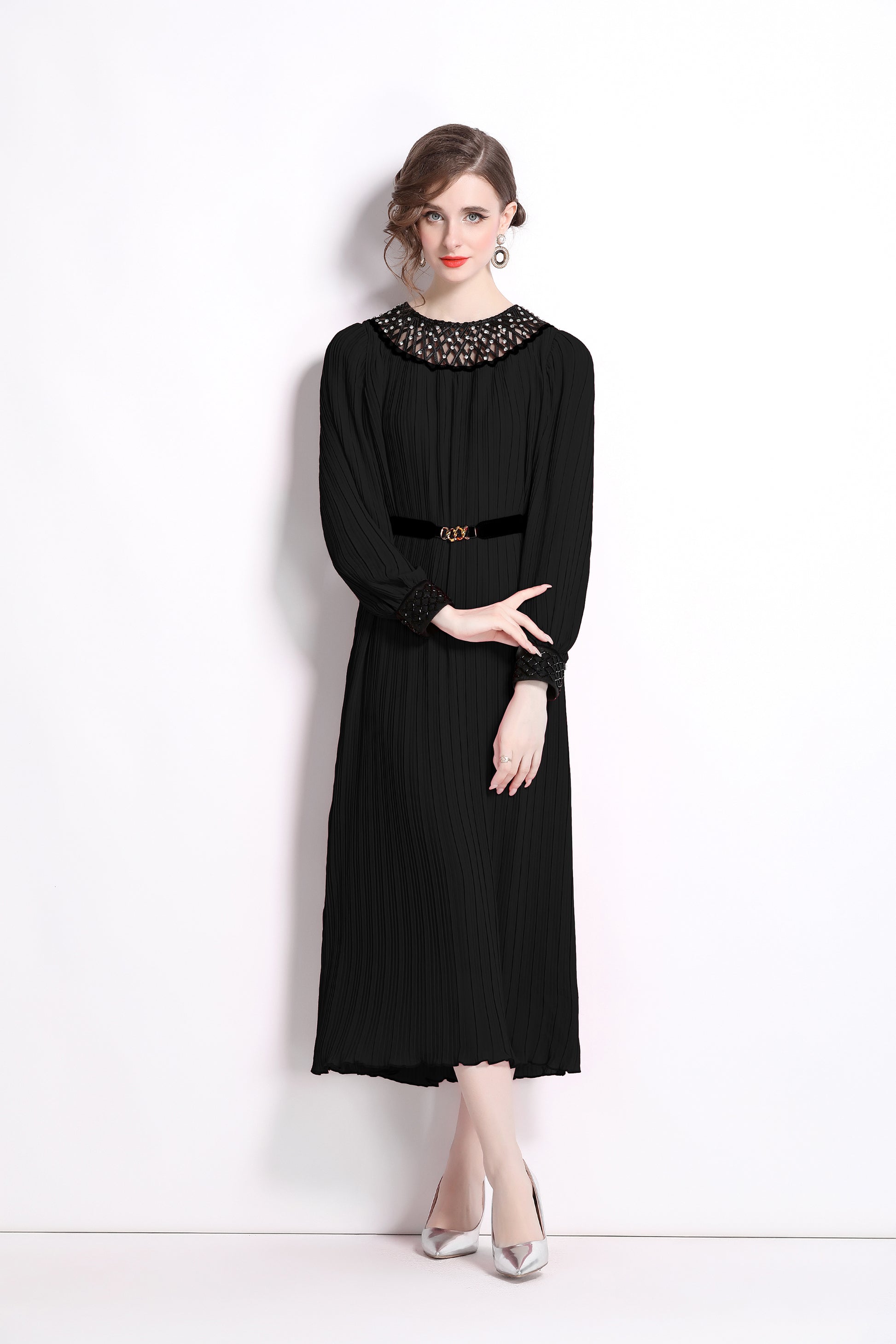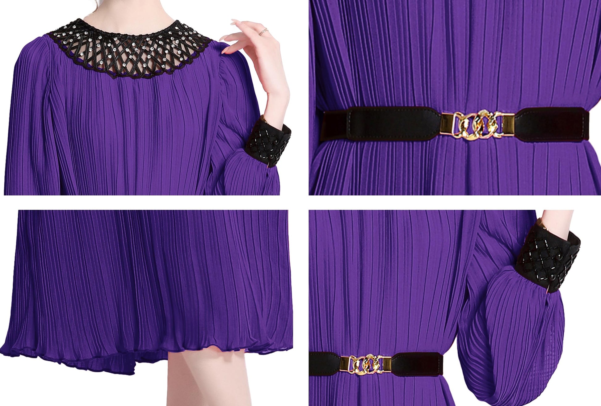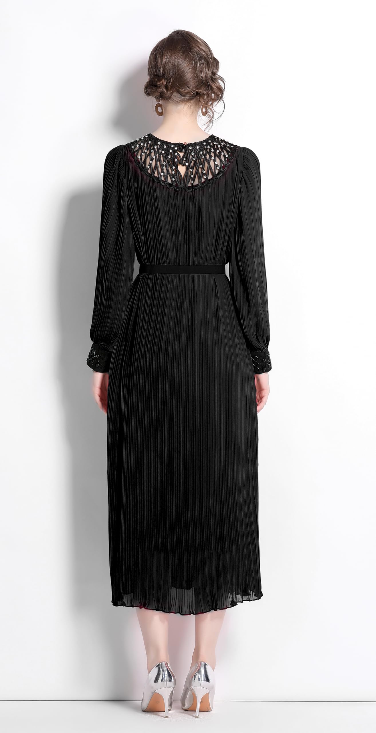 Features:Long puff sleeves,contrast color lace crew neck and cuffs, removable belt,chic pleated design adds elegance to this A line maxi dress.