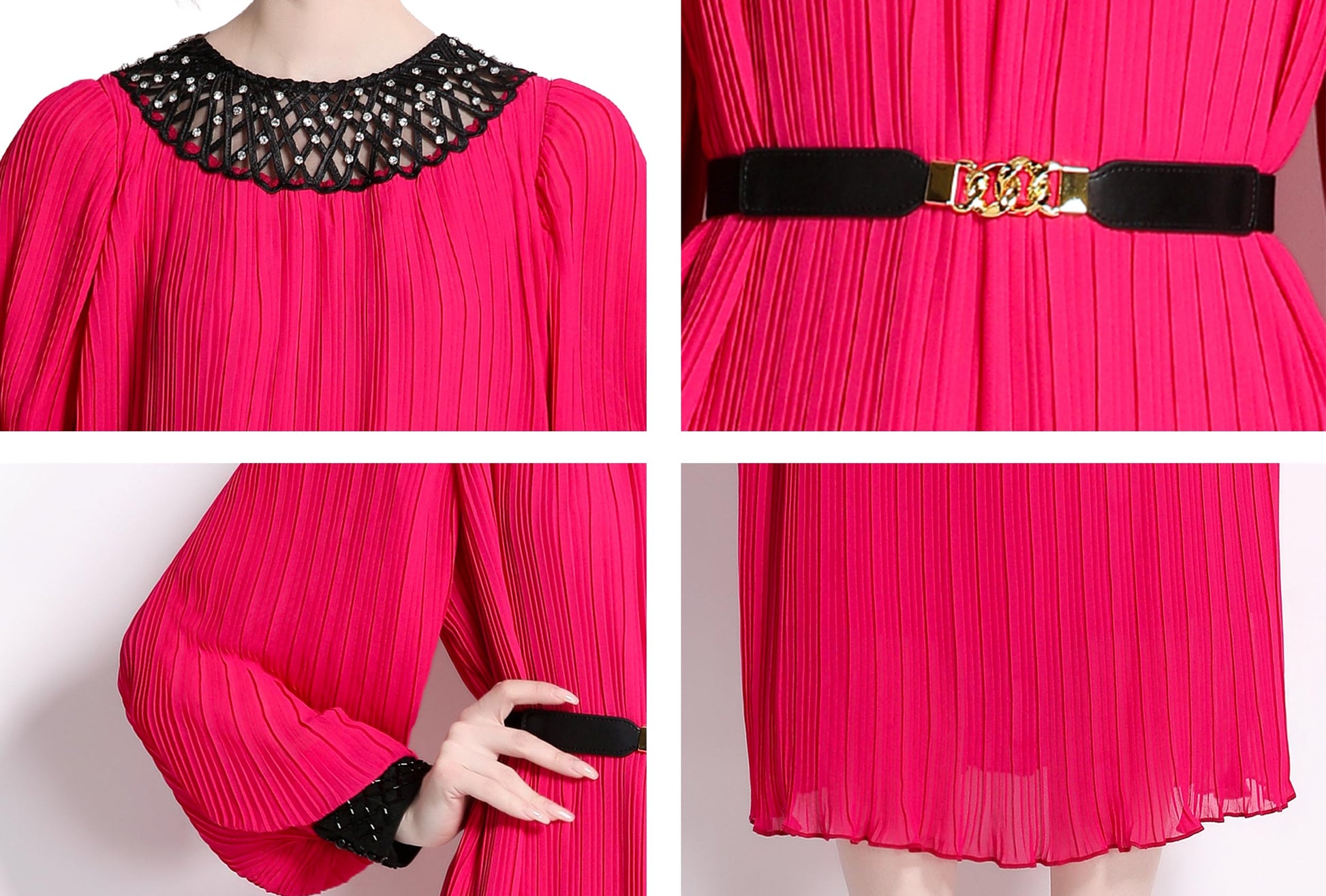Design:The contrasting color design on the collar and cuffs adds a touch of color to the monotonous solid color skirt.The matching belt can raise the waistline and make you look more slim.
