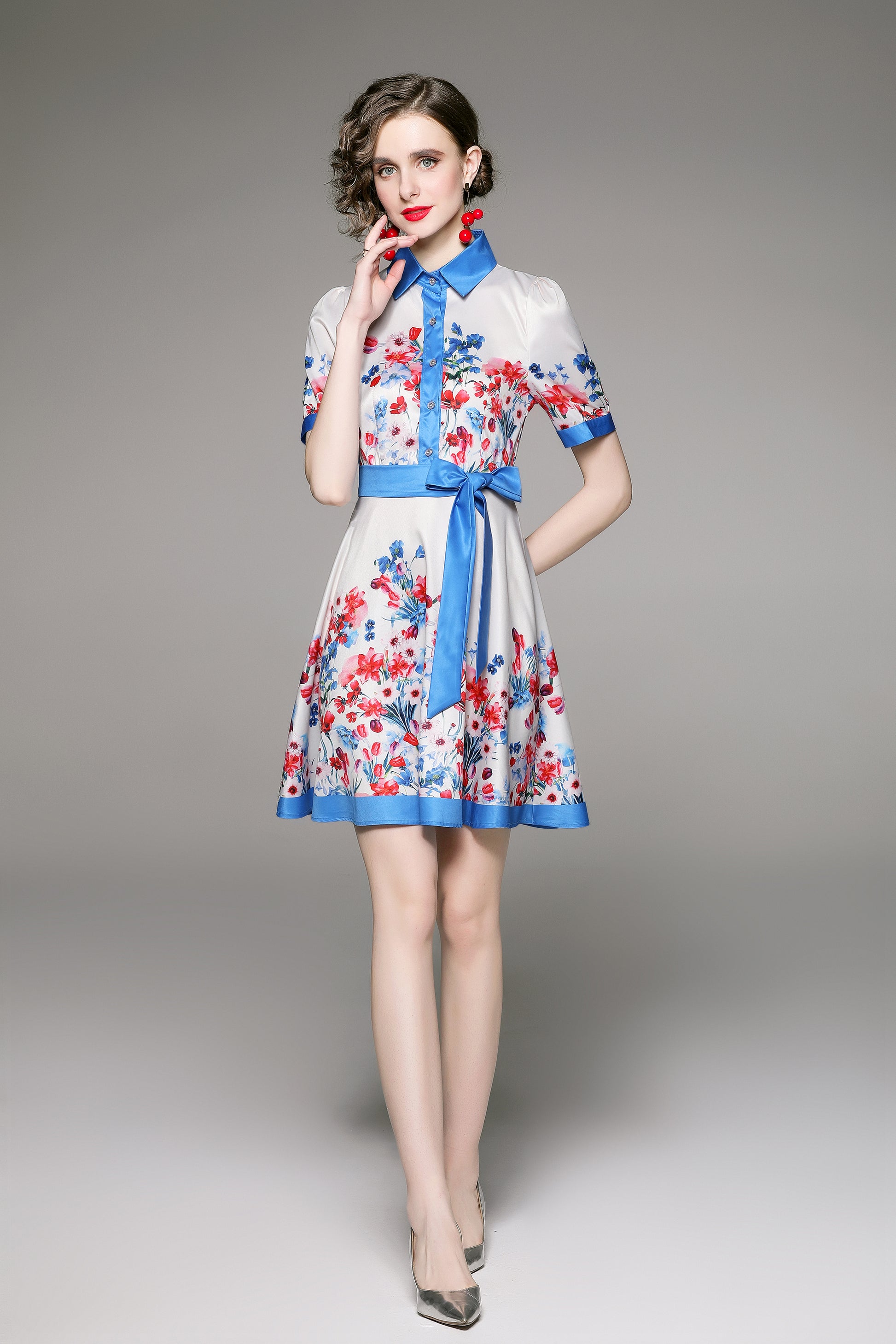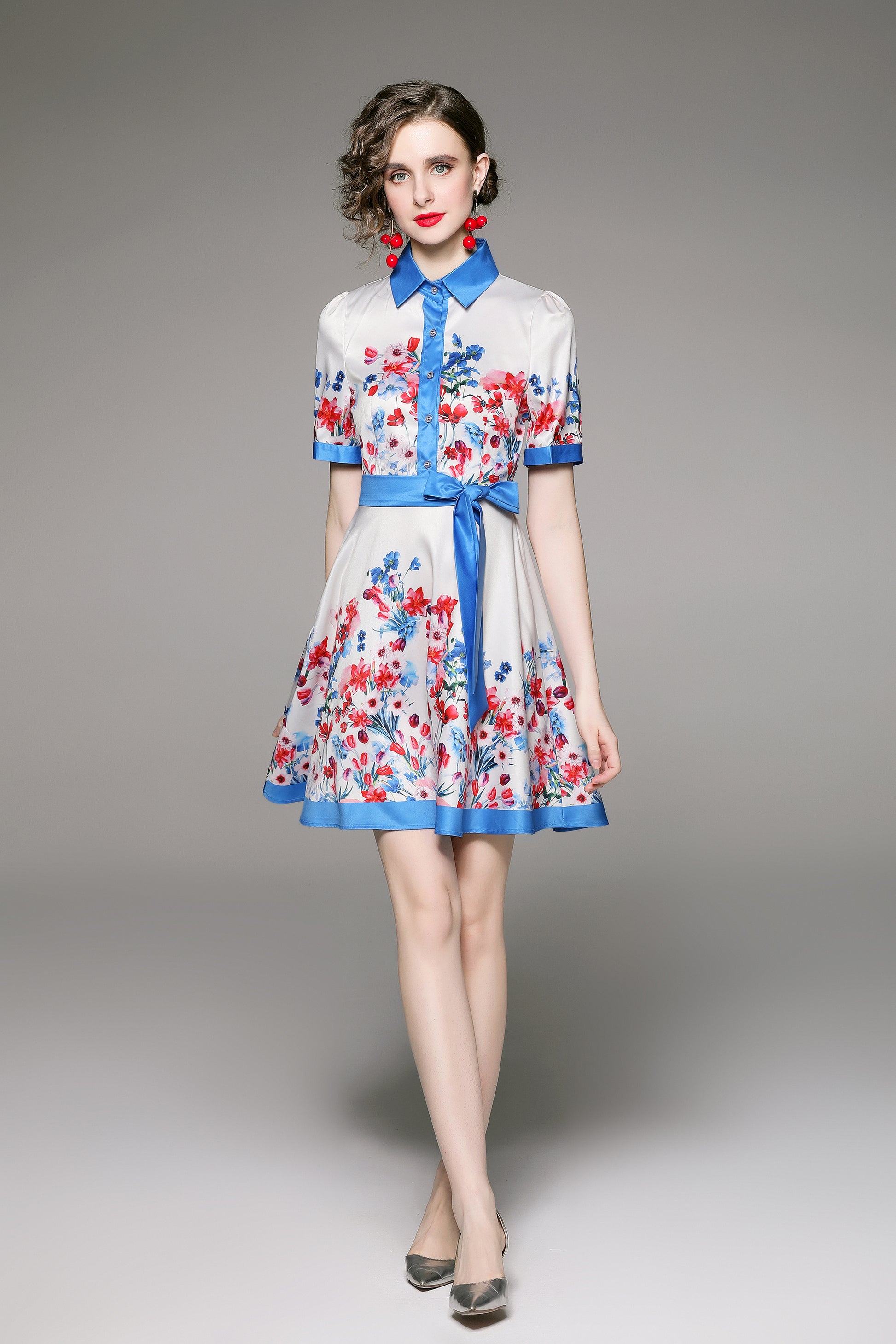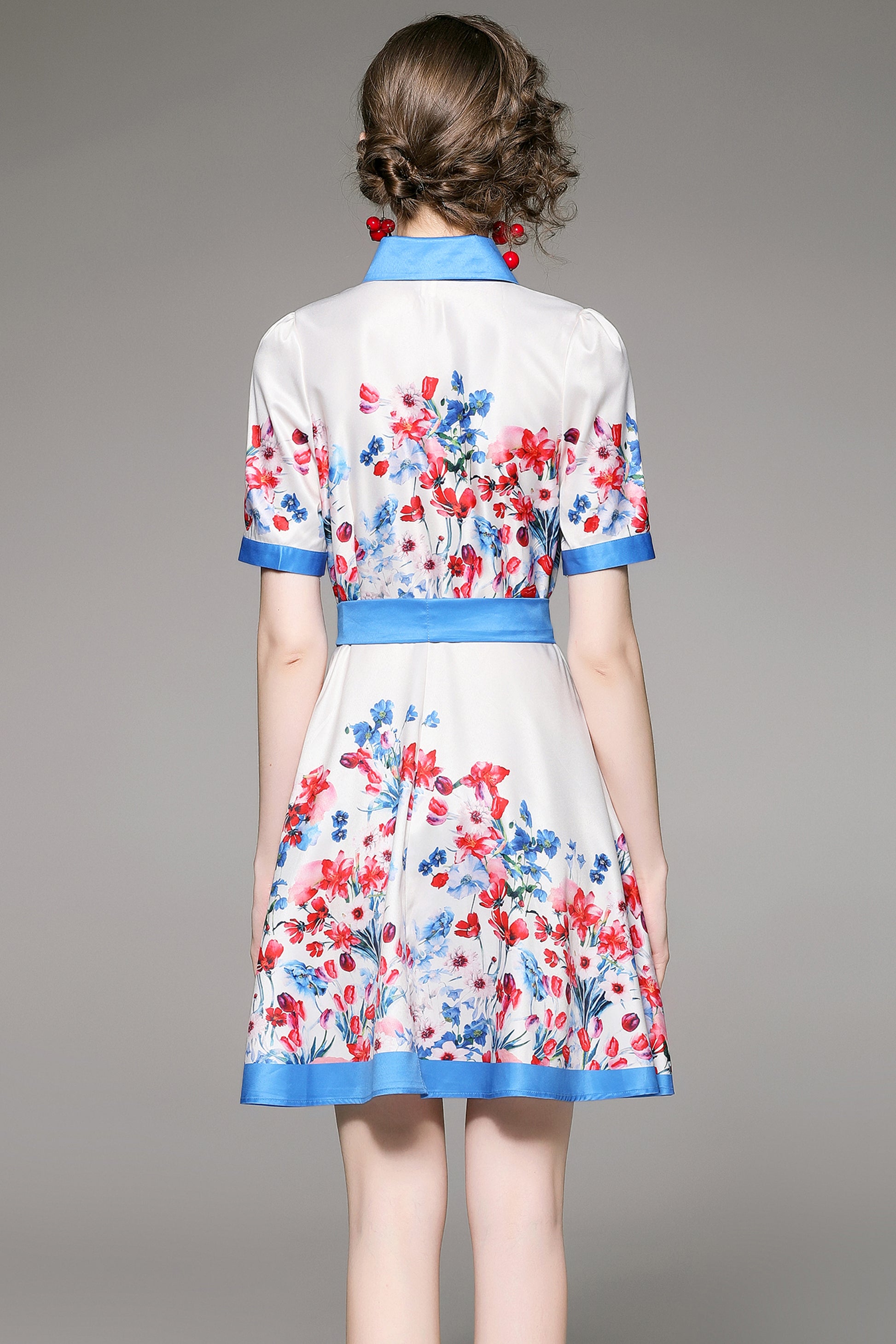 SSY-Women's Floral Lapel Collar Short Sleeve Mini Dress