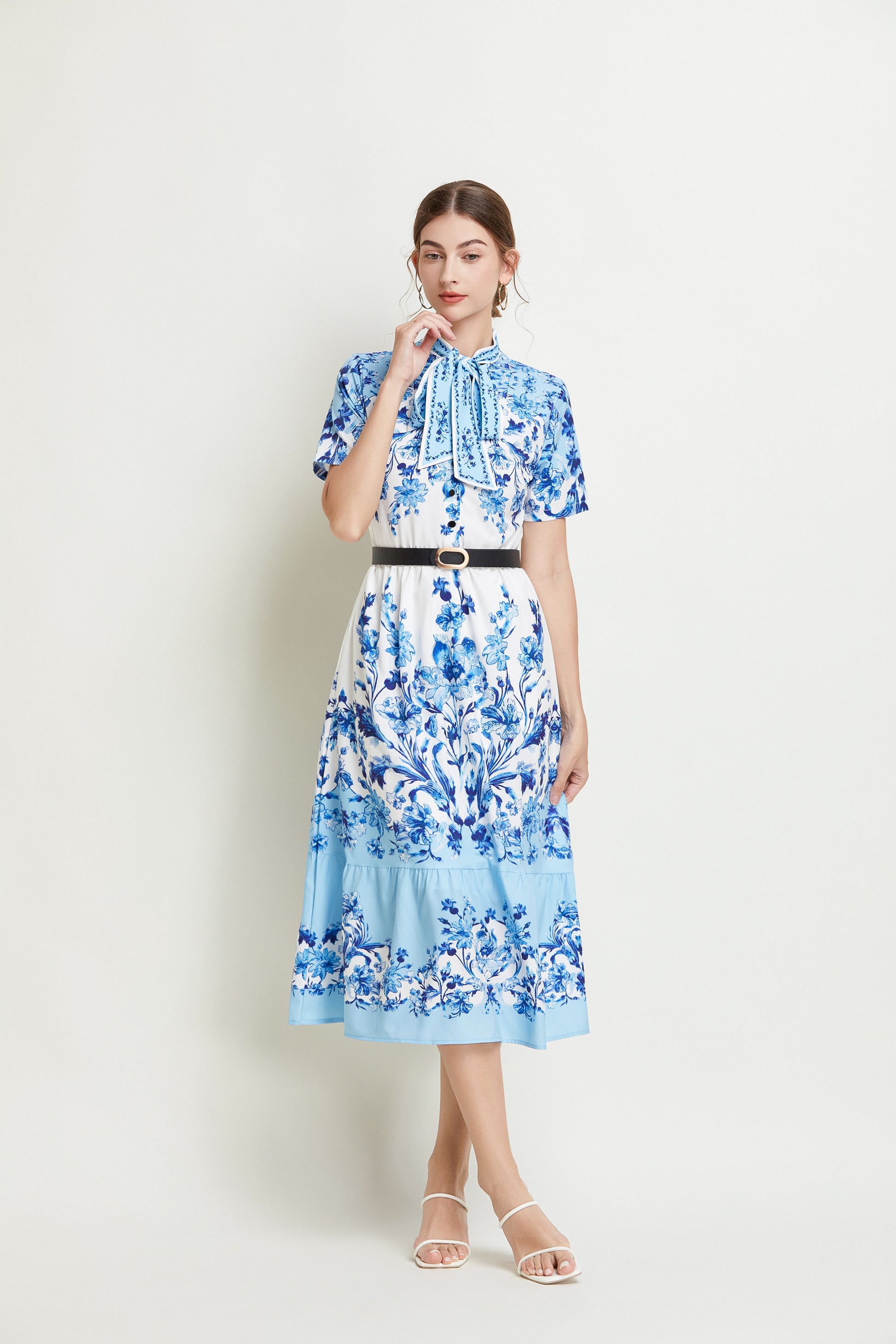 • Tie neckline,Short sleeve,Midi length,A-line,Fit and flare design