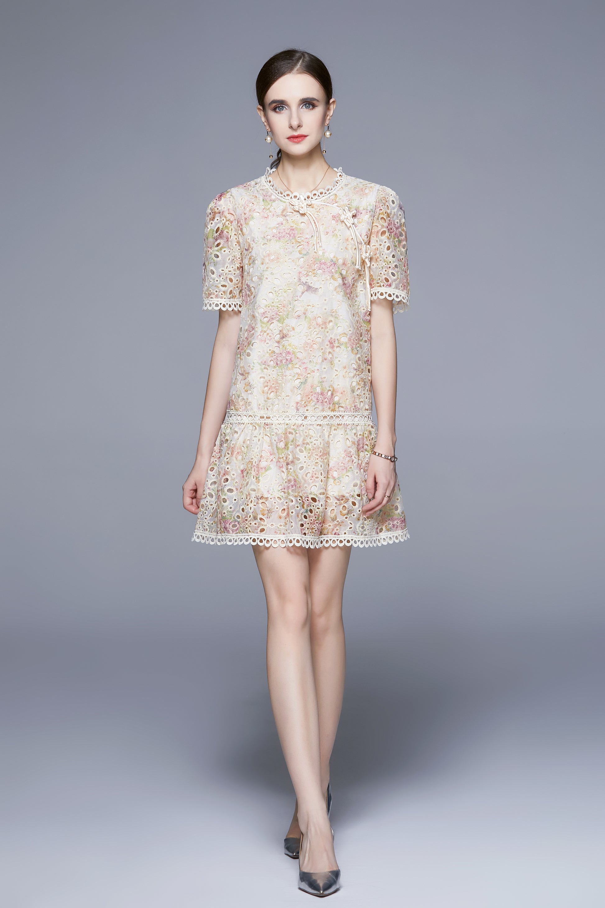 • Features: Hollowed-out design, short sleeves, round neckline, embroidered, Low-waist,lace trim,button closure,summer short dress.
