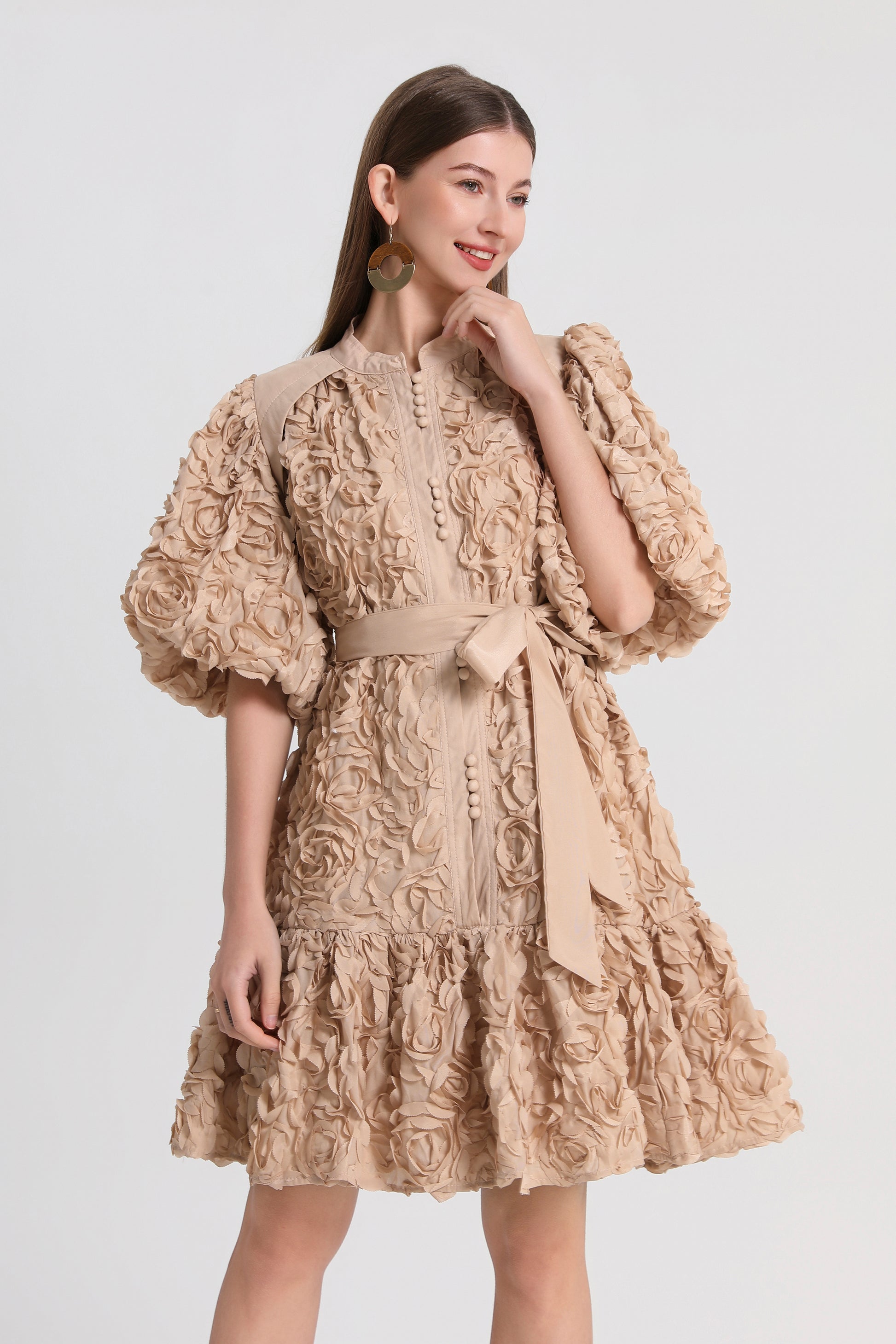 - Features: Front buttons, 3D flowers, belt, puff sleeves, loose, mini dress.