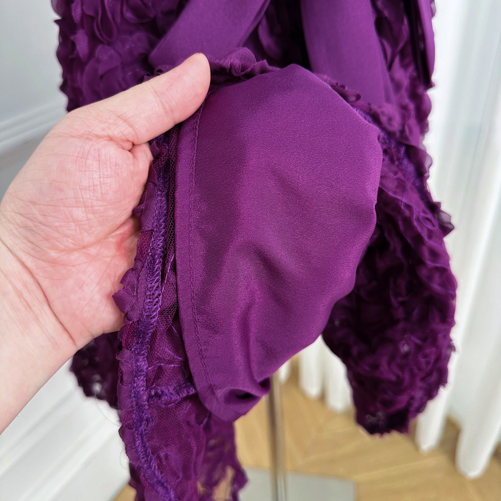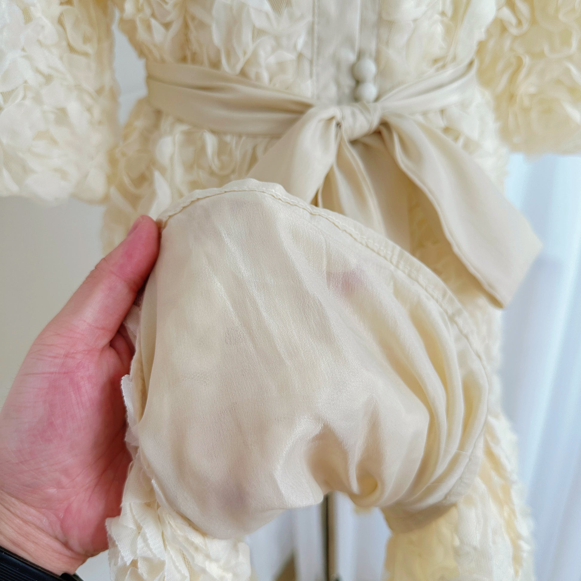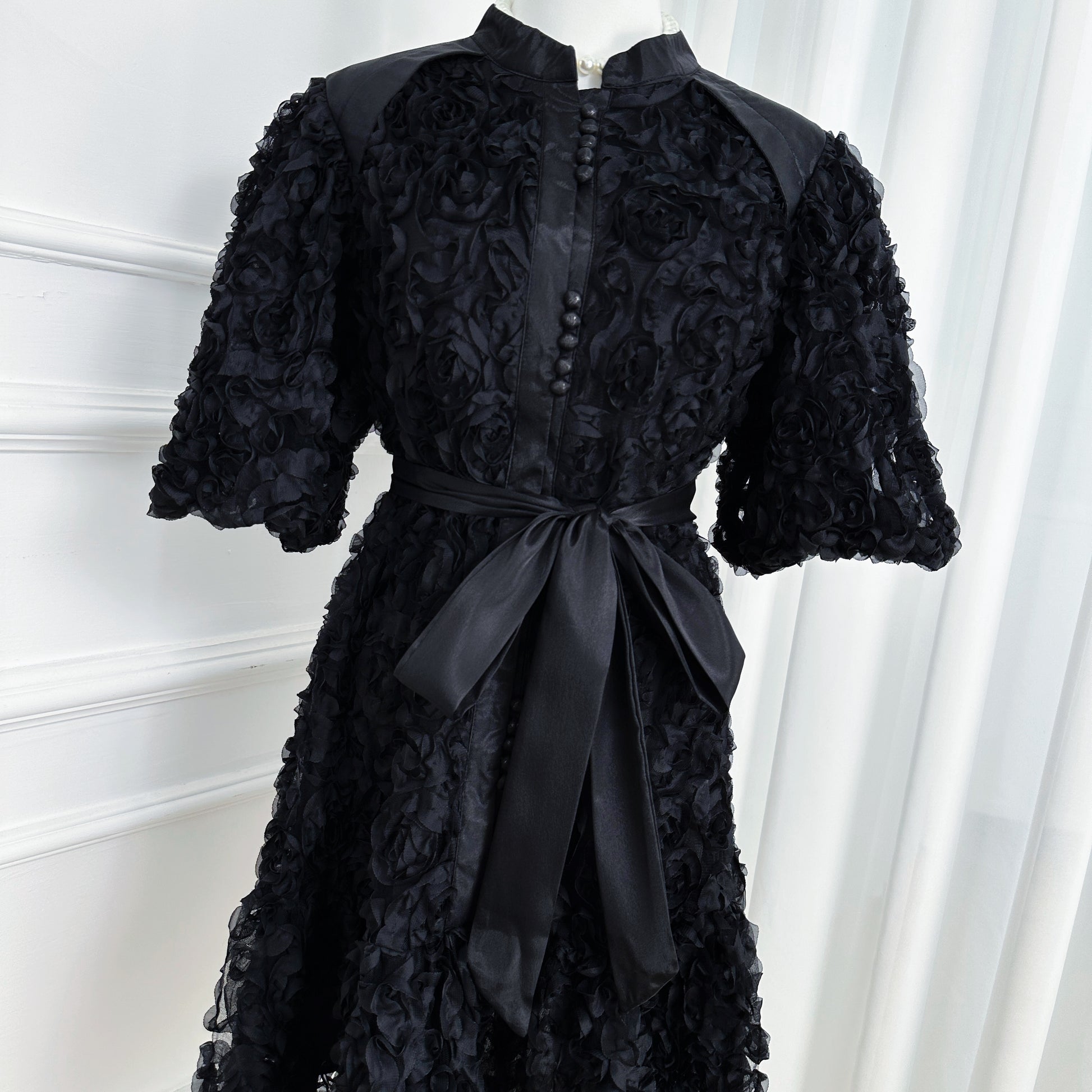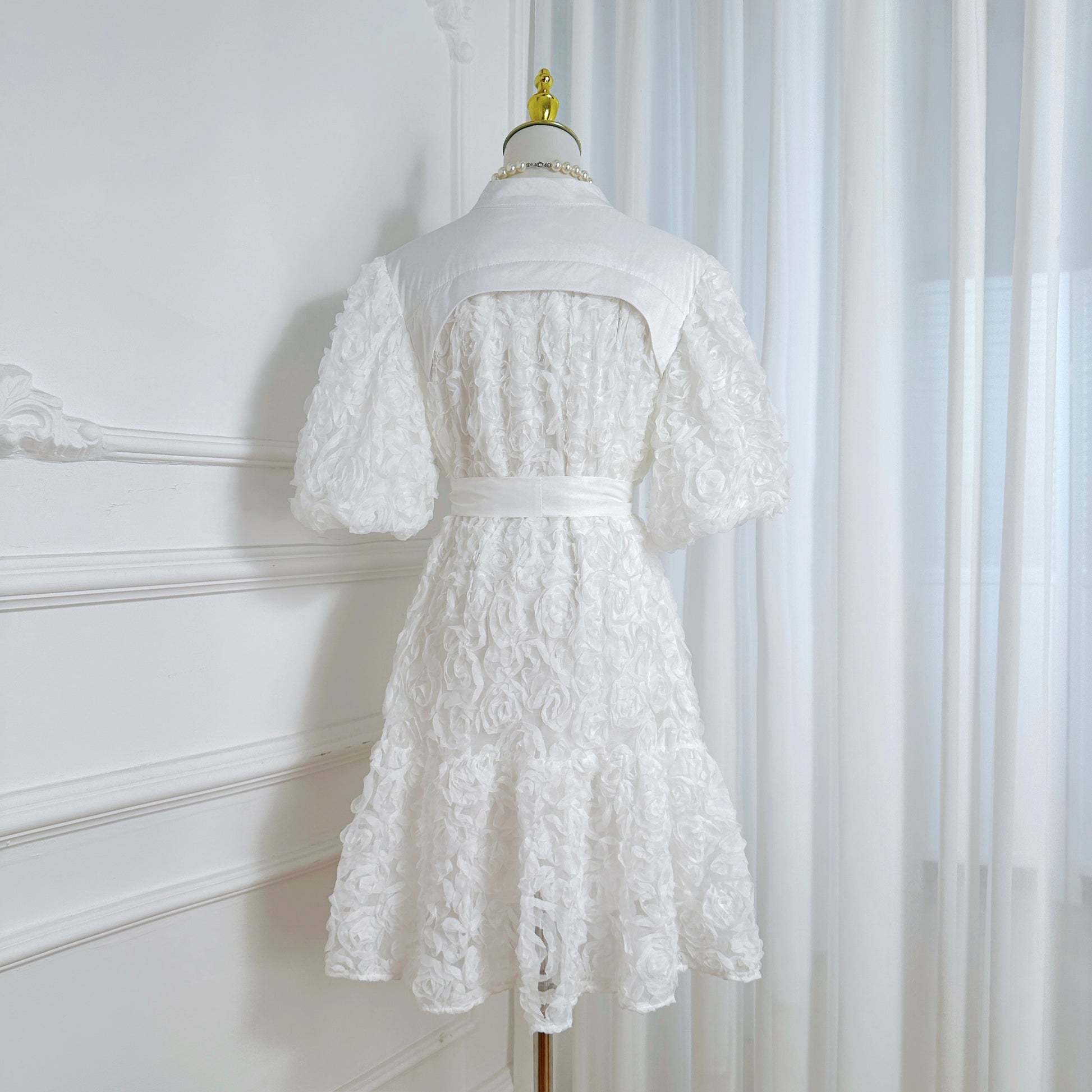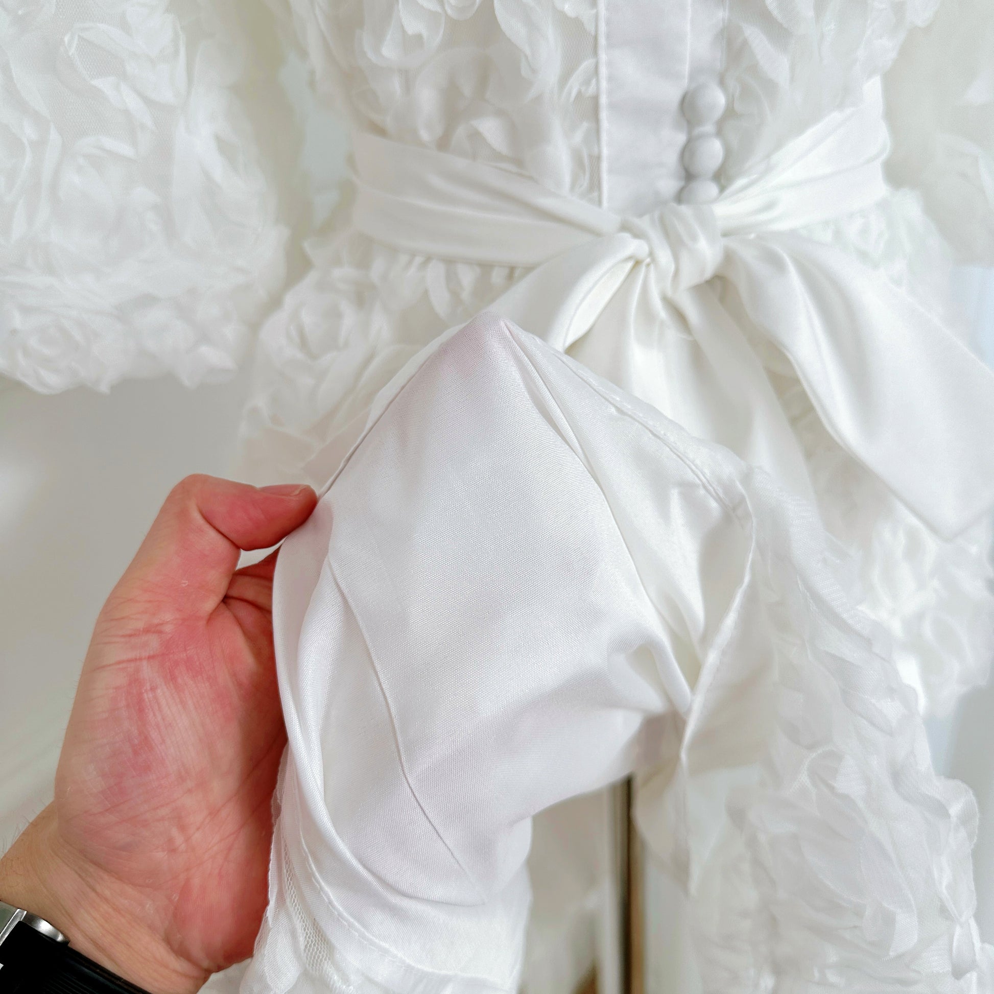 - Design: The whole body is decorated with 3D flowers, which enhances the three-dimensional effect and visual impact of the dress, making the overall design more vivid and interesting. The exaggerated puff sleeve design not only accentuates the arm lines but also highlights the slender waist.