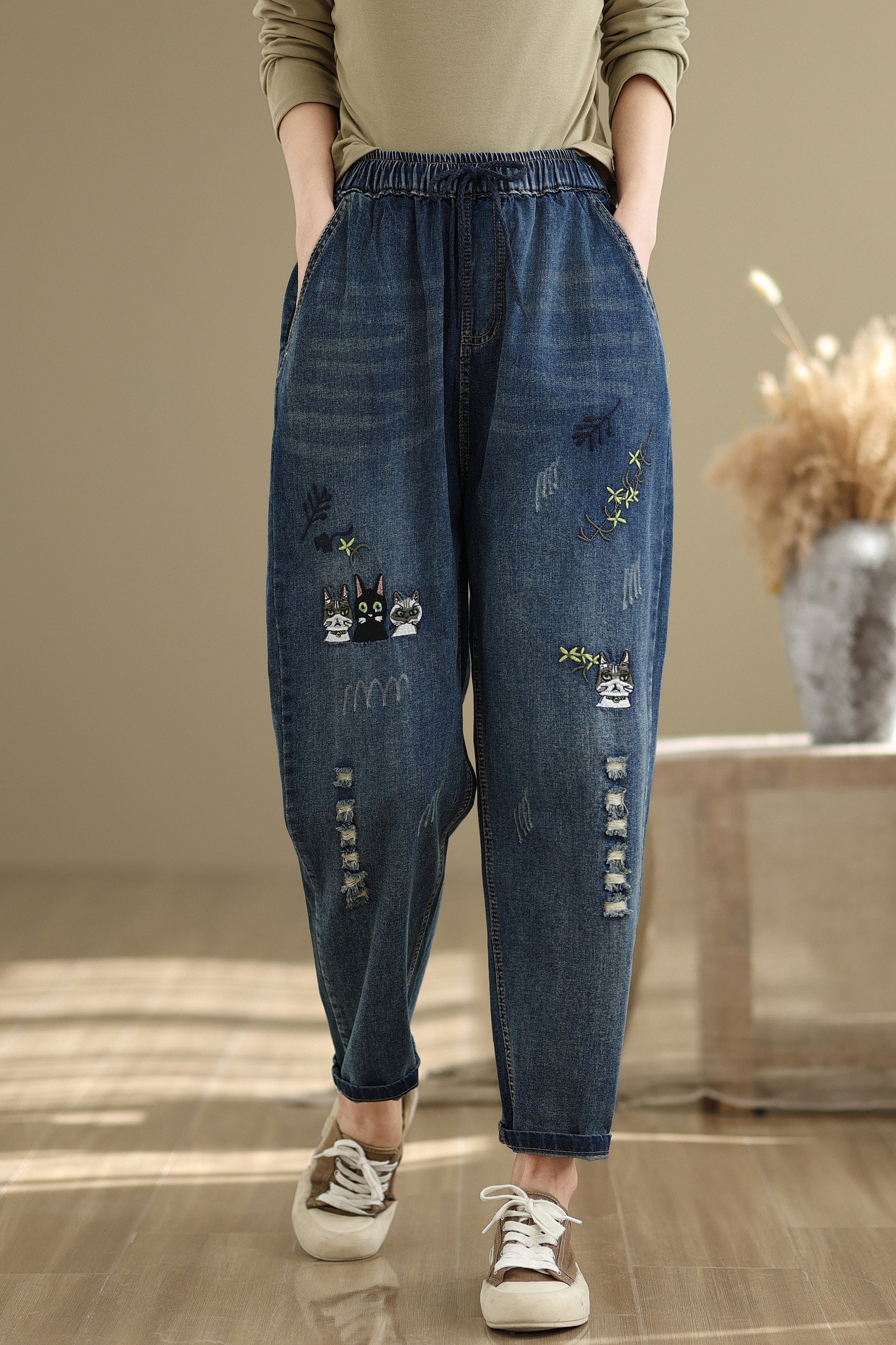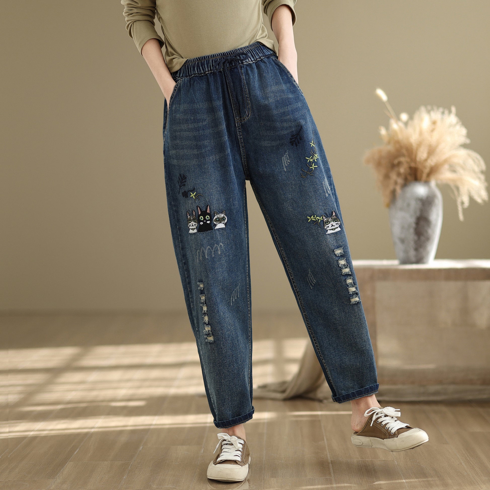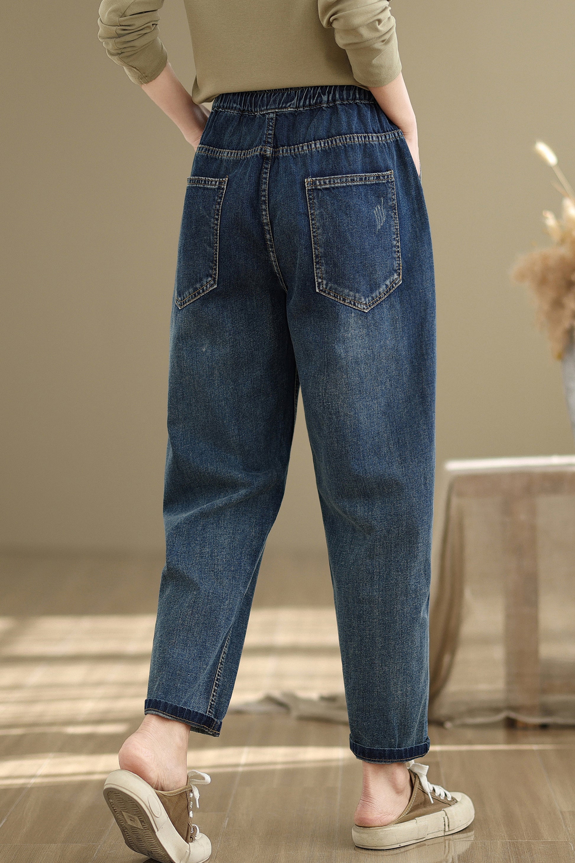 Women Jeans Denim Loose Pants Elastic Waist with Pocket