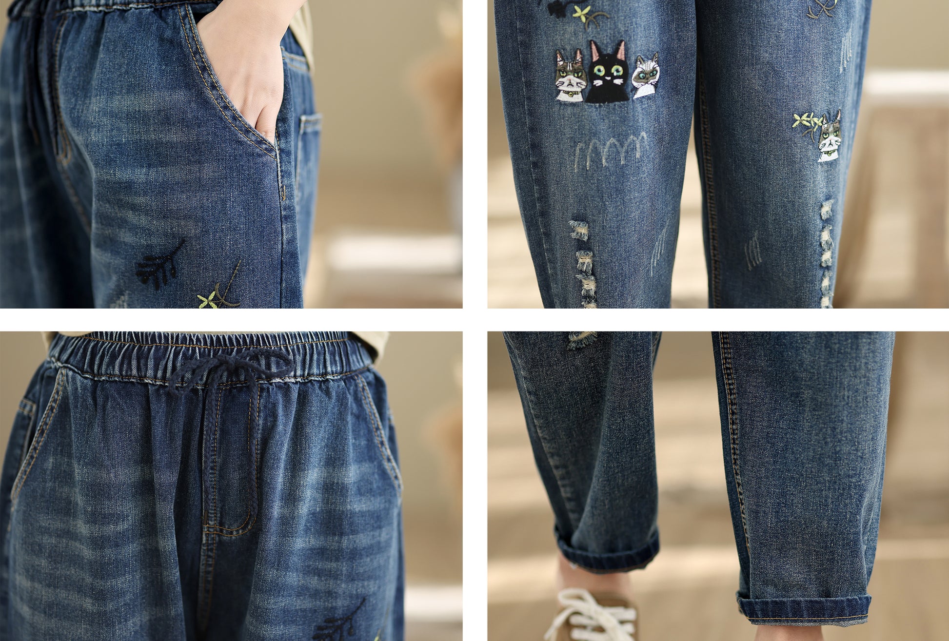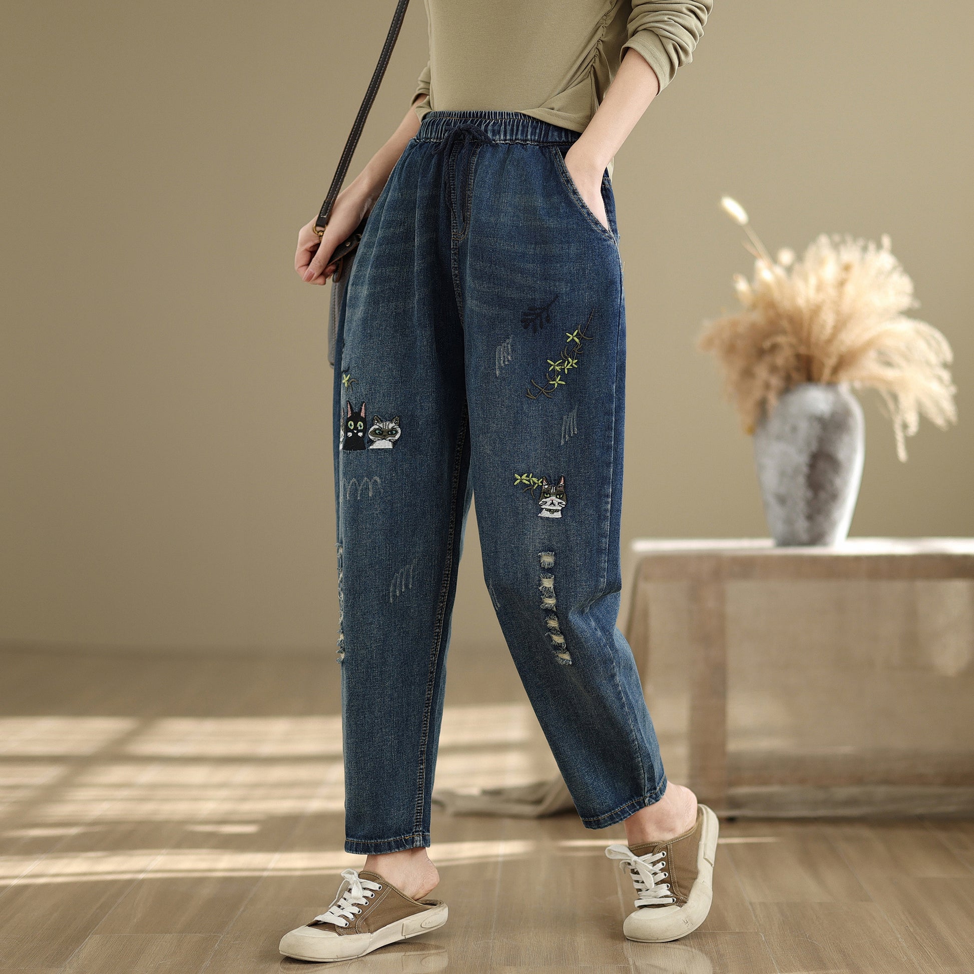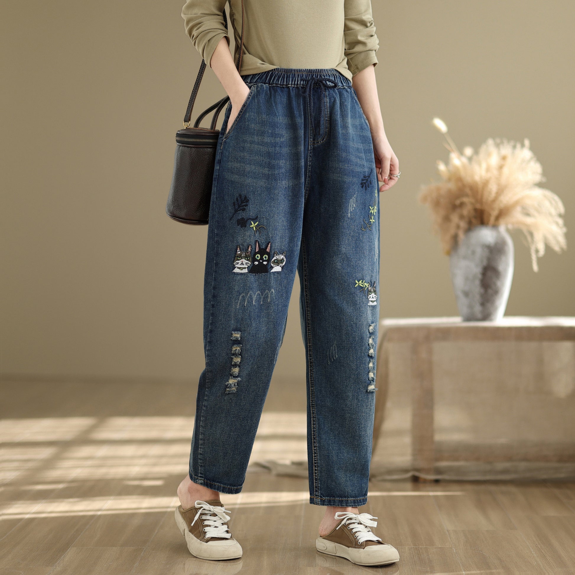 Women Jeans Denim Loose Pants Elastic Waist with Pocket