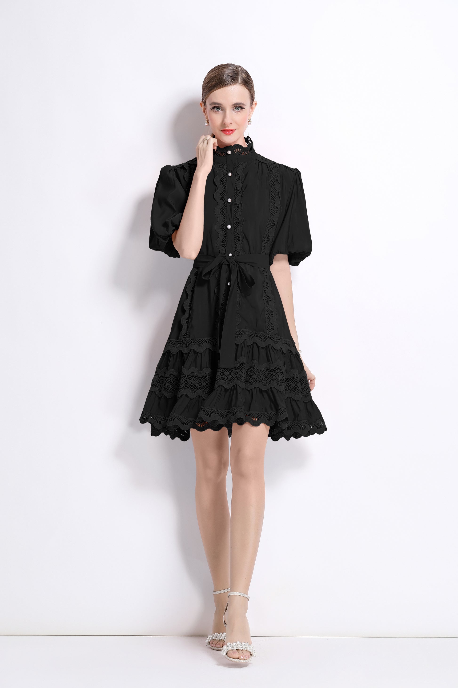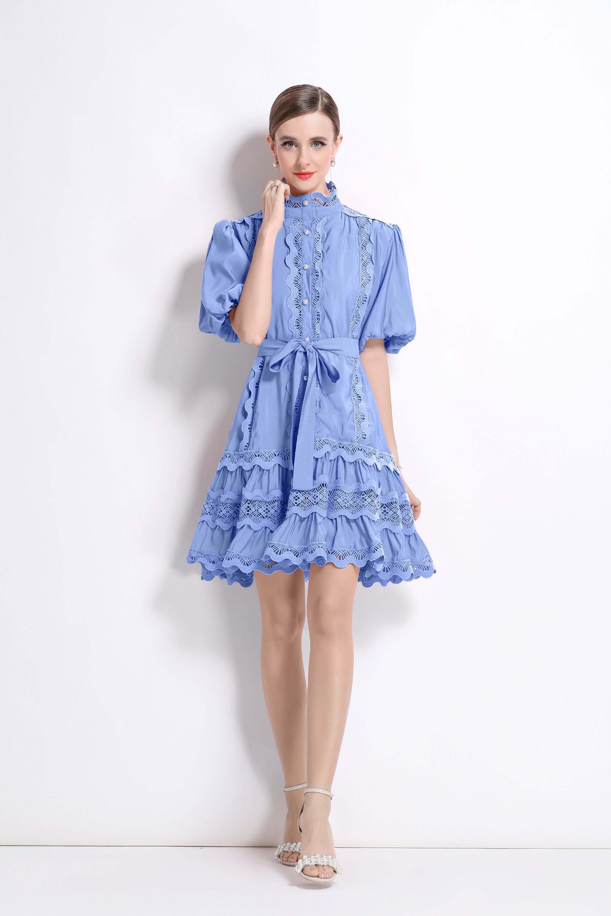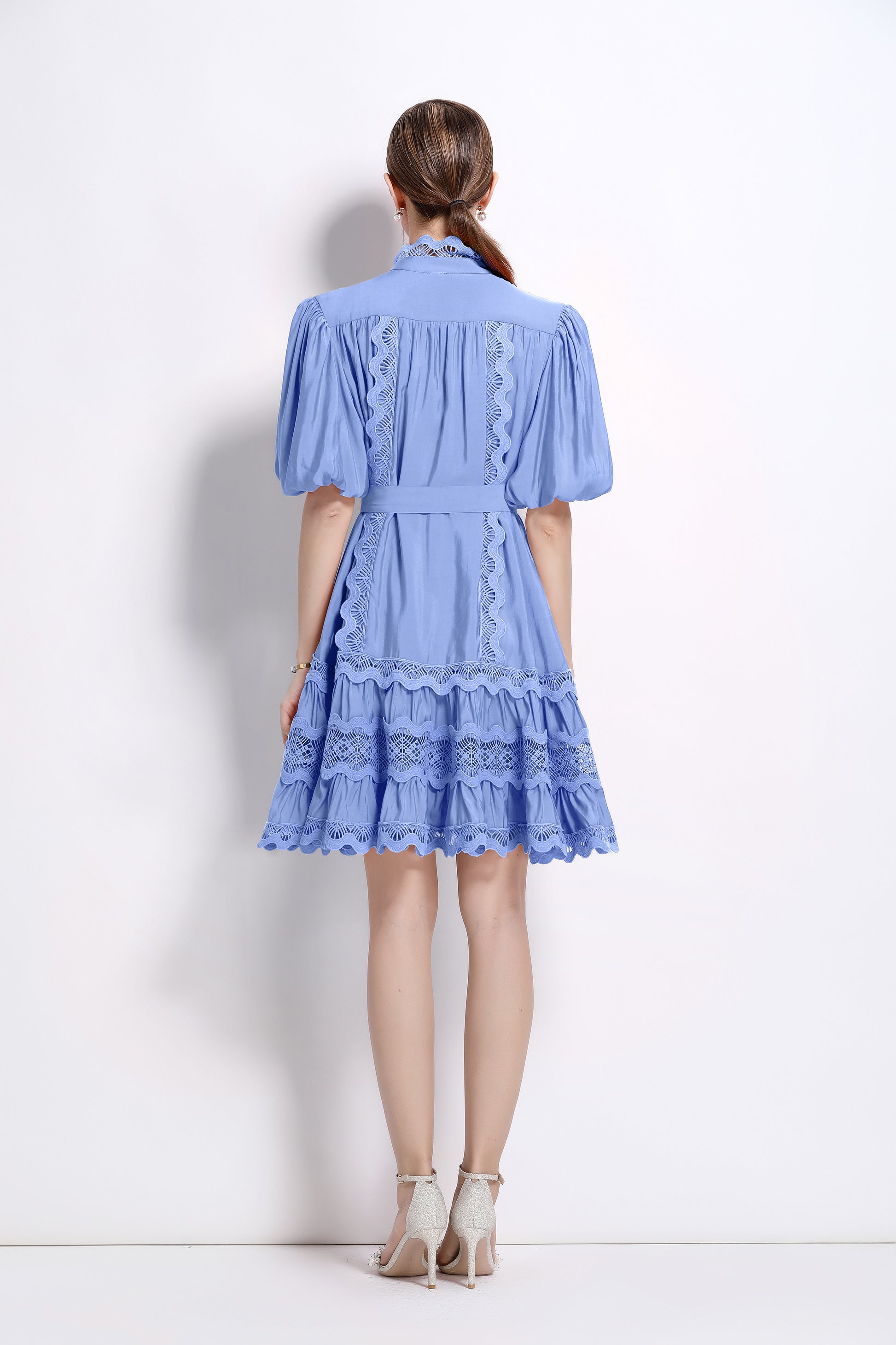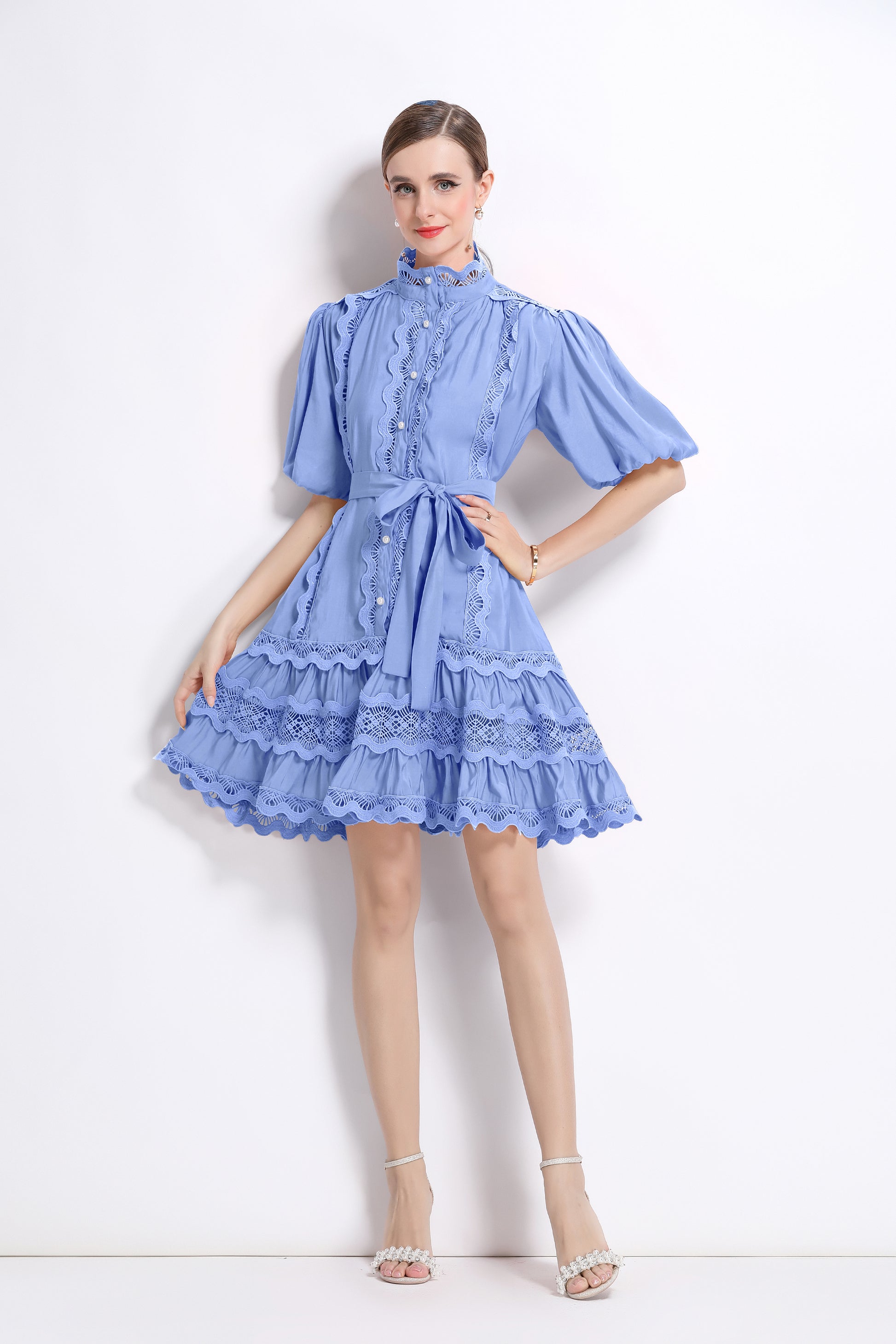 - Features: Hollowed-out, lace patchwork, Mock Neck, front buttons, ruffles, pleats, belt, puffed sleeves, loose fit