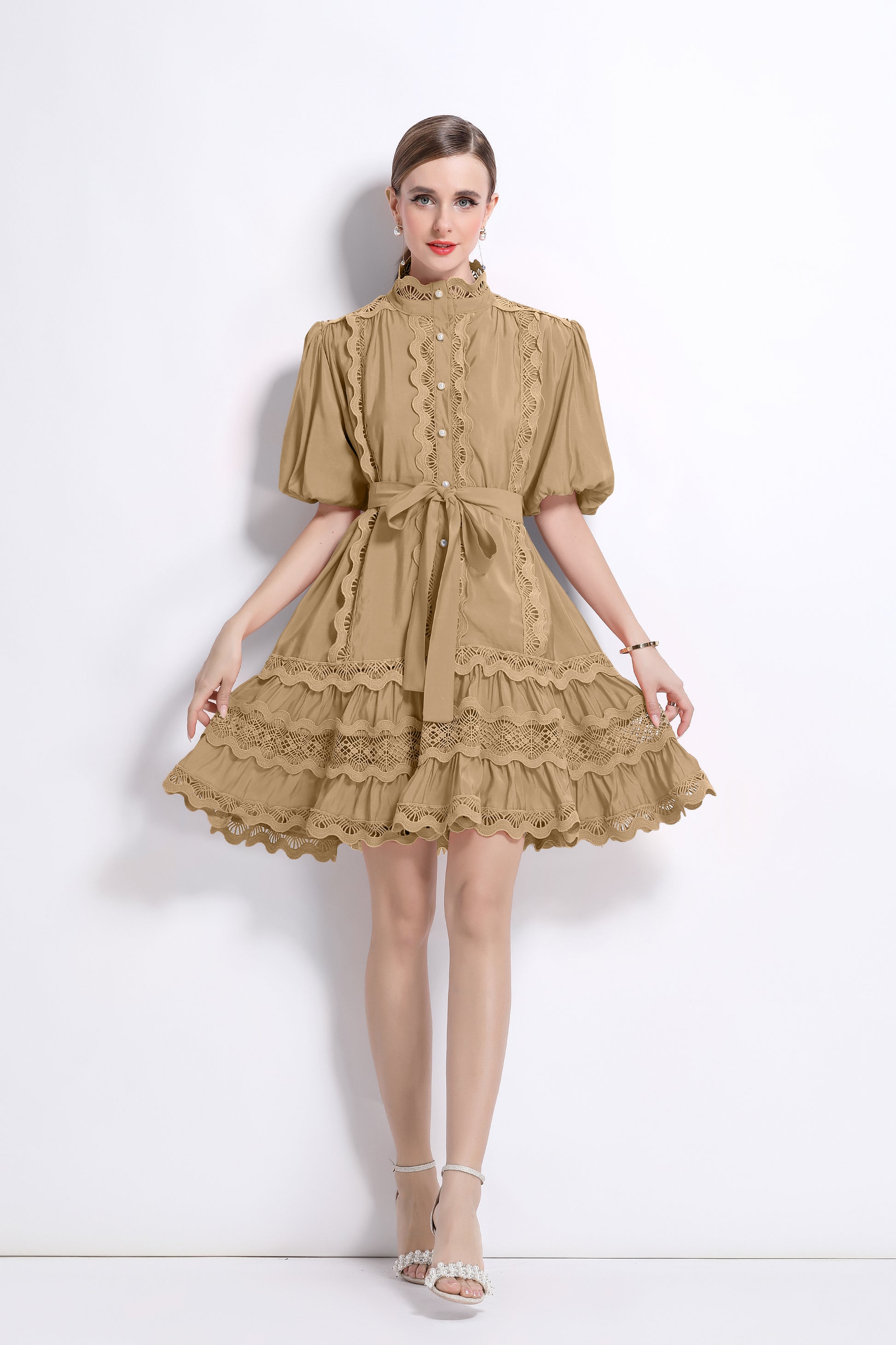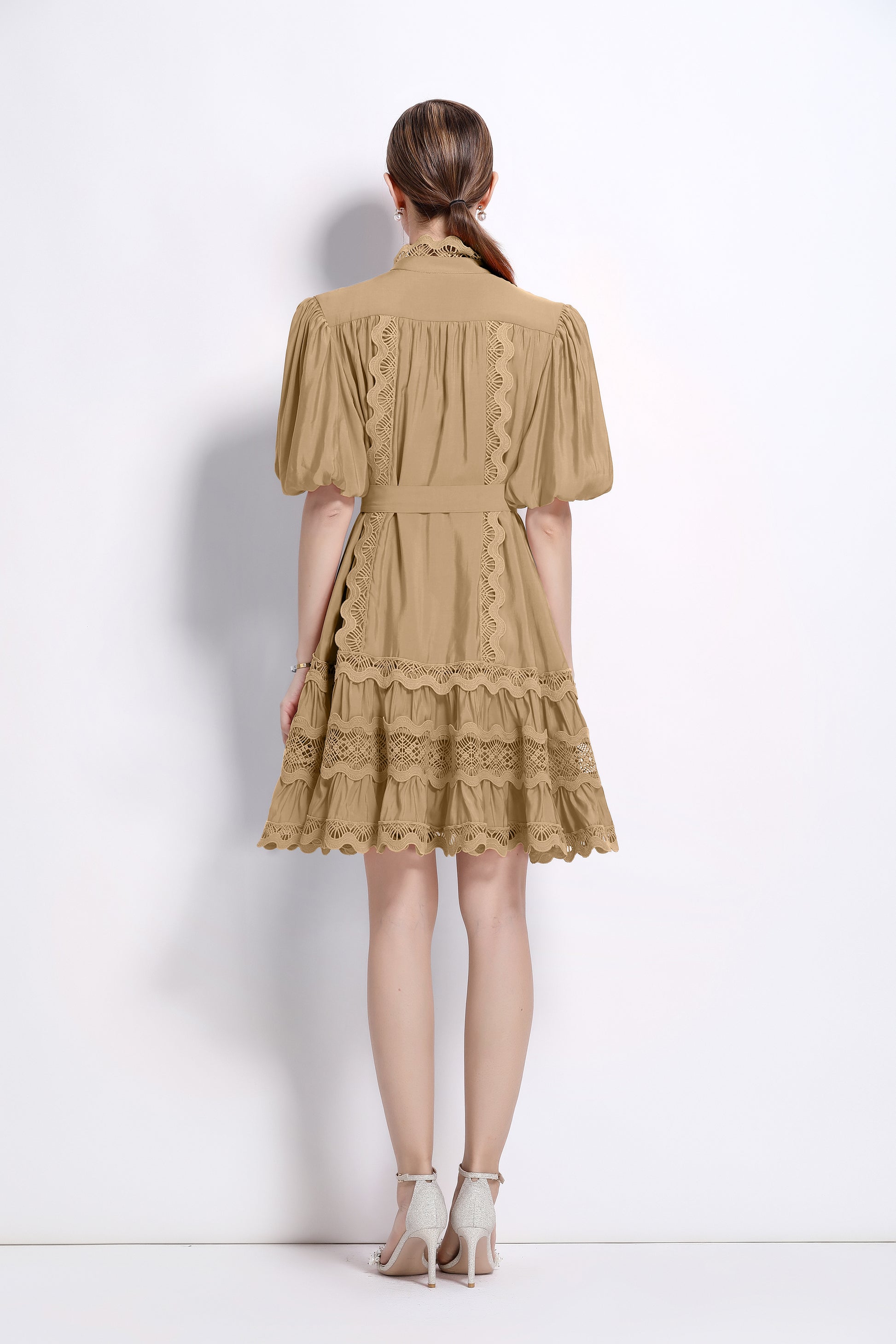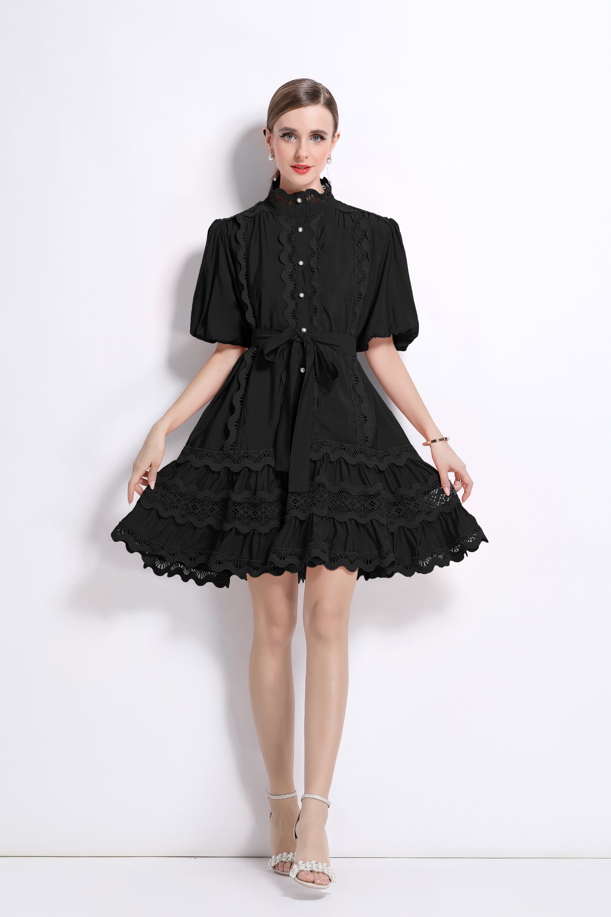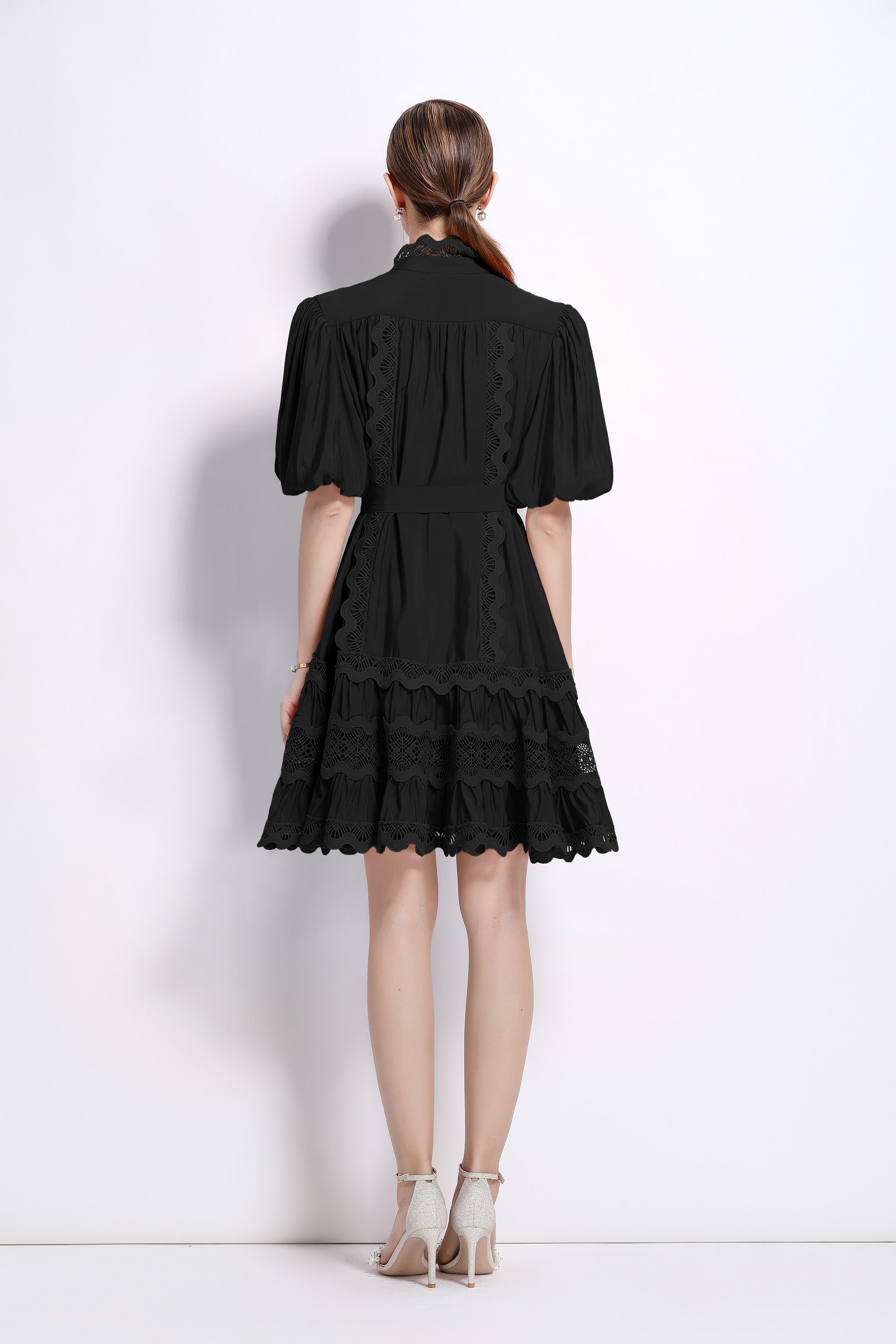 - Features: Hollowed-out, lace patchwork, Mock Neck, front buttons, ruffles, pleats, belt, puffed sleeves, loose fit