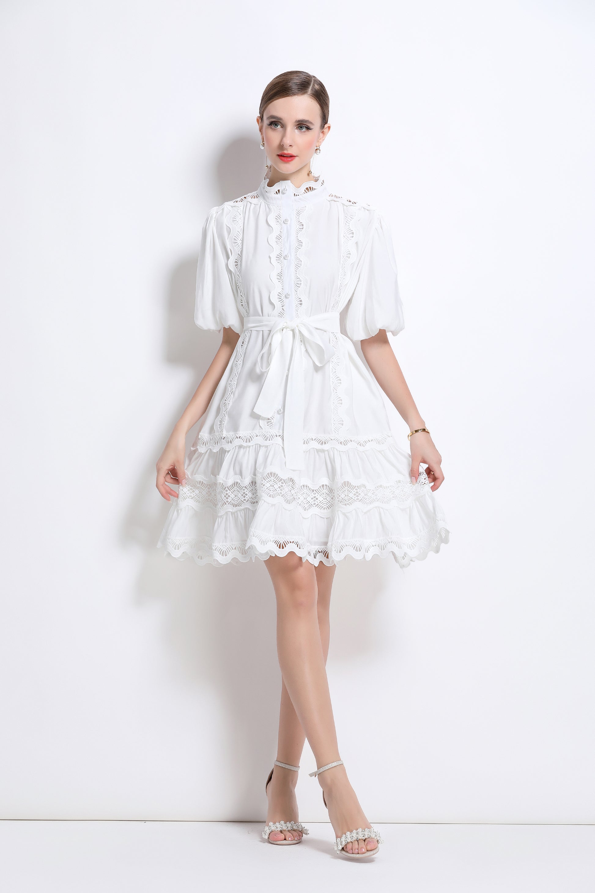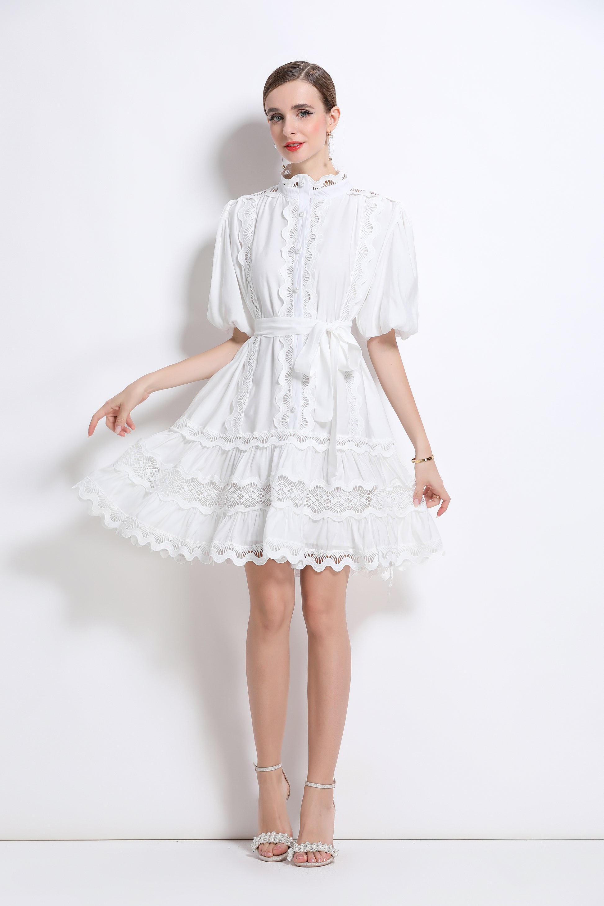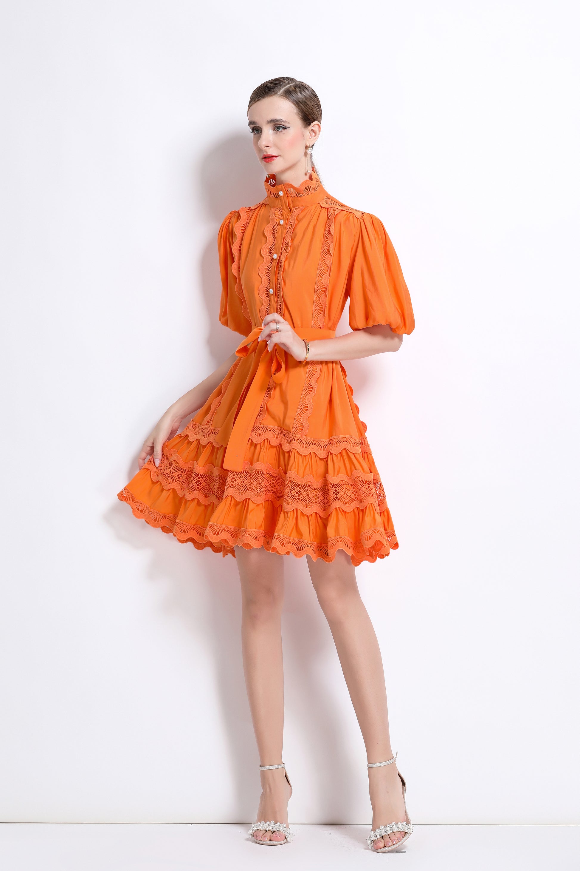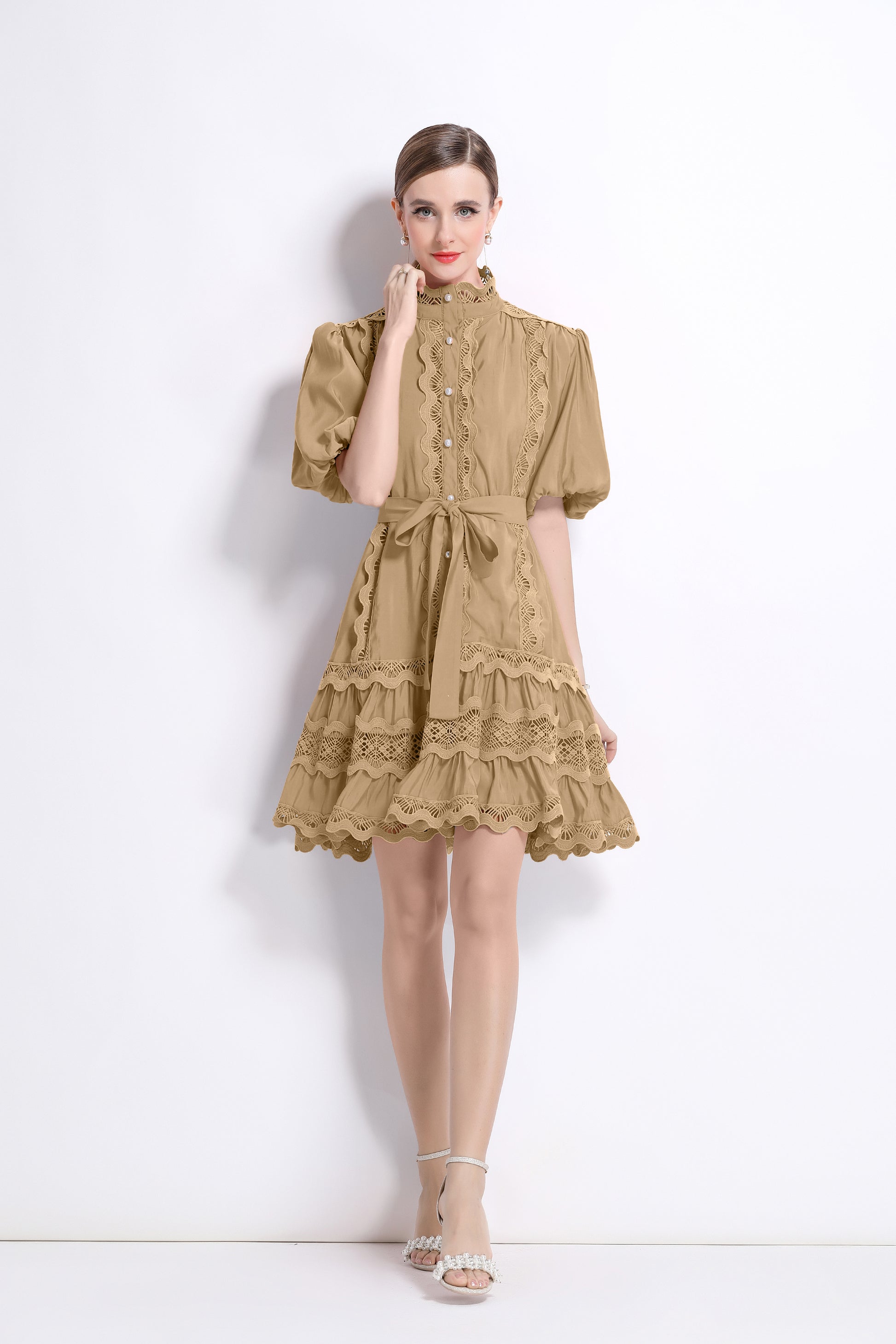 - Features: Hollowed-out, lace patchwork, Mock Neck, front buttons, ruffles, pleats, belt, puffed sleeves, loose fit