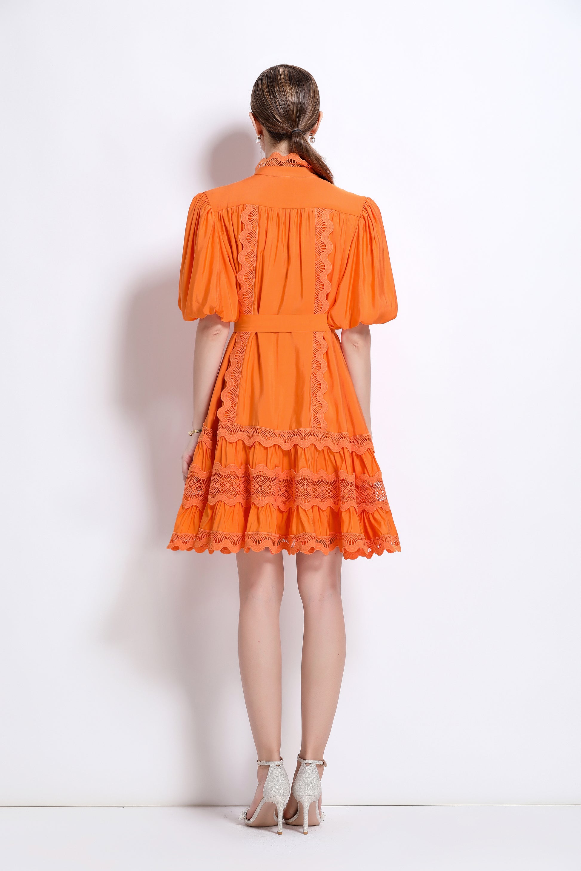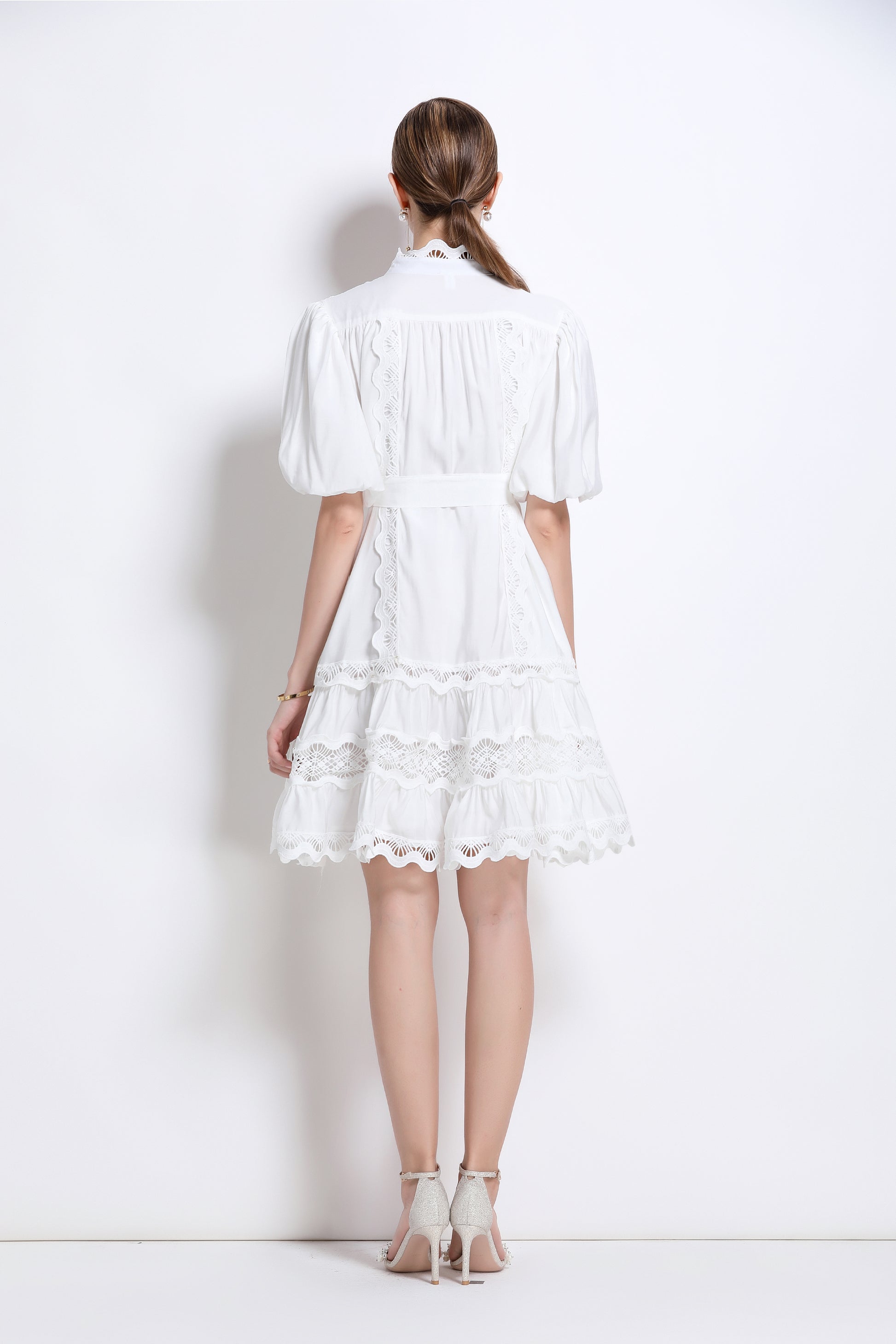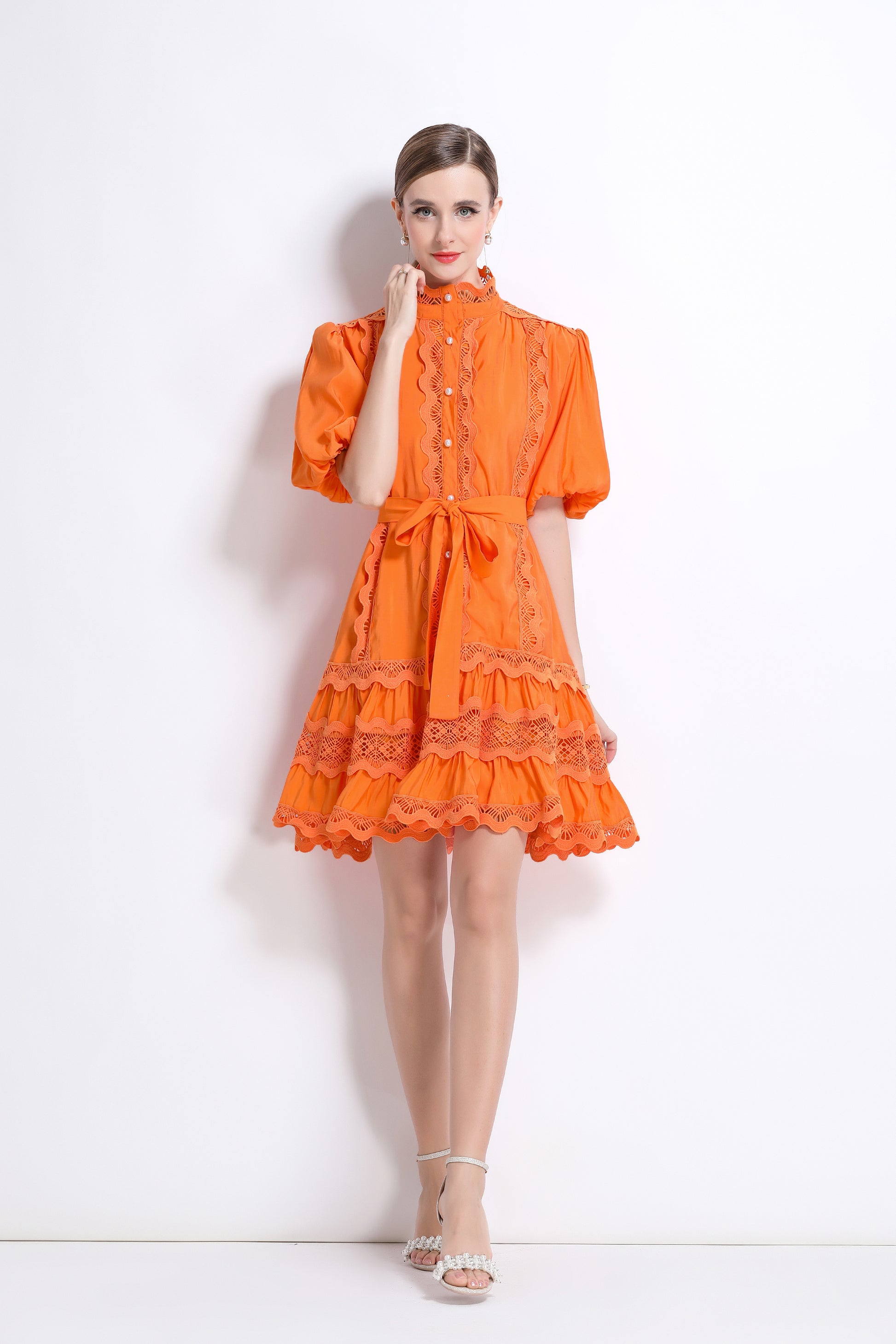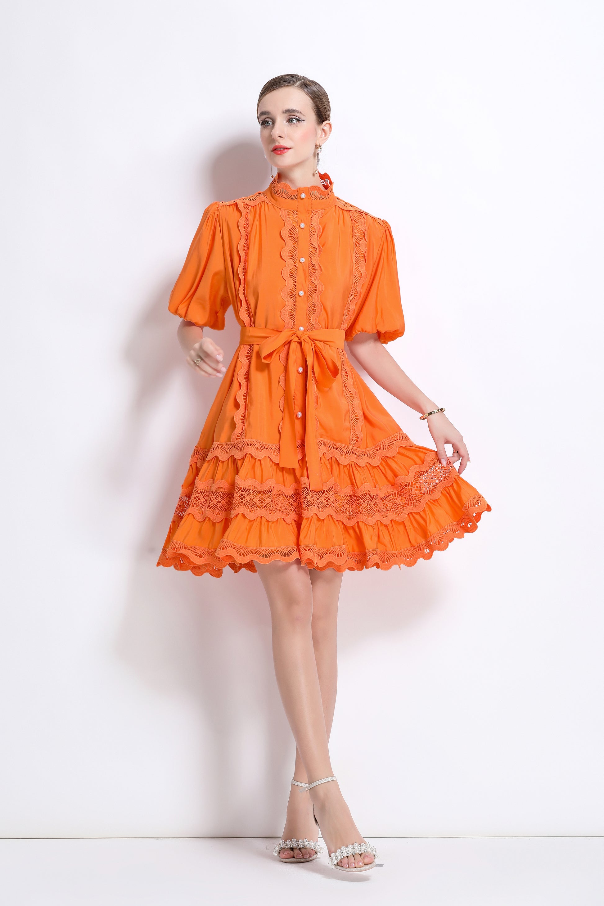 - Features: Hollowed-out, lace patchwork, Mock Neck, front buttons, ruffles, pleats, belt, puffed sleeves, loose fit