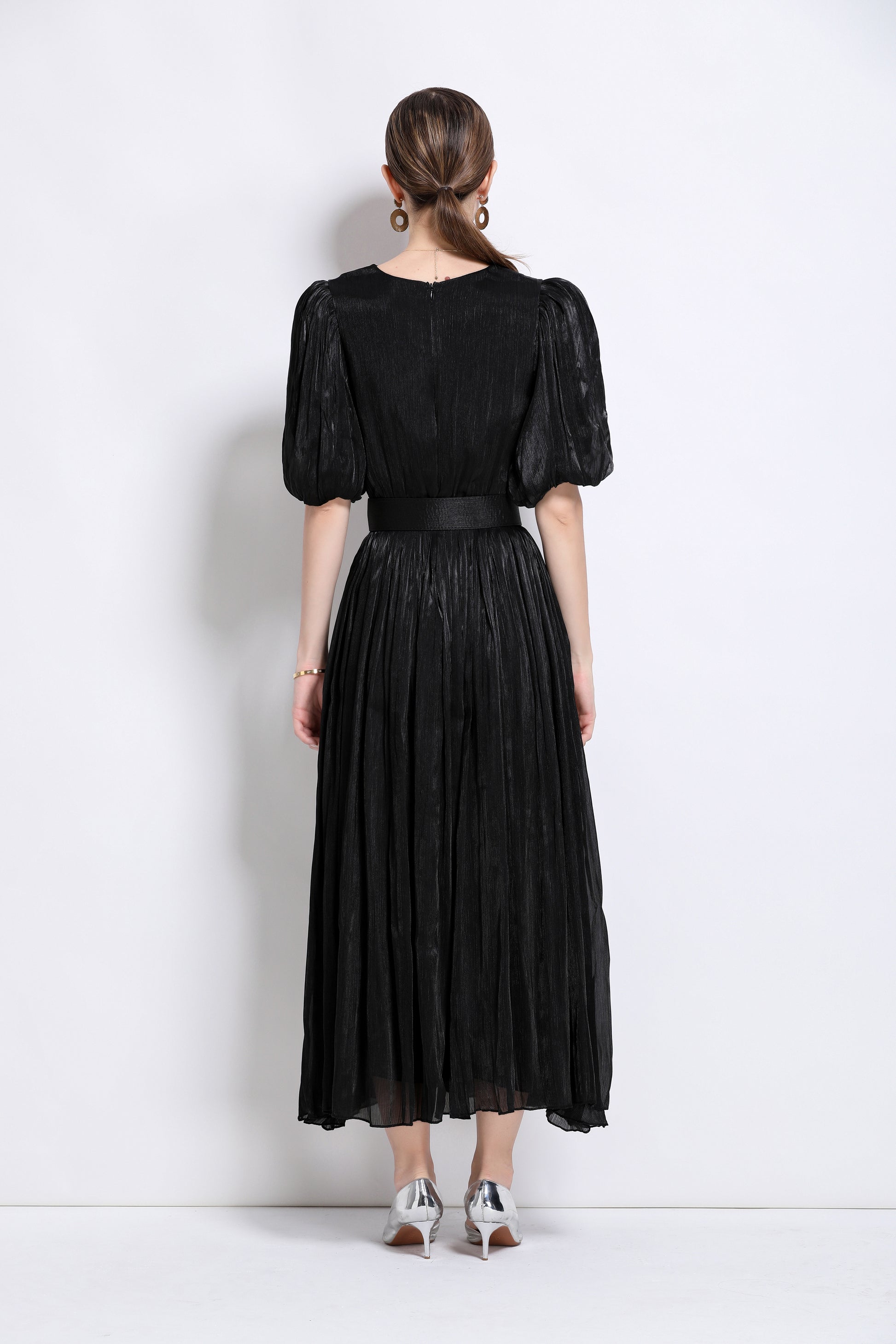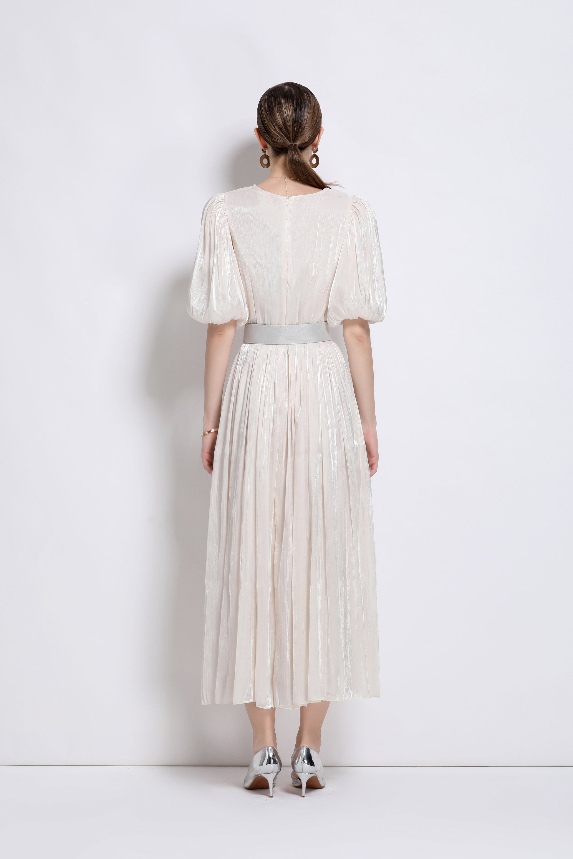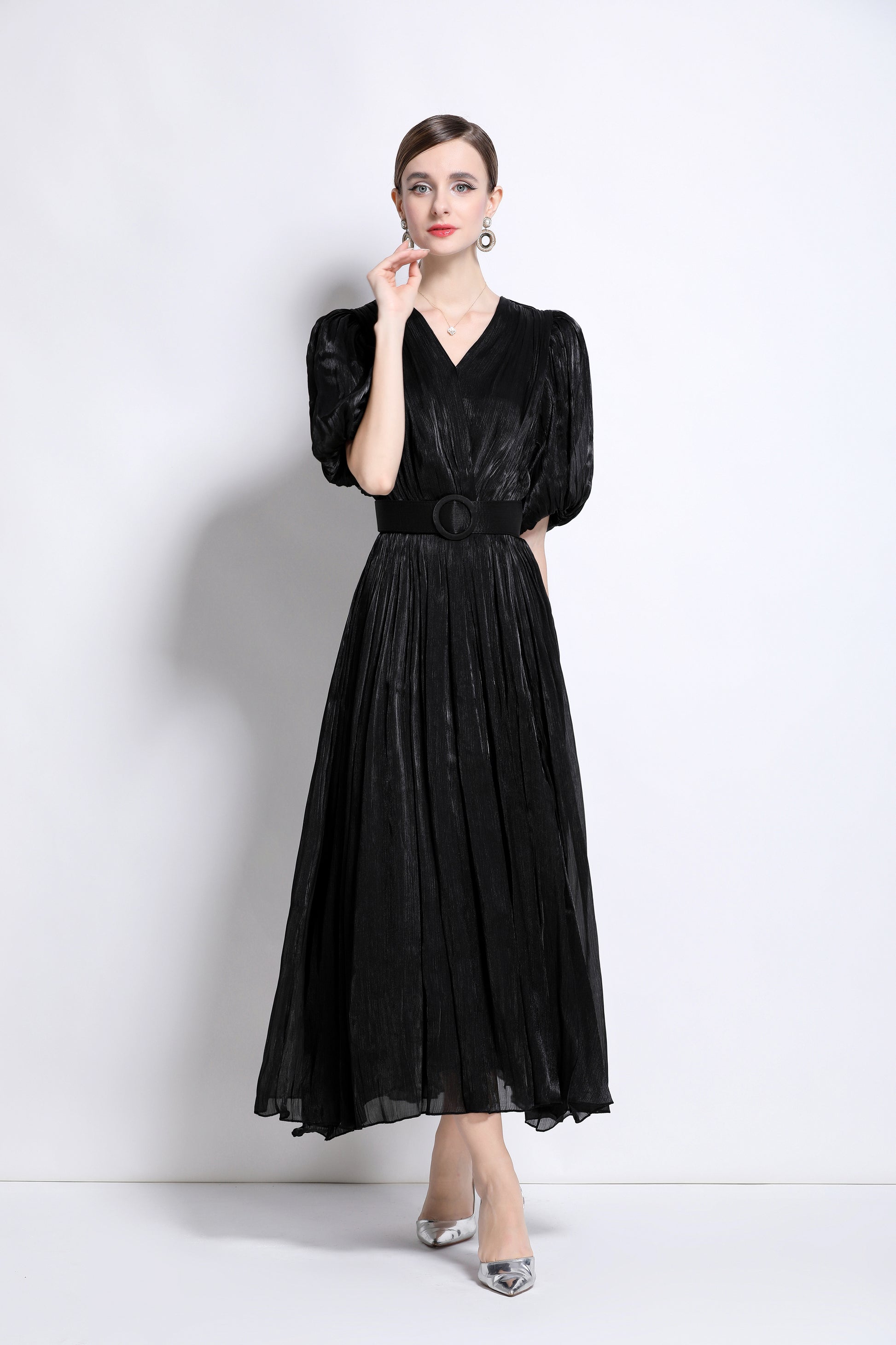 - Features: Puffed sleeves, pleats, side slits, V-neck, waistband, back zipper. The use of glossy fabric makes it more dazzling at night or under indoor lighting.