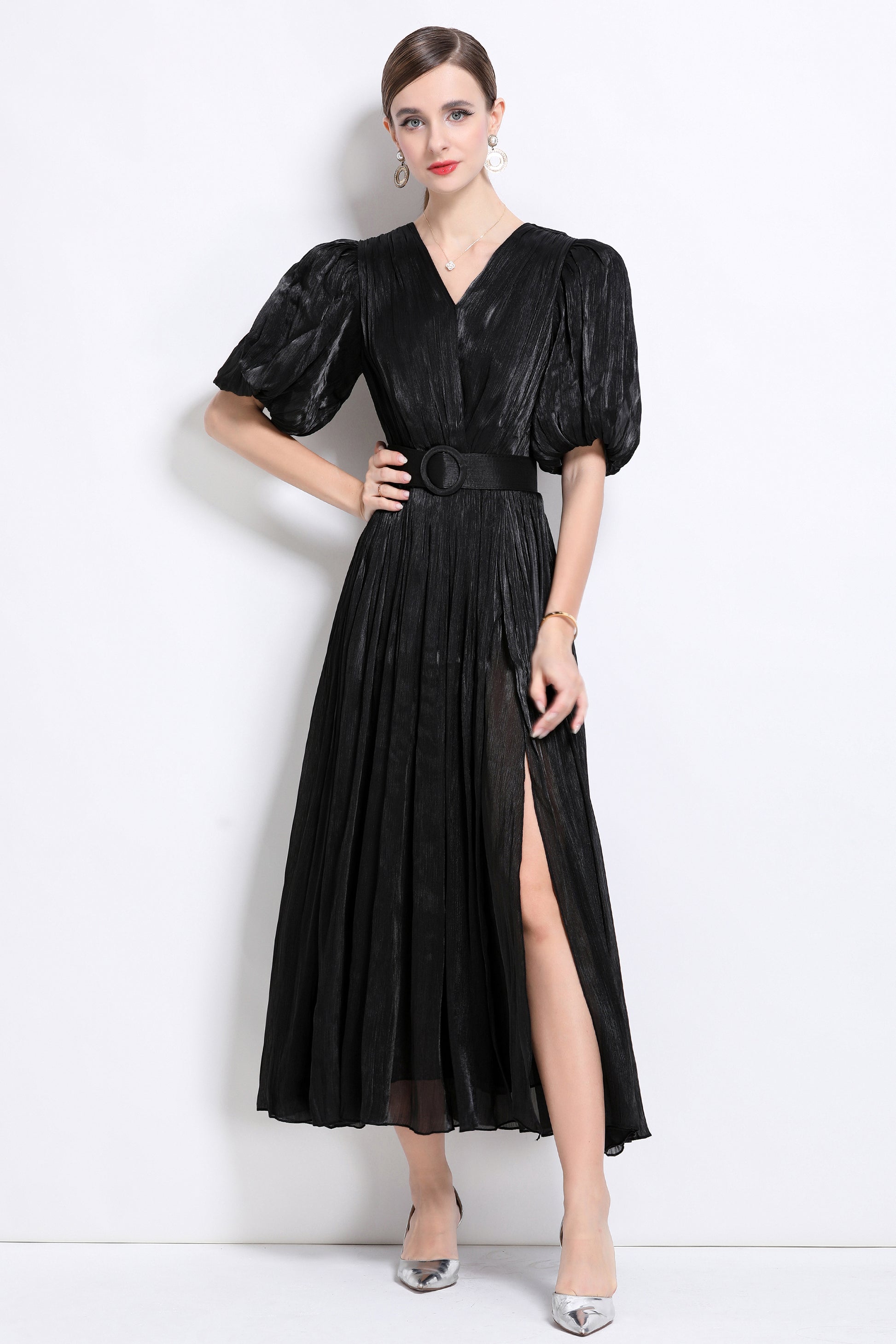 - Design: Made of lustrous fabric, it enhances the overall sense of luxury and fashion. The side-split design shows off the leg lines when walking, adding a touch of sexiness. The sleeves are designed as puffed sleeves, adding retro and romantic elements.