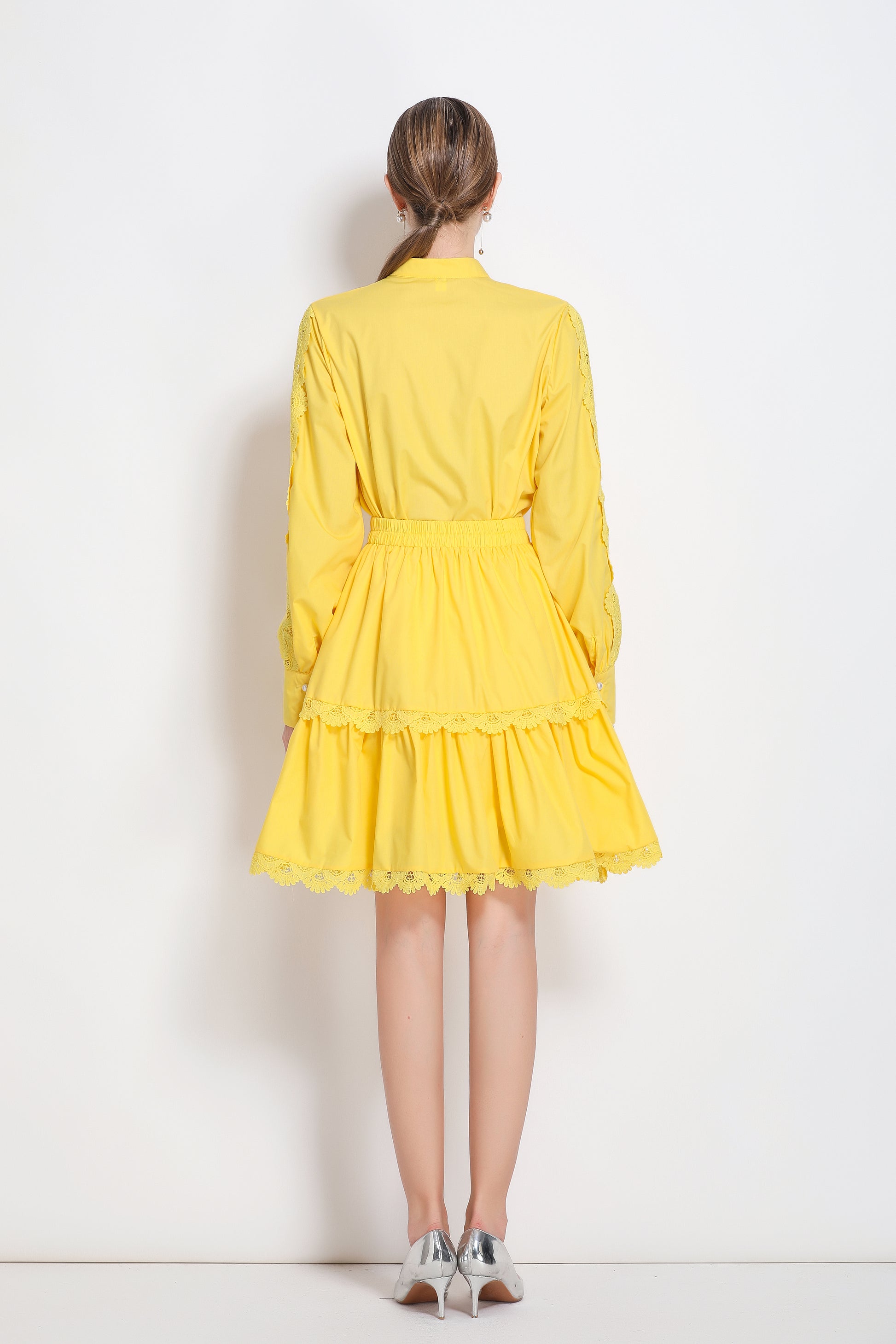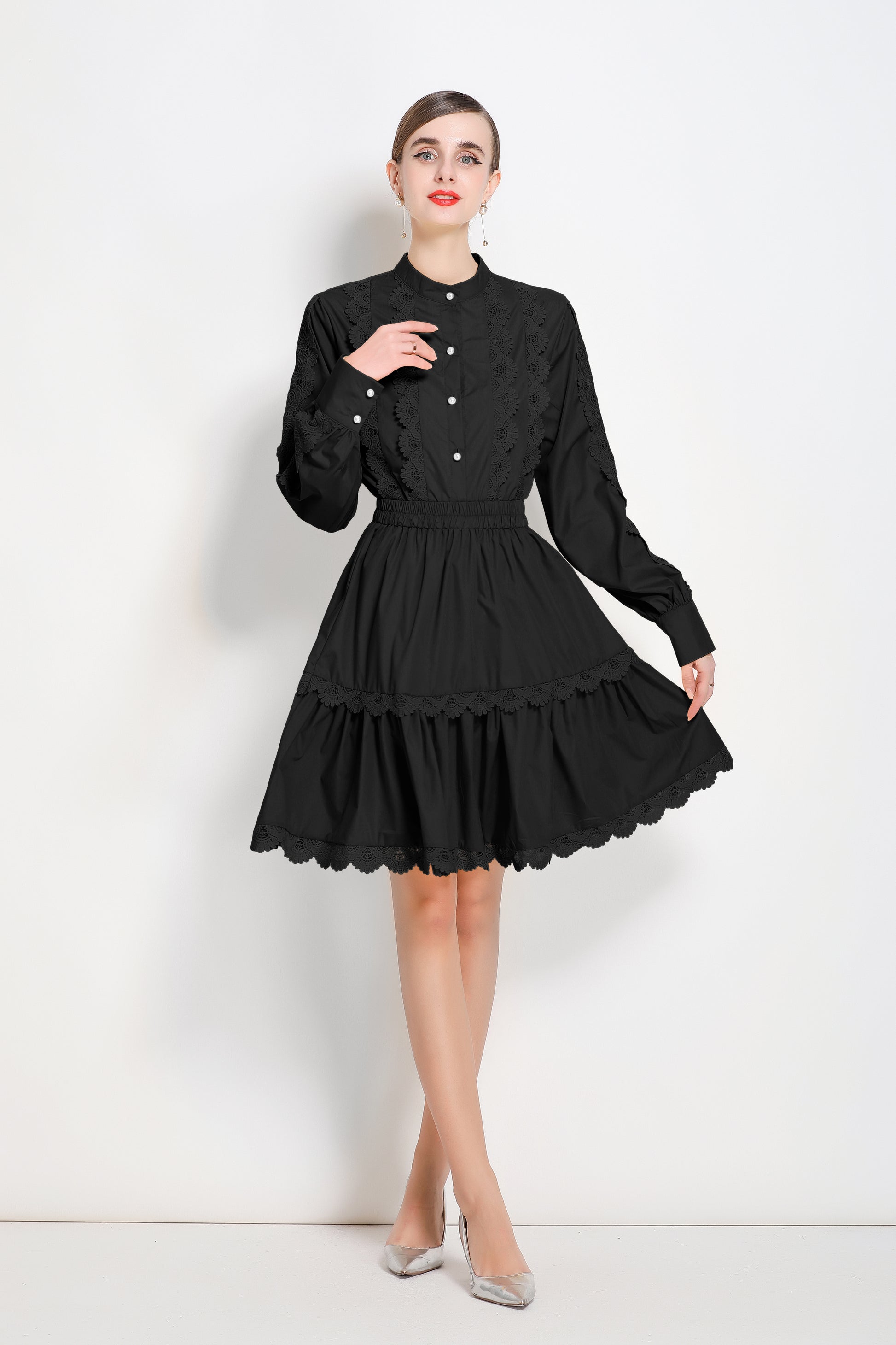 - Features: 2 Piece Skirt Set, stand-up collar, lace trim, lace hollow-out, ruffled design, elastic waist, Tiered hem, long sleeves, button-up top, short skirt.