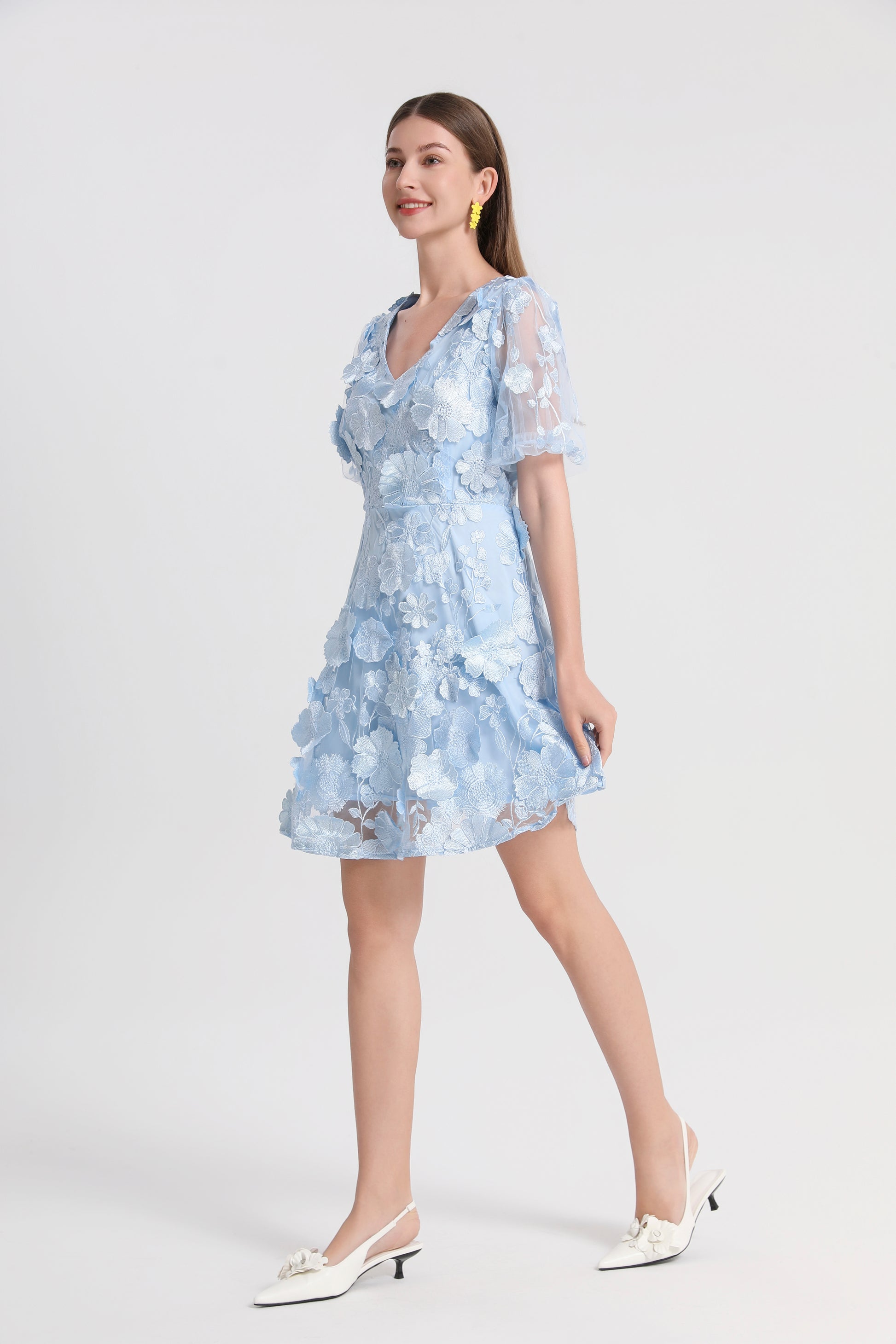 Women's 3D Floral V-Neck Lace Mesh Mini Dress