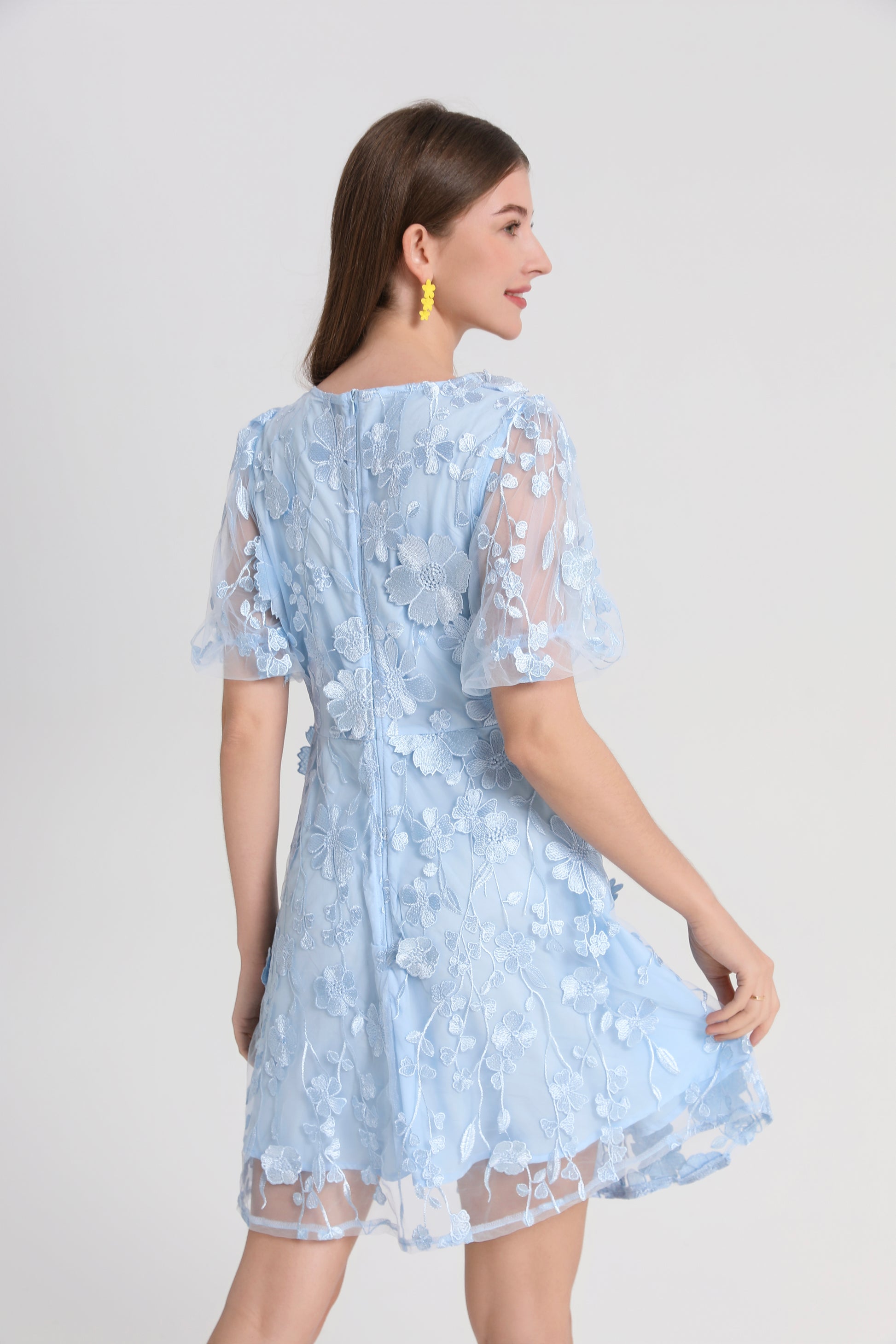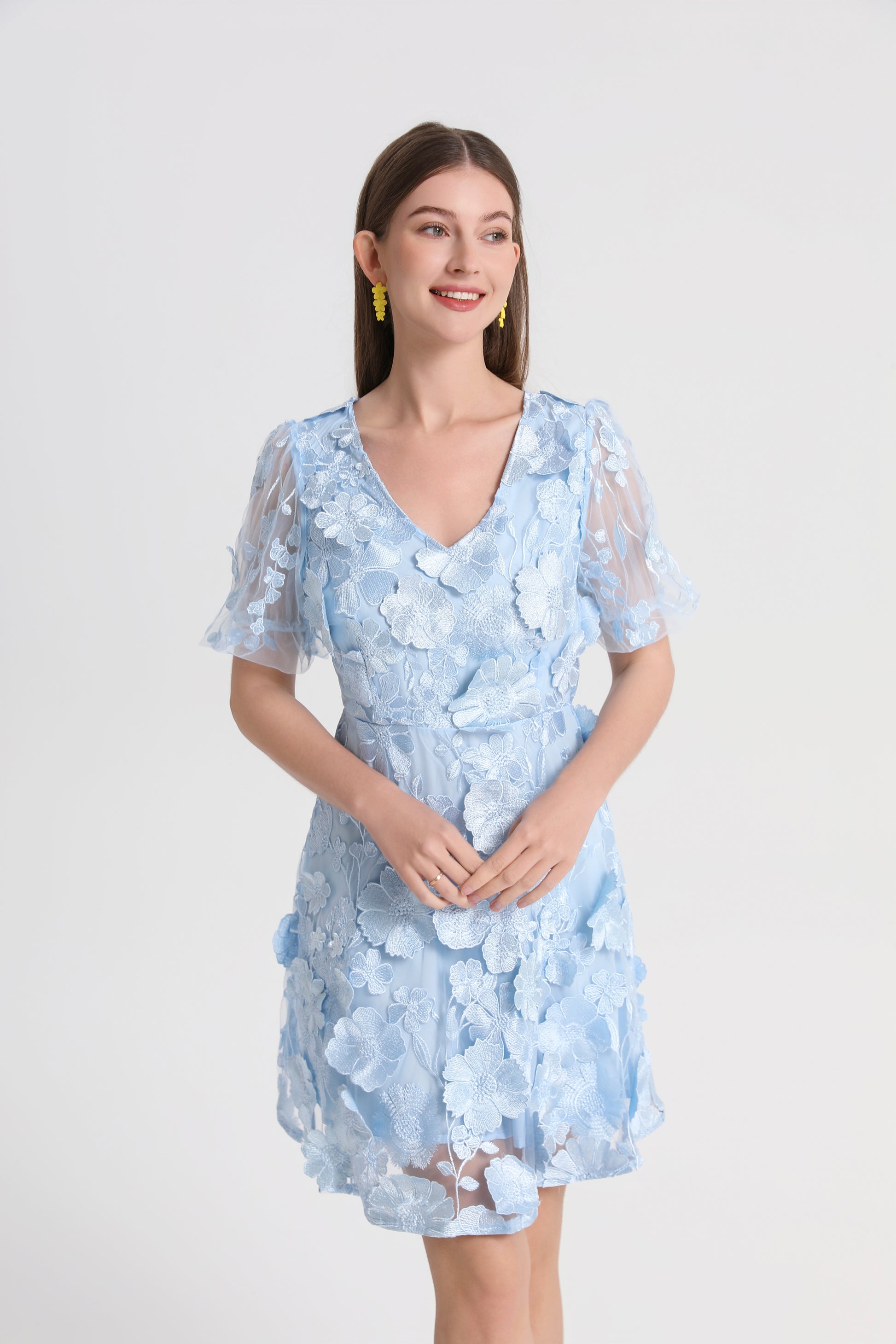 - Features: Mesh, 3D floral embroidery, puff sleeves, short sleeves, V-neck, back zipper, lining, a-line,mini dress.