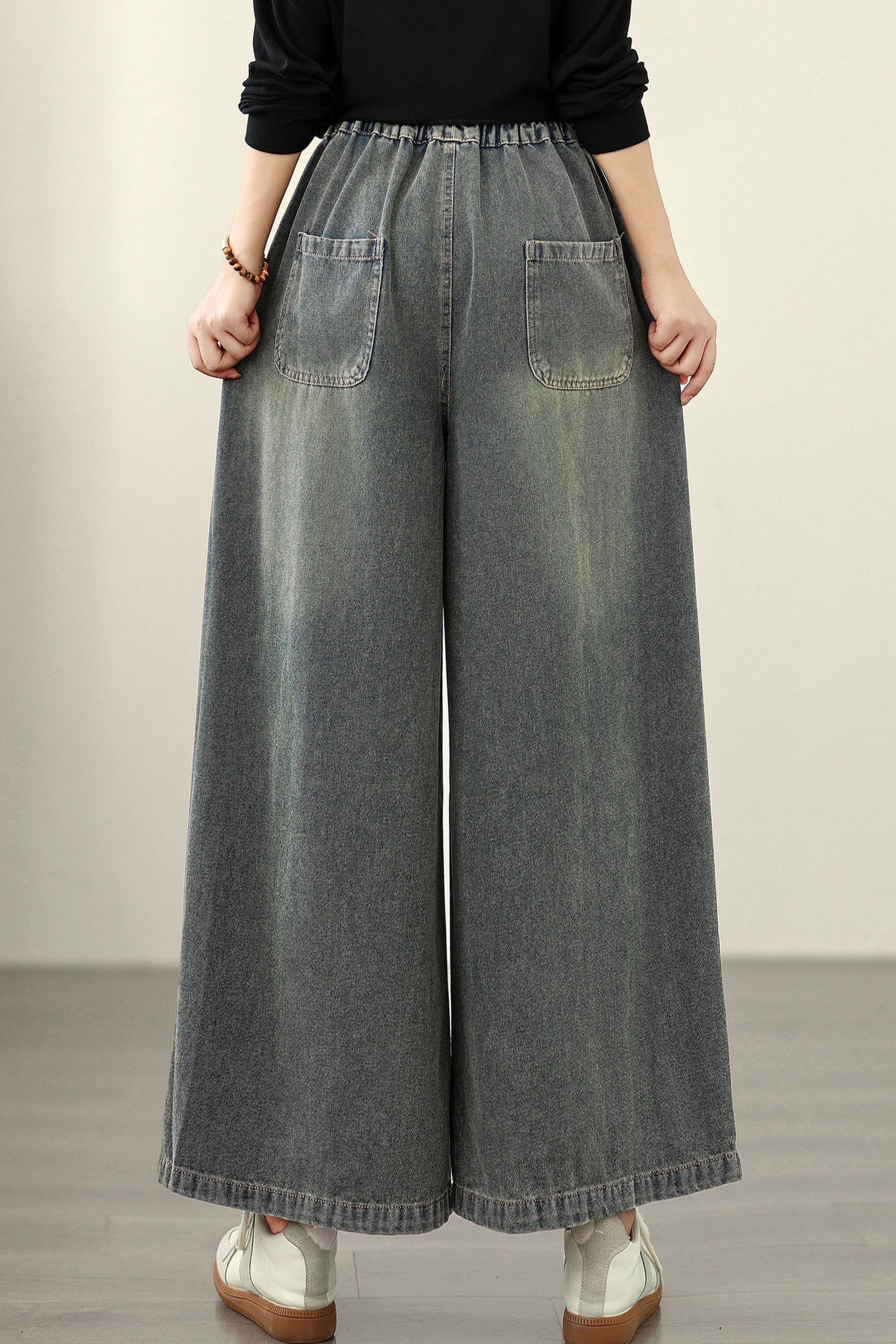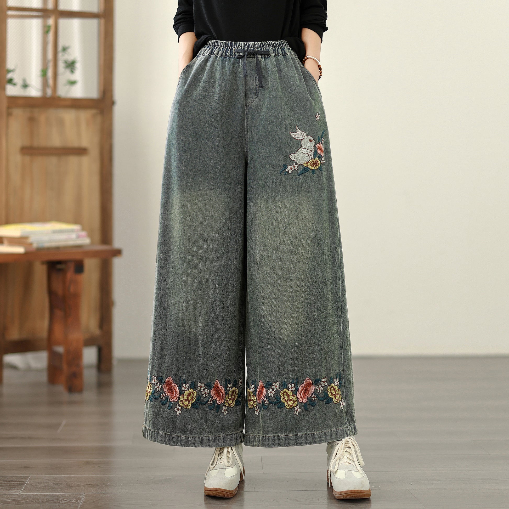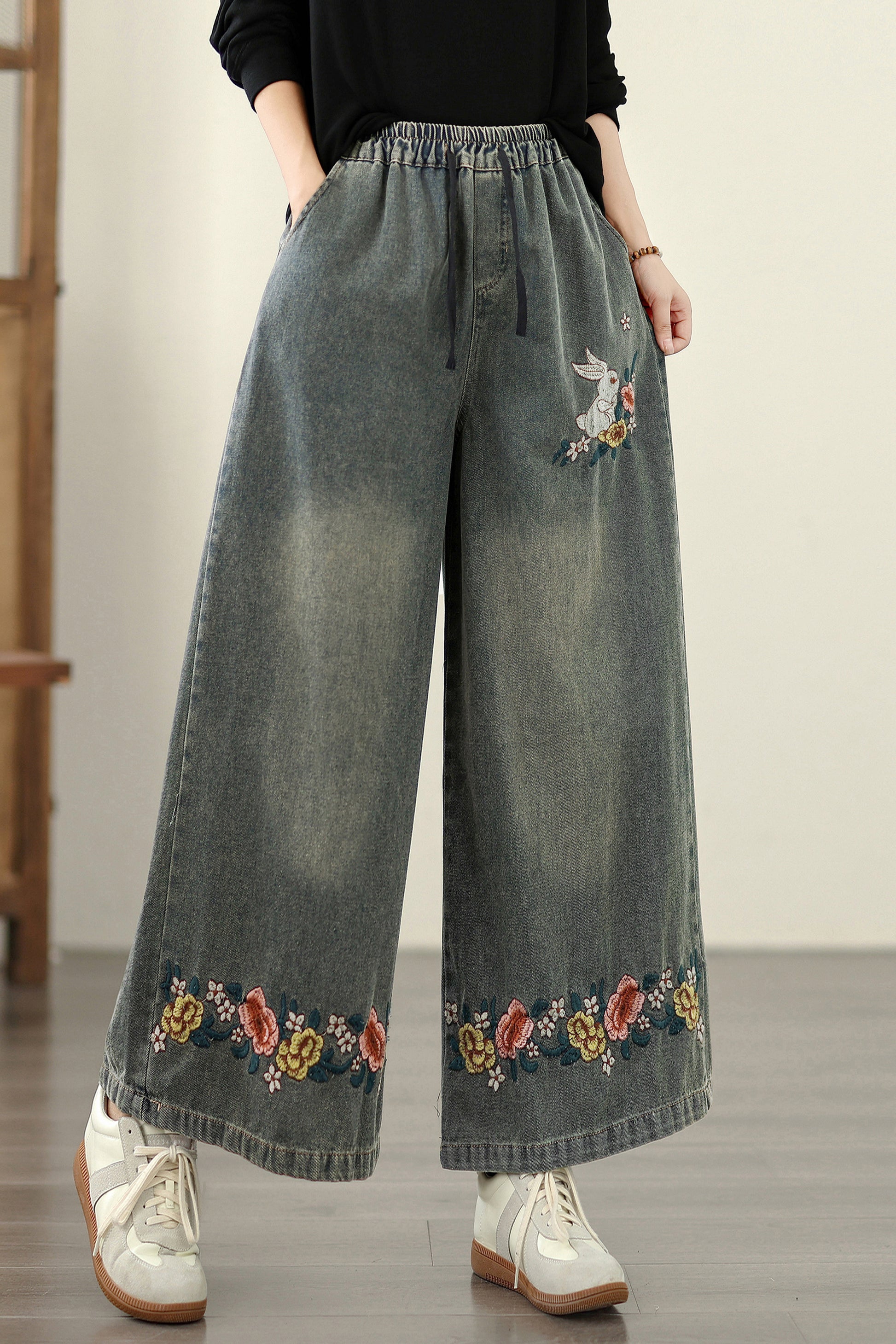 - Features: Fashion baggy jeans,Embroidery pattern,Casual loose,Drawstring elastic waisted,Wide Leg denim, Classic denim, flared jeans, pockets on the front and back. If you love wide-leg baggy jeans, this is definitely the best choice for you.